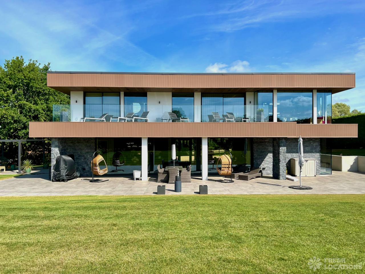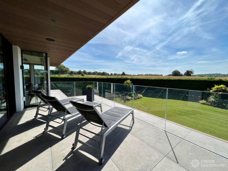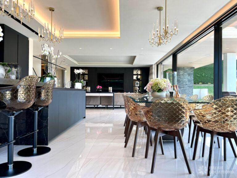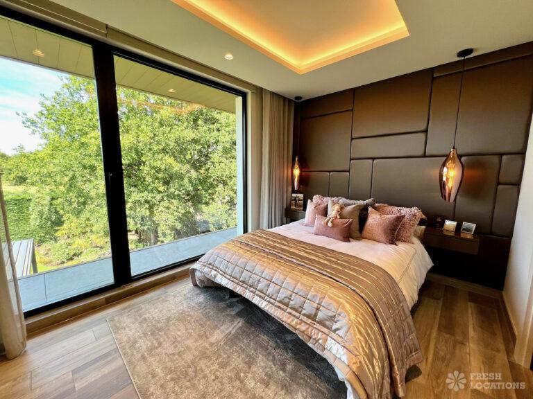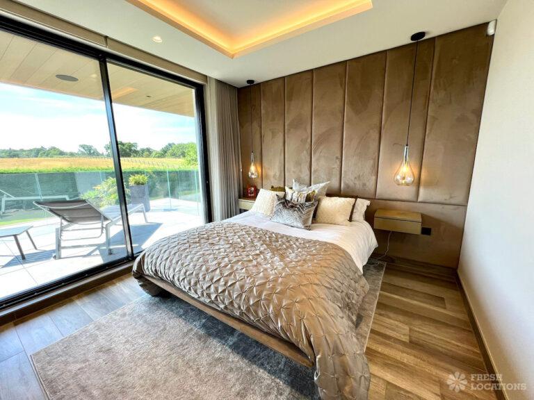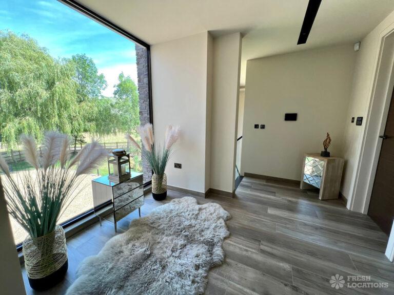 Wood Floors, Balcony, Driveway, Ensuite, Full Height Windows, Garden, Island Kitchen, Large Bedroom, Large Driveway, Large Kitchen, Light Wood Floor, Marble Floor, Open Plan, Staircase, Tiled Floor, Walk In Shower, Walk In WardrobeLarge modern home shoot location in Hertfordshire. Open plan kitchen/dining area/living room with floor to ceiling glass windows. 4 bedrooms all with ensuites and a large upstairs terrace.