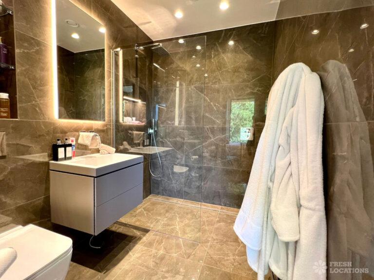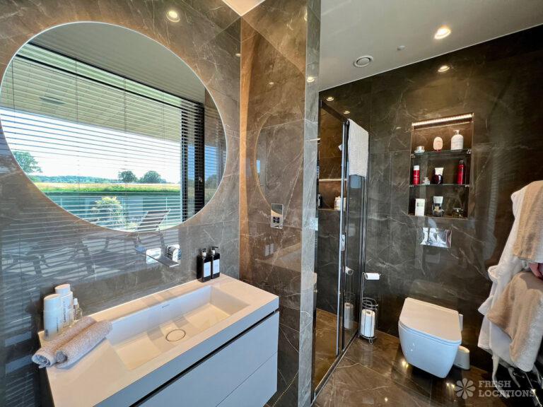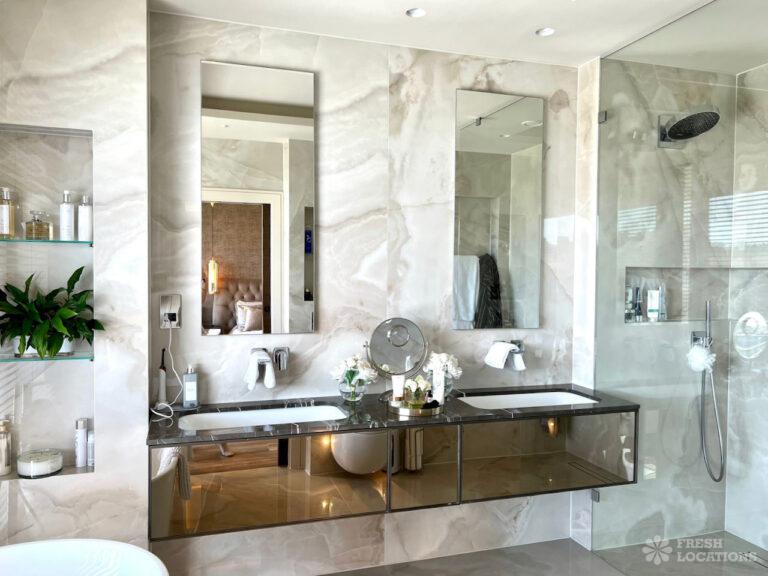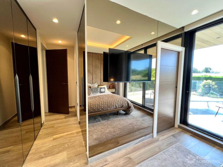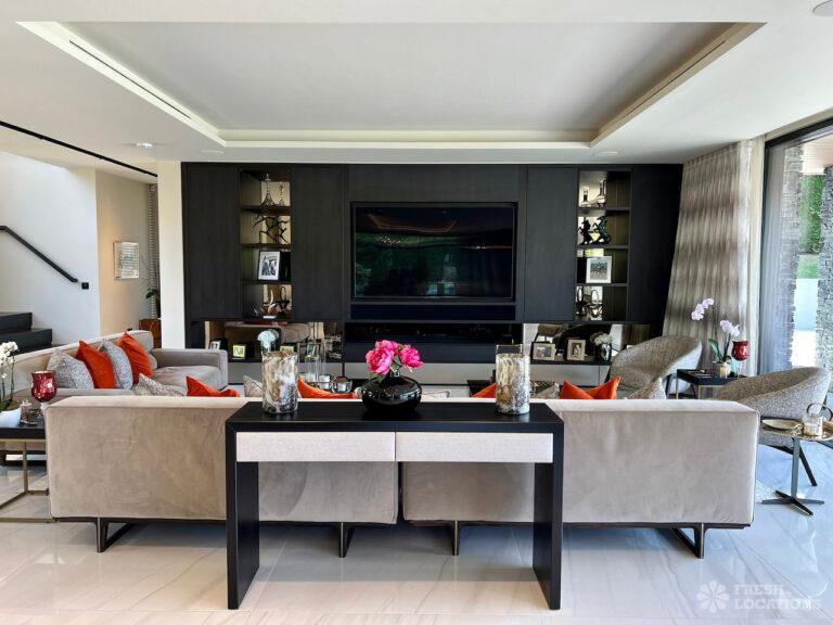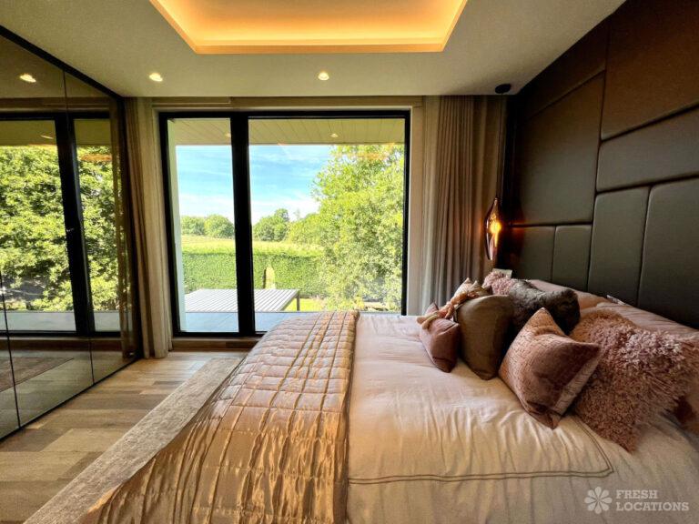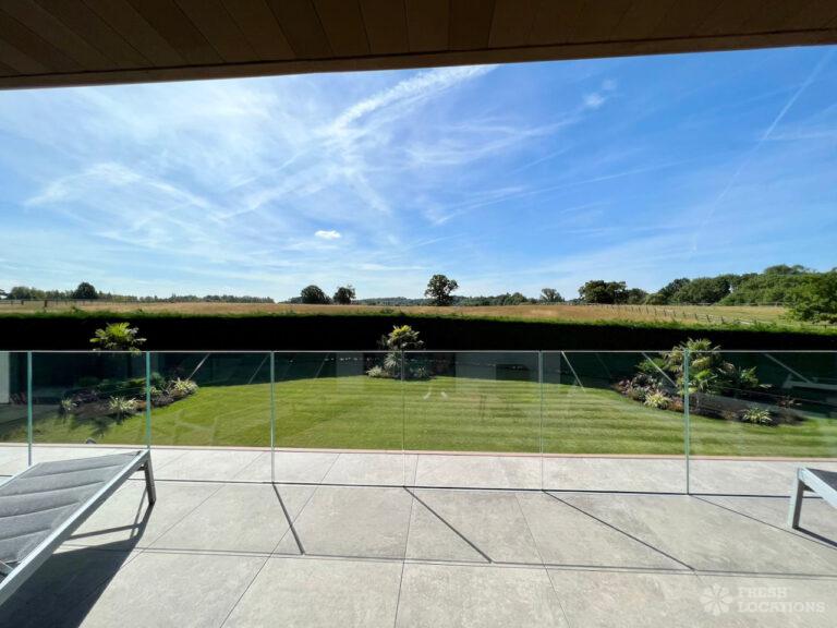 Wood Floors, Balcony, Driveway, Ensuite, Full Height Windows, Garden, Island Kitchen, Large Bedroom, Large Driveway, Large Kitchen, Light Wood Floor, Marble Floor, Open Plan, Staircase, Tiled Floor, Walk In Shower, Walk In WardrobeLarge modern home shoot location in Hertfordshire. Open plan kitchen/dining area/living room with floor to ceiling glass windows. 4 bedrooms all with ensuites and a large upstairs terrace.
