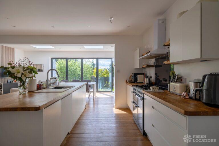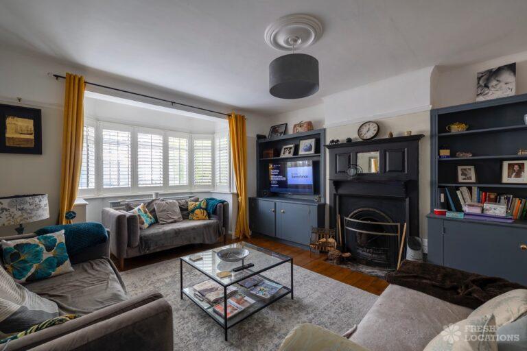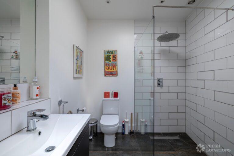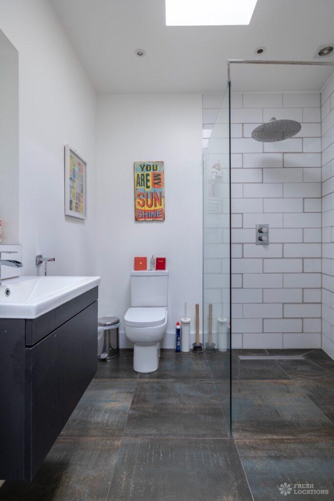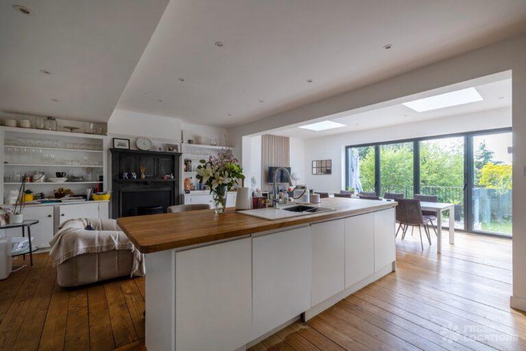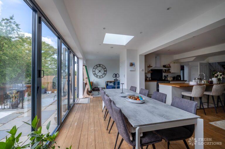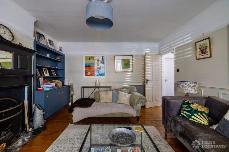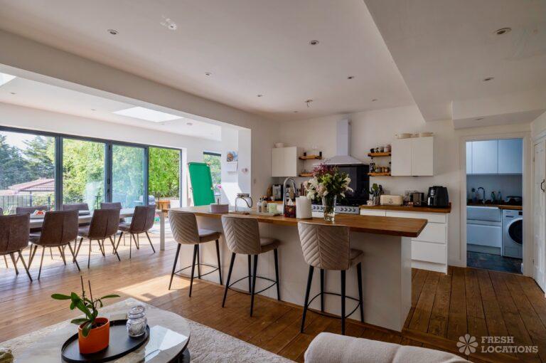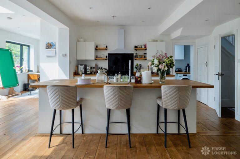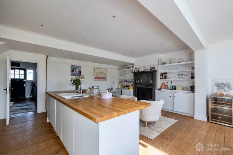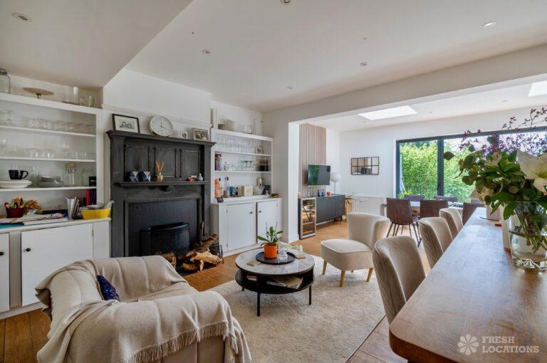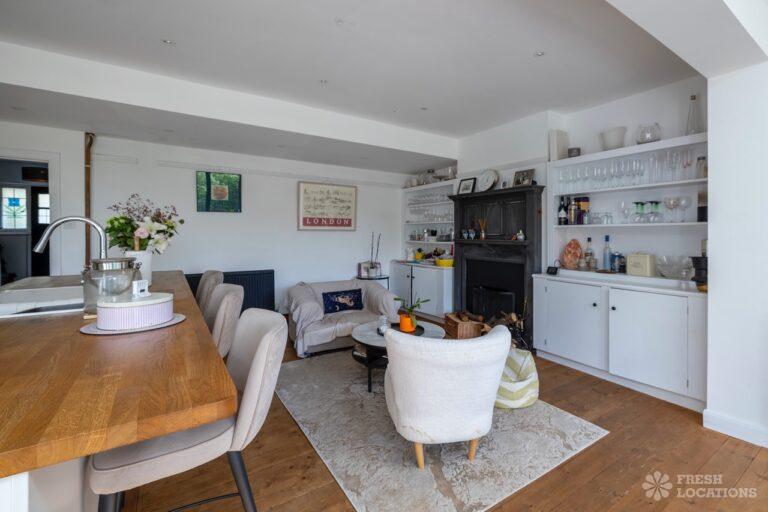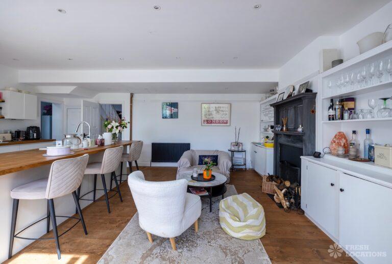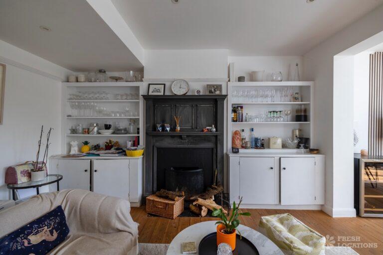 Fireplace, Island Kitchen, Light Wood Floor, Skylights, Staircase, Walk In Shower, Wood FloorsThis charming London family home offers a spacious and tastefully styled setting perfect for lifestyle, editorial, or commercial shoots. The open-plan kitchen and living area is bathed in natural light, featuring warm wood floors, a central island with modern bar stools, and cozy, eclectic furnishings that blend contemporary comfort with a touch of rustic charm. A second lounge showcases a more intimate, moody ambiance with plush grey seating, rich blue cabinetry, and bold yellow drapes, anchored by a striking black fireplace.