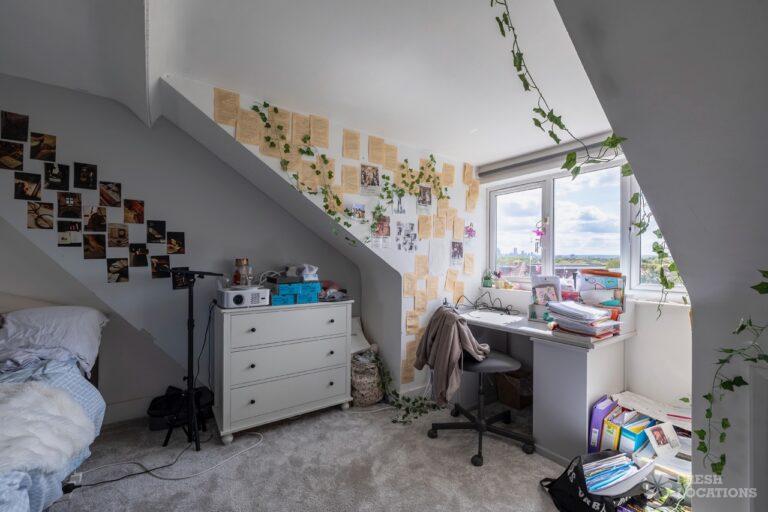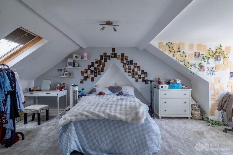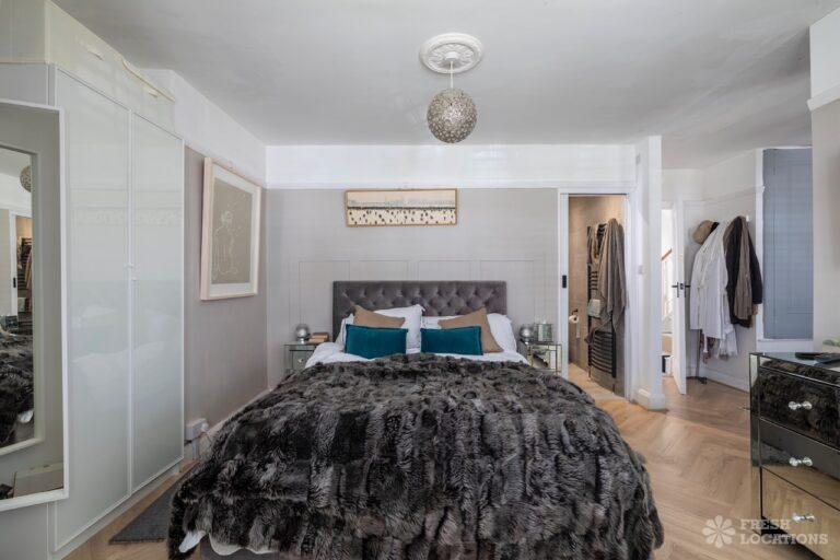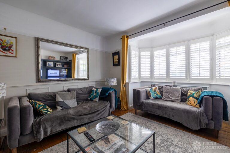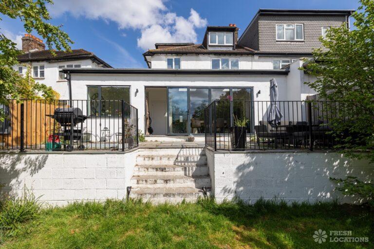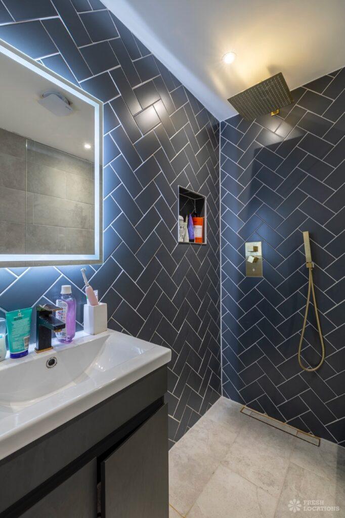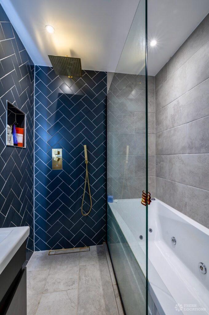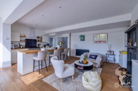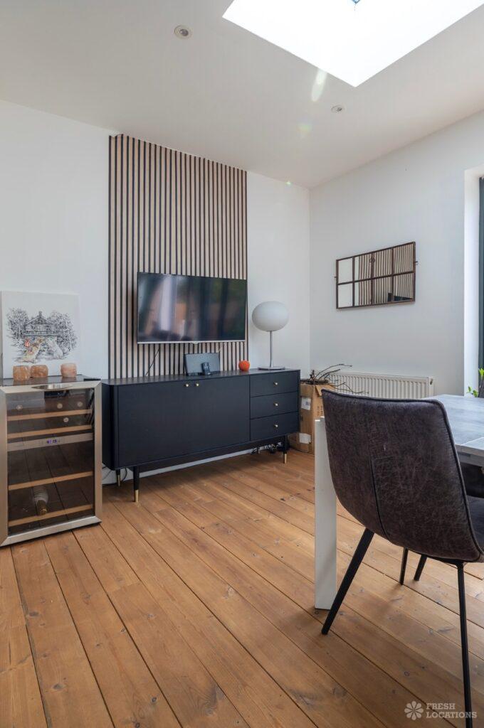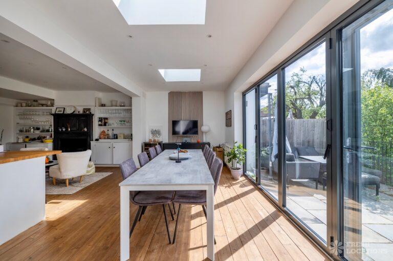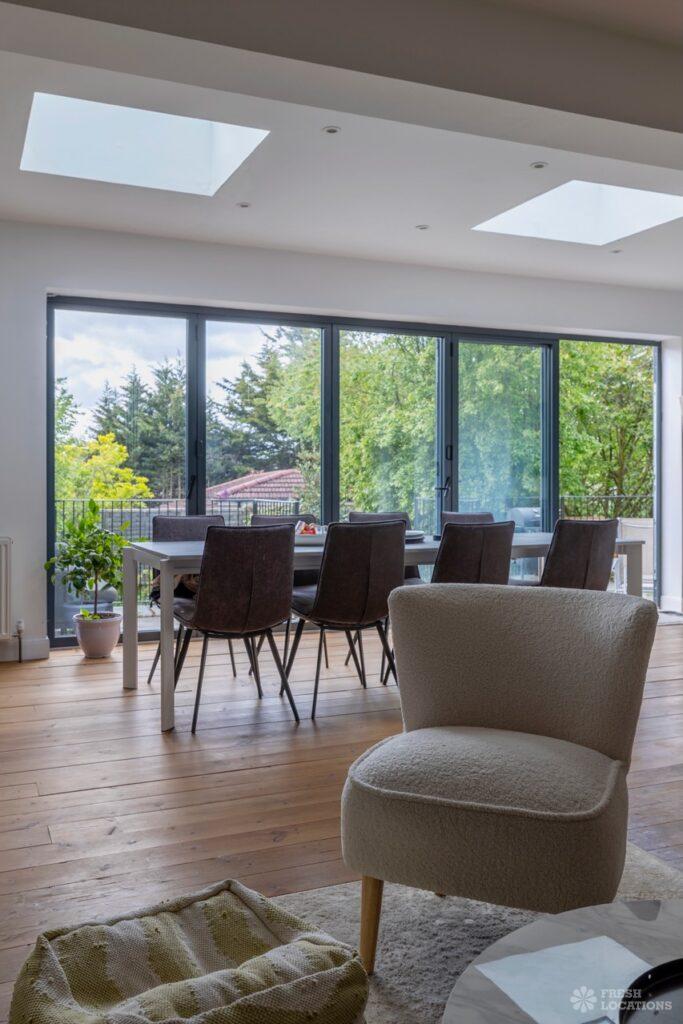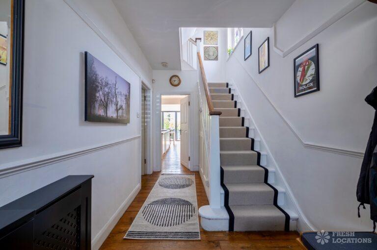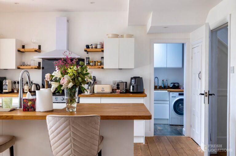 Fireplace, Island Kitchen, Light Wood Floor, Skylights, Staircase, Walk In Shower, Wood FloorsThis charming London family home offers a spacious and tastefully styled setting perfect for lifestyle, editorial, or commercial shoots. The open-plan kitchen and living area is bathed in natural light, featuring warm wood floors, a central island with modern bar stools, and cozy, eclectic furnishings that blend contemporary comfort with a touch of rustic charm. A second lounge showcases a more intimate, moody ambiance with plush grey seating, rich blue cabinetry, and bold yellow drapes, anchored by a striking black fireplace.