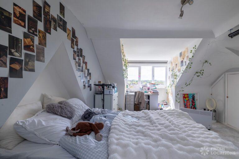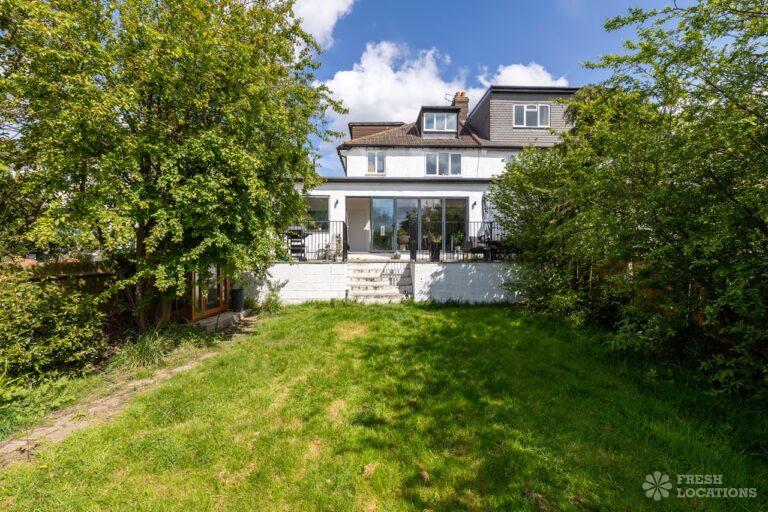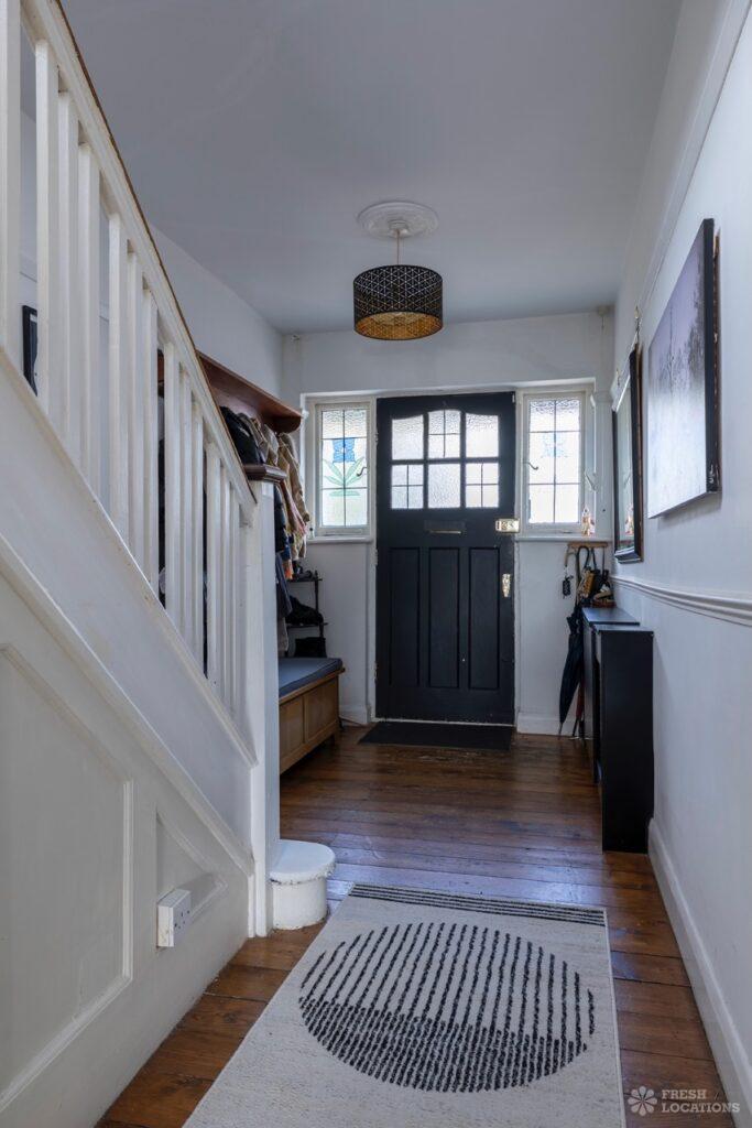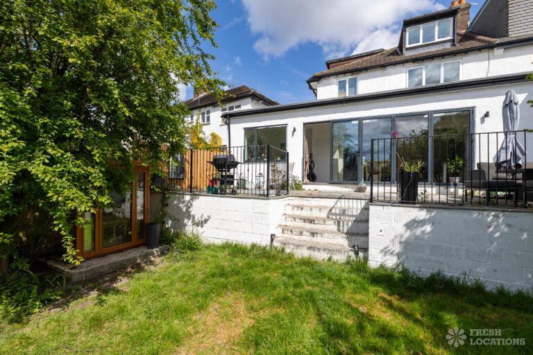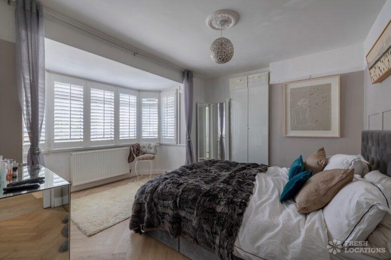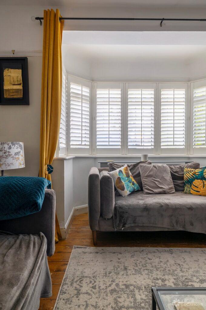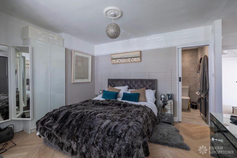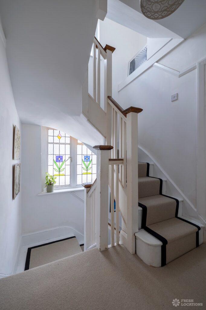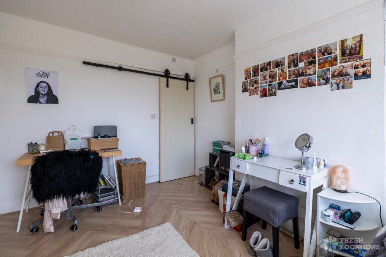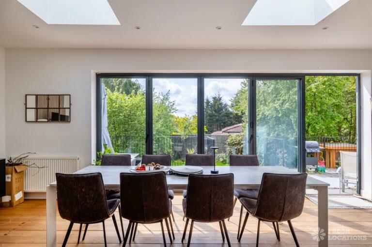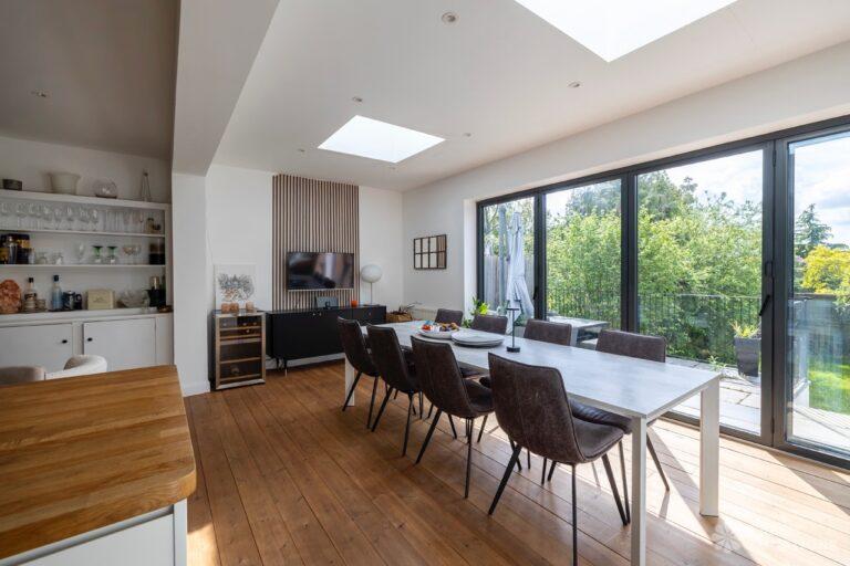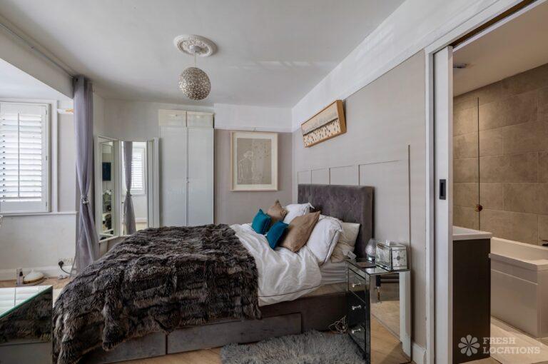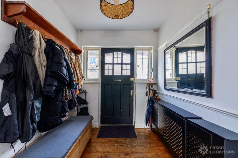 Fireplace, Island Kitchen, Light Wood Floor, Skylights, Staircase, Walk In Shower, Wood FloorsThis charming London family home offers a spacious and tastefully styled setting perfect for lifestyle, editorial, or commercial shoots. The open-plan kitchen and living area is bathed in natural light, featuring warm wood floors, a central island with modern bar stools, and cozy, eclectic furnishings that blend contemporary comfort with a touch of rustic charm. A second lounge showcases a more intimate, moody ambiance with plush grey seating, rich blue cabinetry, and bold yellow drapes, anchored by a striking black fireplace.