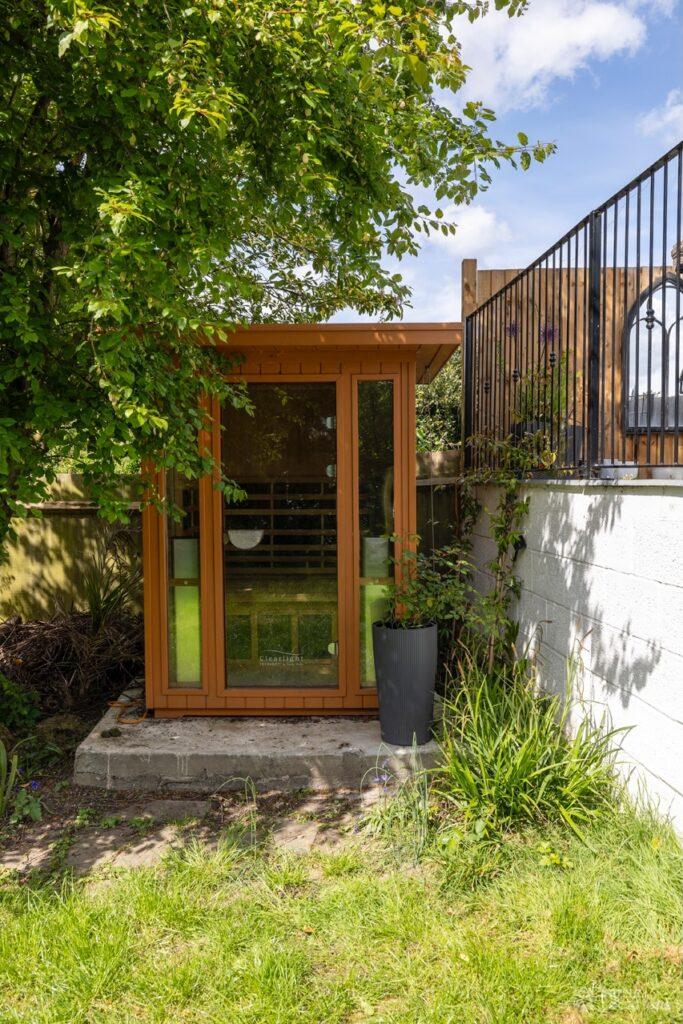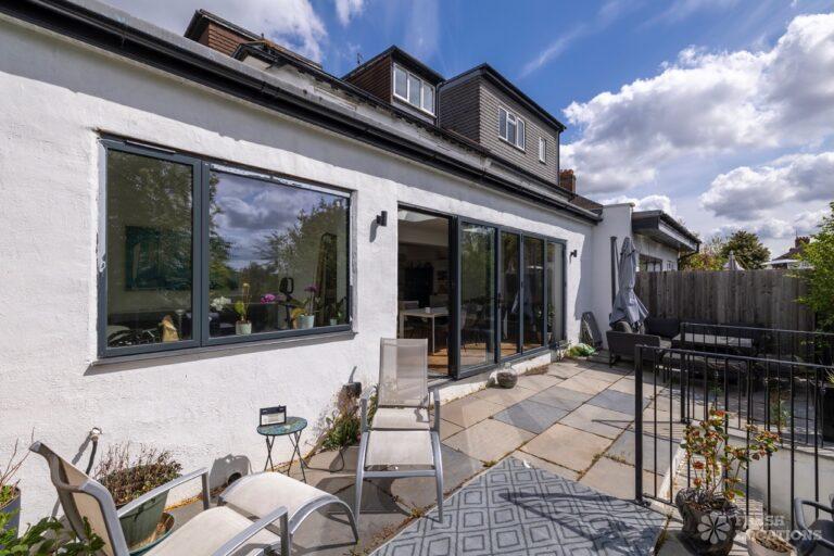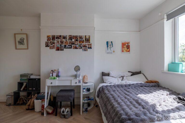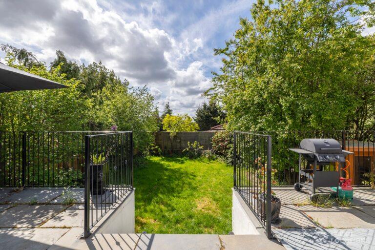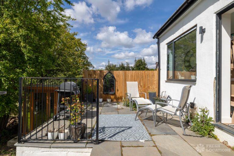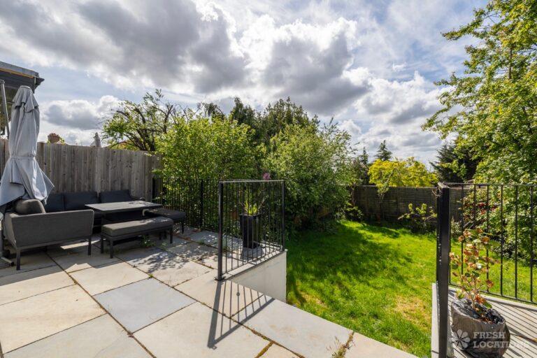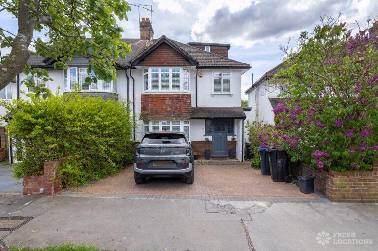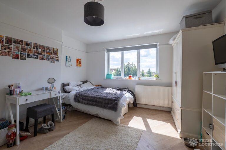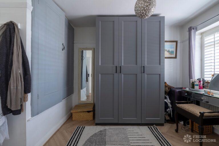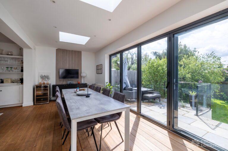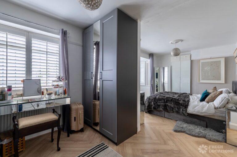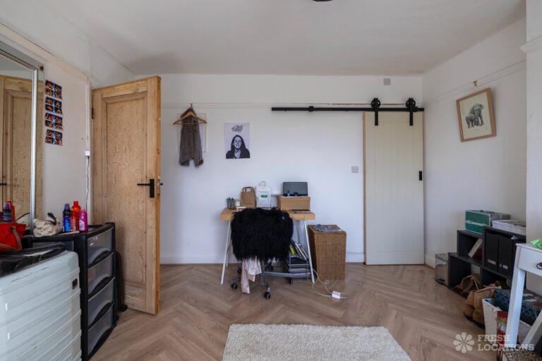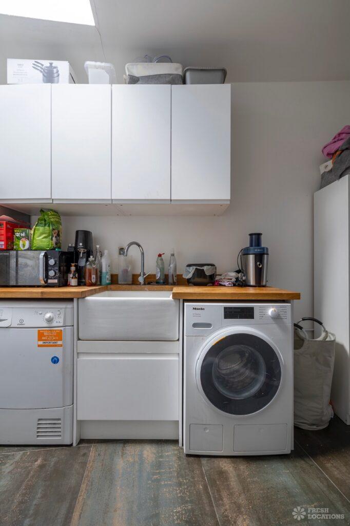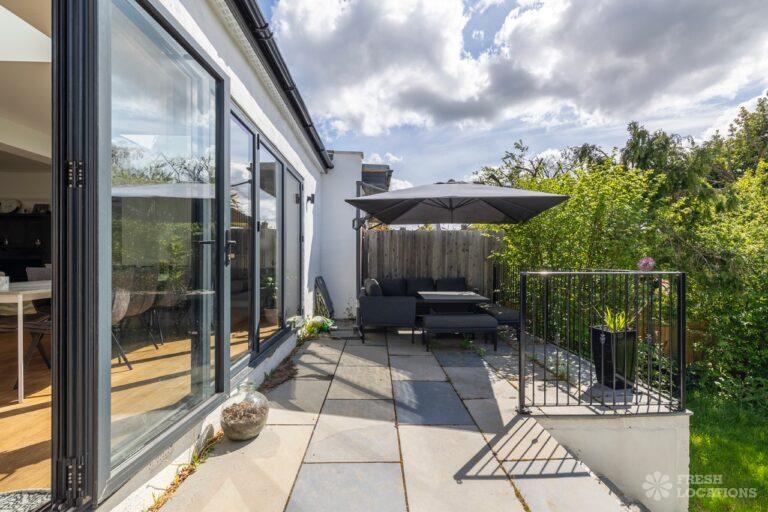 Fireplace, Island Kitchen, Light Wood Floor, Skylights, Staircase, Walk In Shower, Wood FloorsThis charming London family home offers a spacious and tastefully styled setting perfect for lifestyle, editorial, or commercial shoots. The open-plan kitchen and living area is bathed in natural light, featuring warm wood floors, a central island with modern bar stools, and cozy, eclectic furnishings that blend contemporary comfort with a touch of rustic charm. A second lounge showcases a more intimate, moody ambiance with plush grey seating, rich blue cabinetry, and bold yellow drapes, anchored by a striking black fireplace.