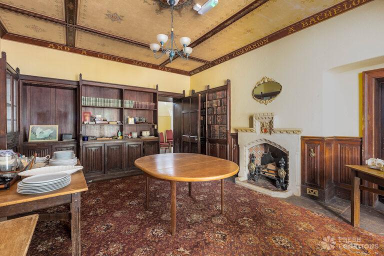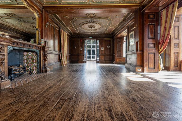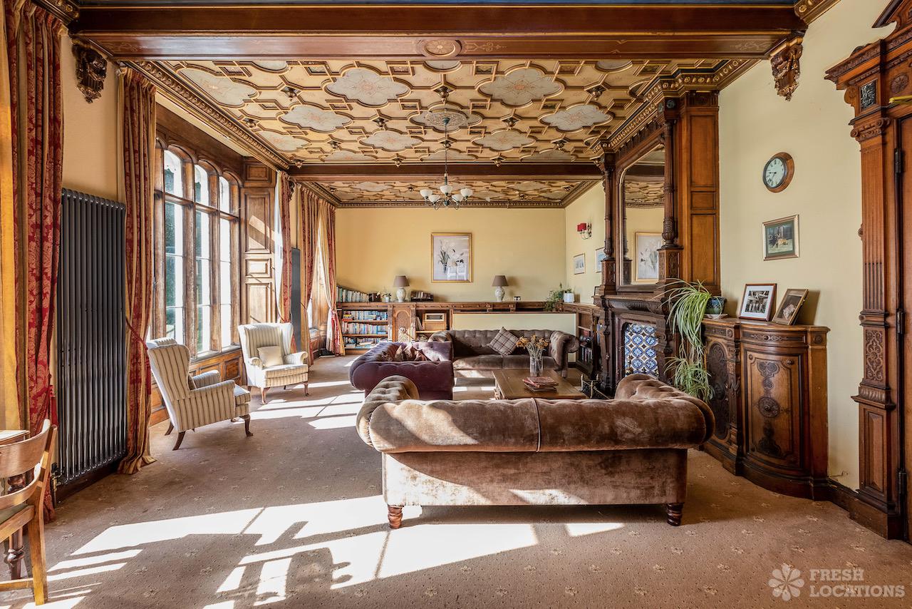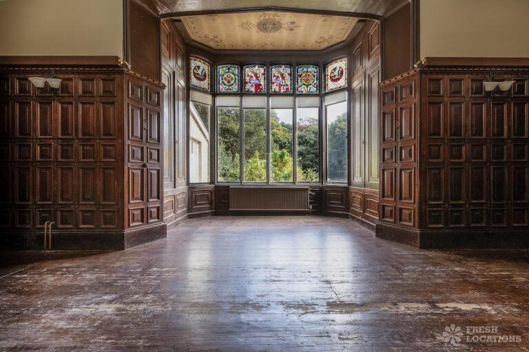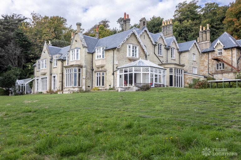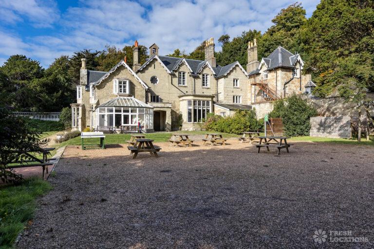 Wood Floors, Bay Window, Courtyard, Dark Wood Floor, Driveway, Fireplace, Garden, Panelling, StaircaseGrade 2 listed mansion shoot location on the Isle of Wight. This Tudor-Gothic Mansion features a wood panelled Great Hall, a drawing room, fireplaces, a conservatory and a gorgeous main staircase. The property is set in 10 acres of grounds with sea views.