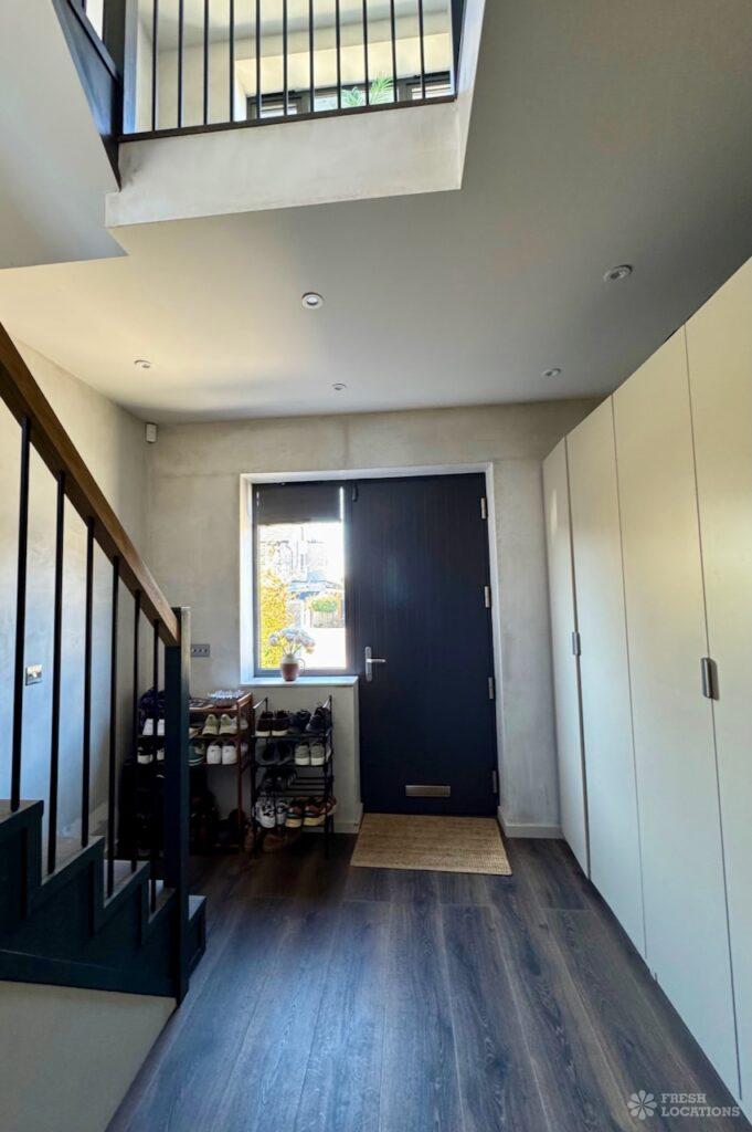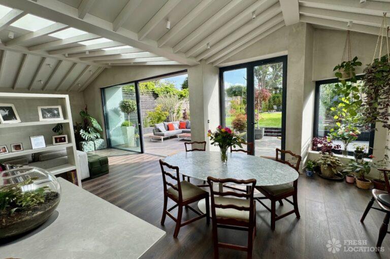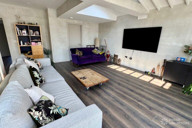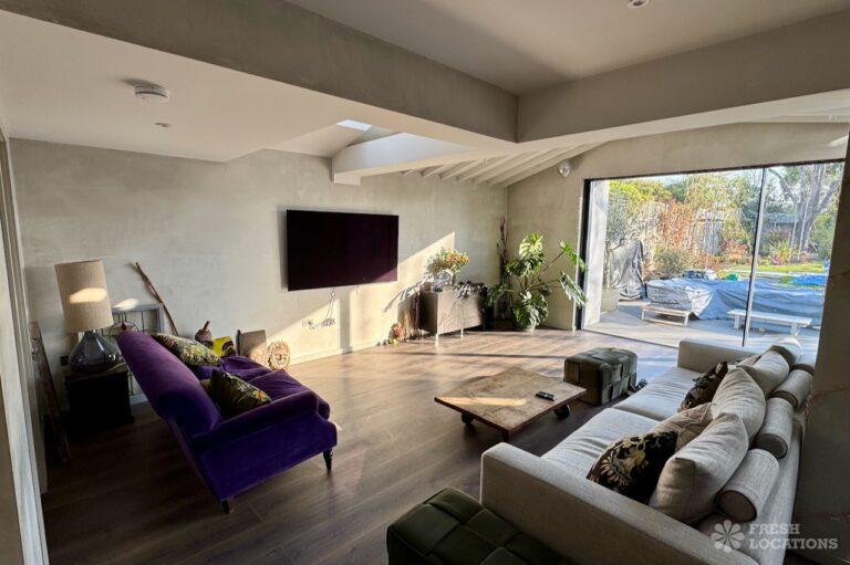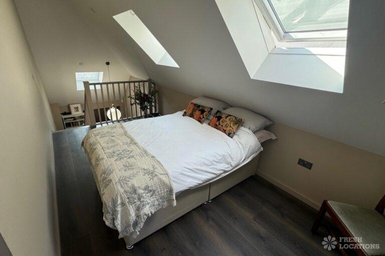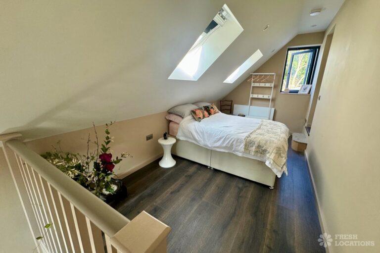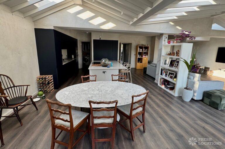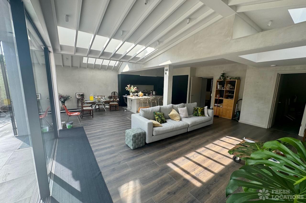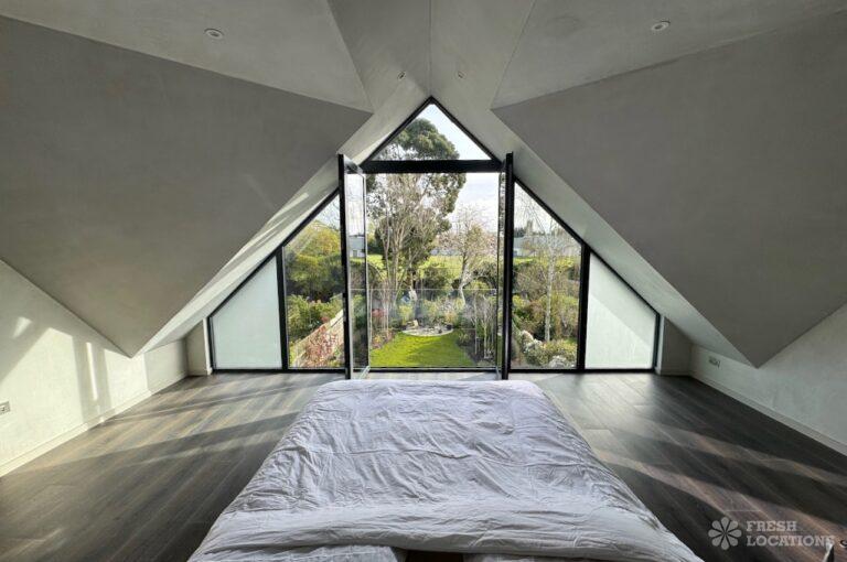 This stunning modern home offers a unique and versatile shoot location with an abundance of natural light, dramatic architecture, and stylish interiors. Featuring a spacious open-plan living area with vaulted skylight ceilings, sleek wooden flooring, and minimalist concrete finishes, the space exudes contemporary elegance. A cozy secondary lounge under a white staircase adds character, while the loft-style bedroom boasts striking geometric windows overlooking a lush garden.