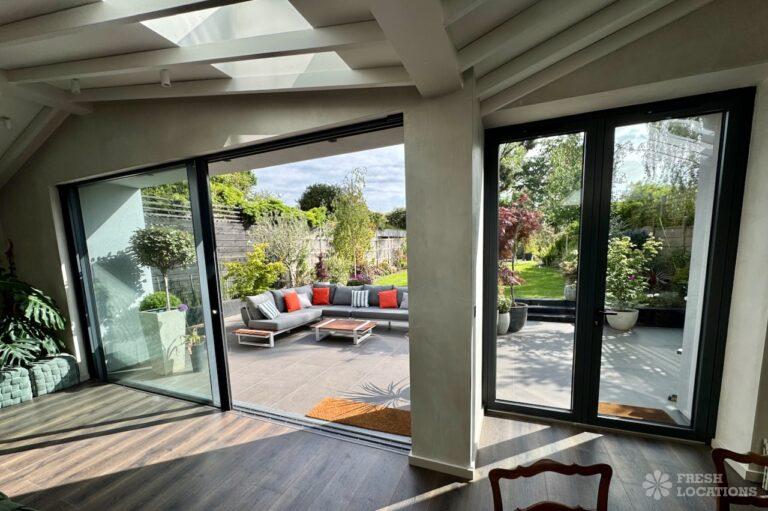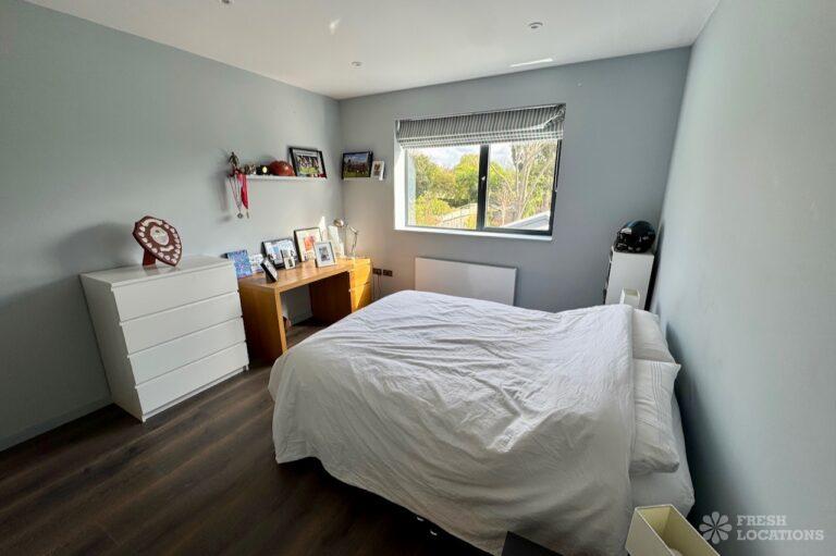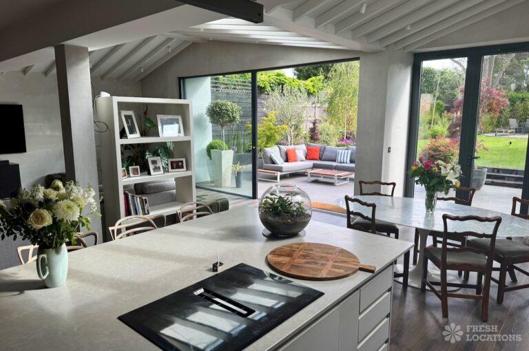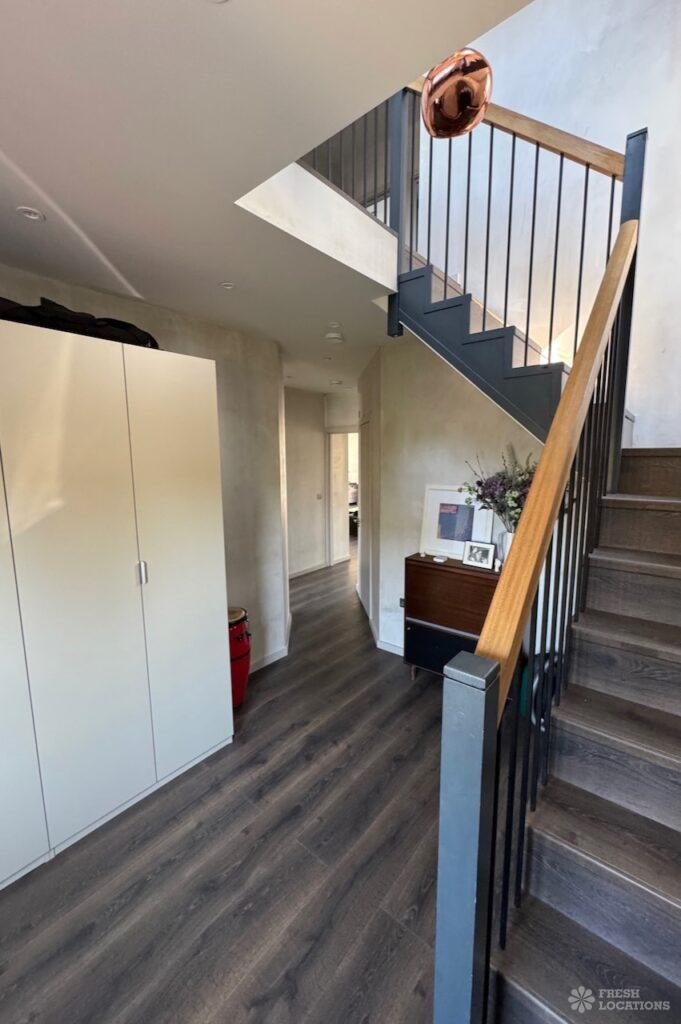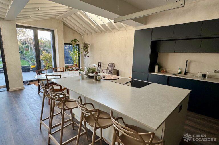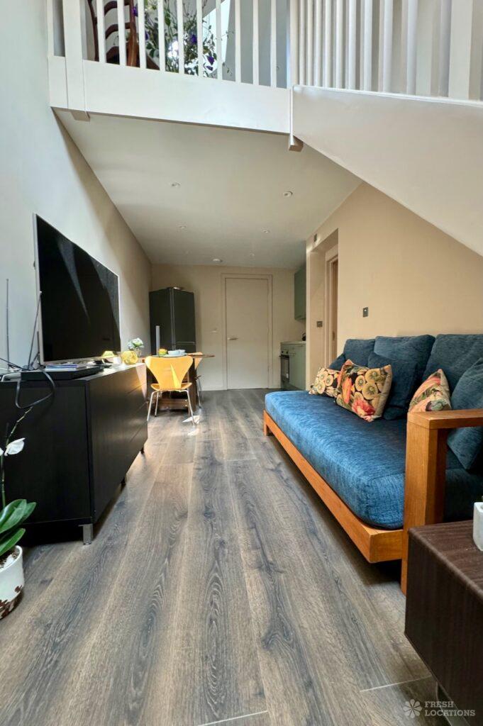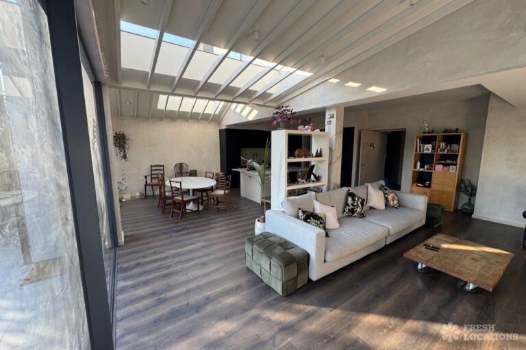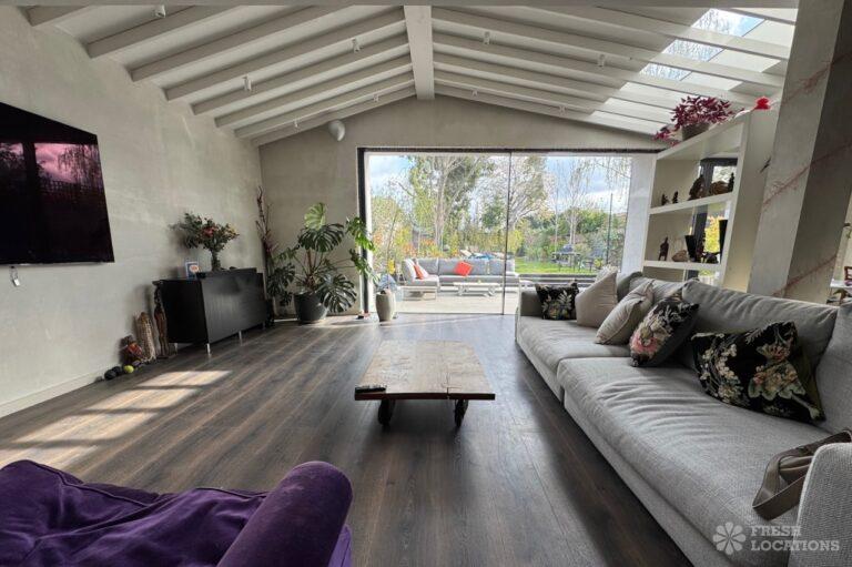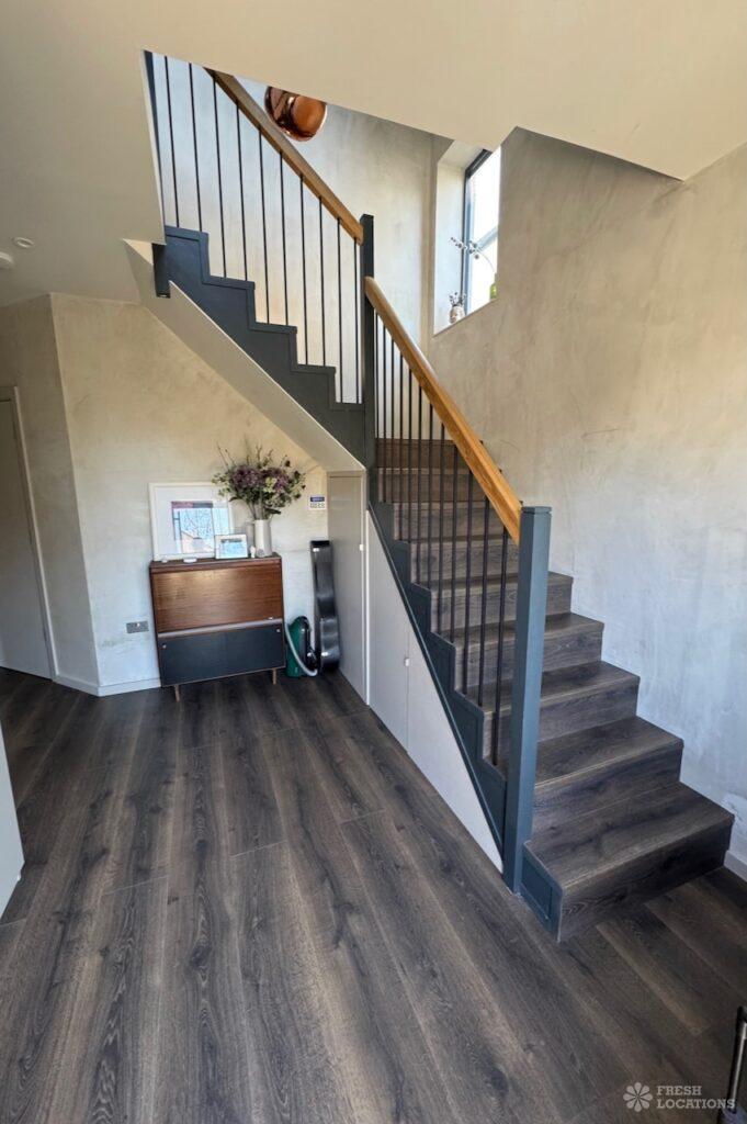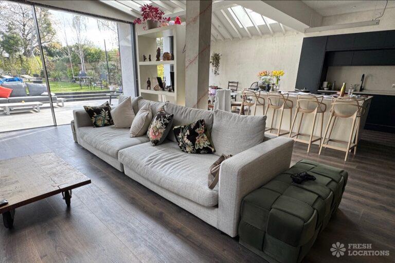This stunning modern home offers a unique and versatile shoot location with an abundance of natural light, dramatic architecture, and stylish interiors. Featuring a spacious open-plan living area with vaulted skylight ceilings, sleek wooden flooring, and minimalist concrete finishes, the space exudes contemporary elegance. A cozy secondary lounge under a white staircase adds character, while the loft-style bedroom boasts striking geometric windows overlooking a lush garden.