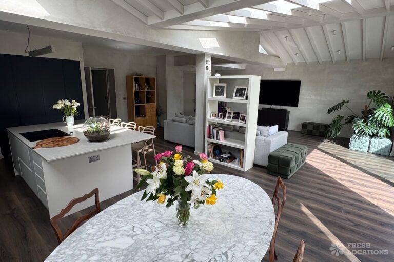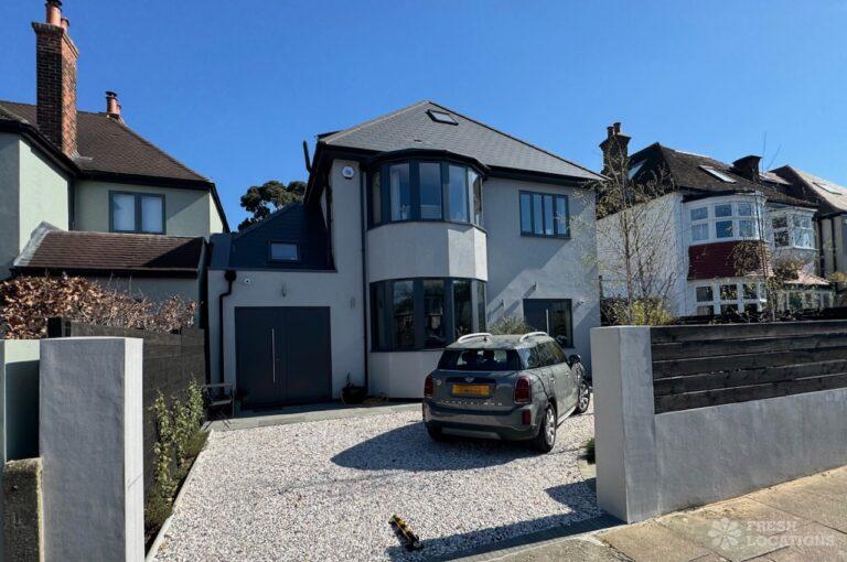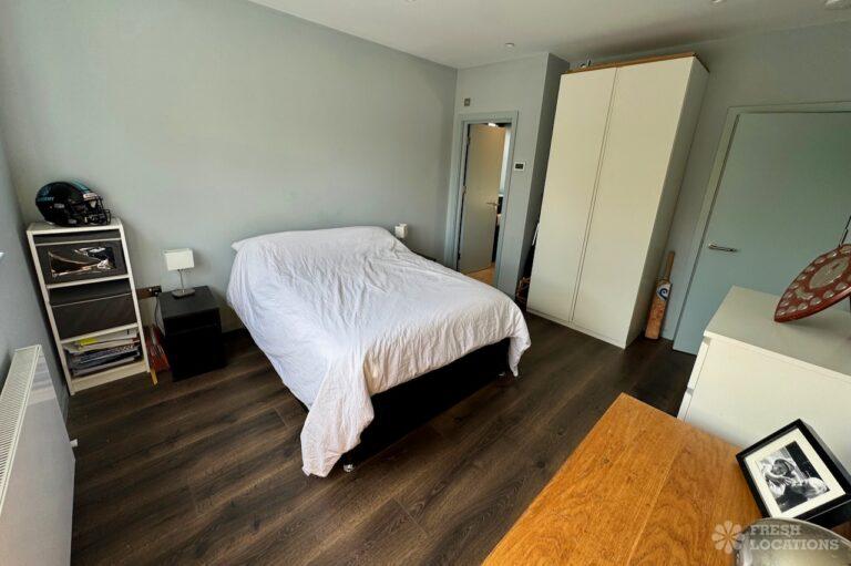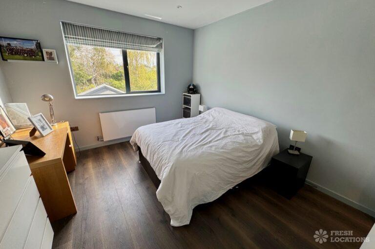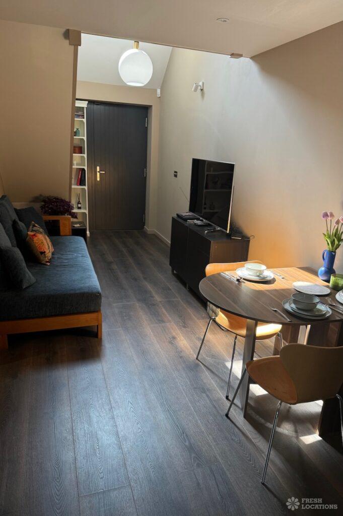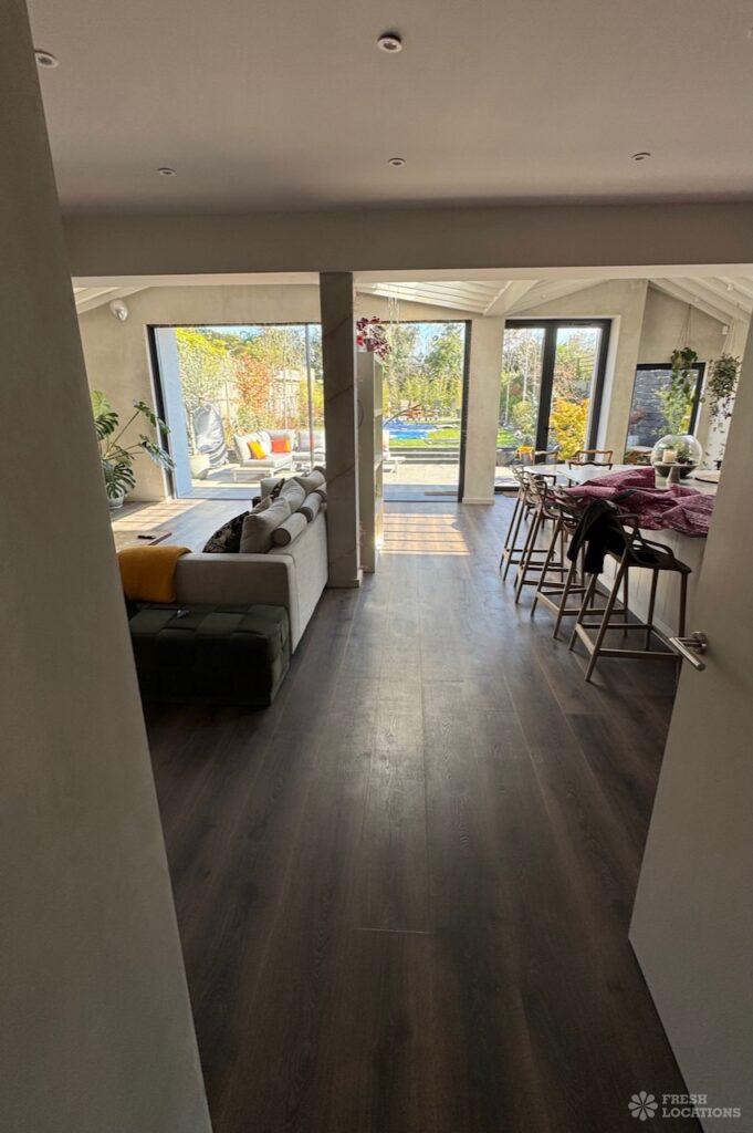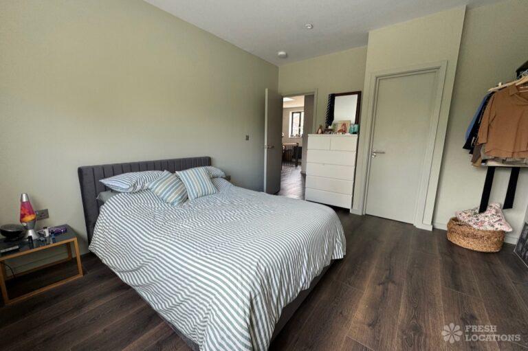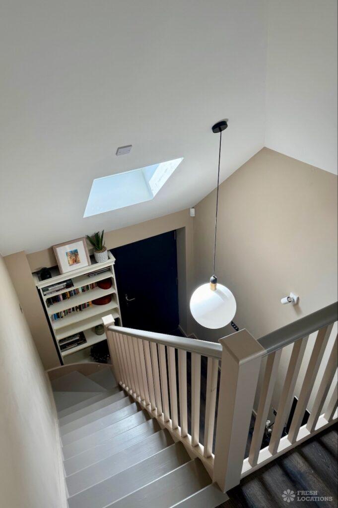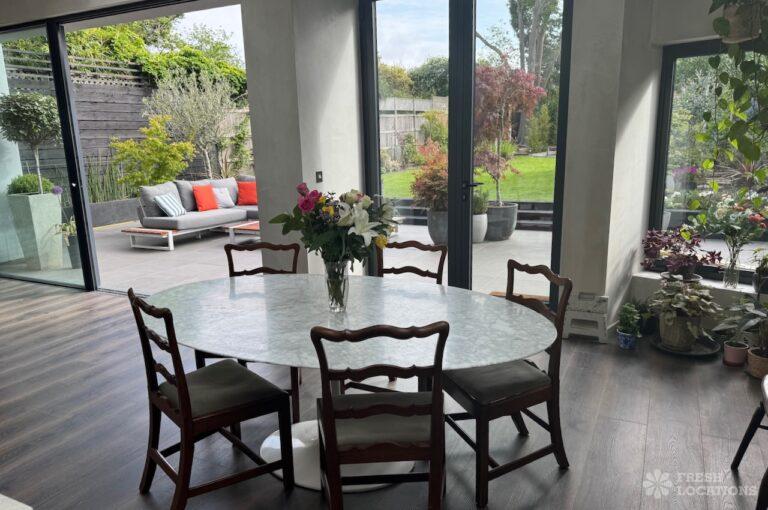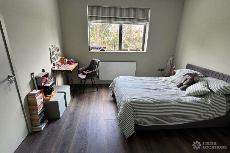 This stunning modern home offers a unique and versatile shoot location with an abundance of natural light, dramatic architecture, and stylish interiors. Featuring a spacious open-plan living area with vaulted skylight ceilings, sleek wooden flooring, and minimalist concrete finishes, the space exudes contemporary elegance. A cozy secondary lounge under a white staircase adds character, while the loft-style bedroom boasts striking geometric windows overlooking a lush garden.