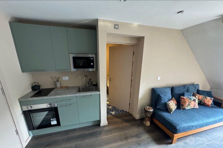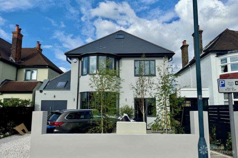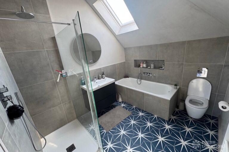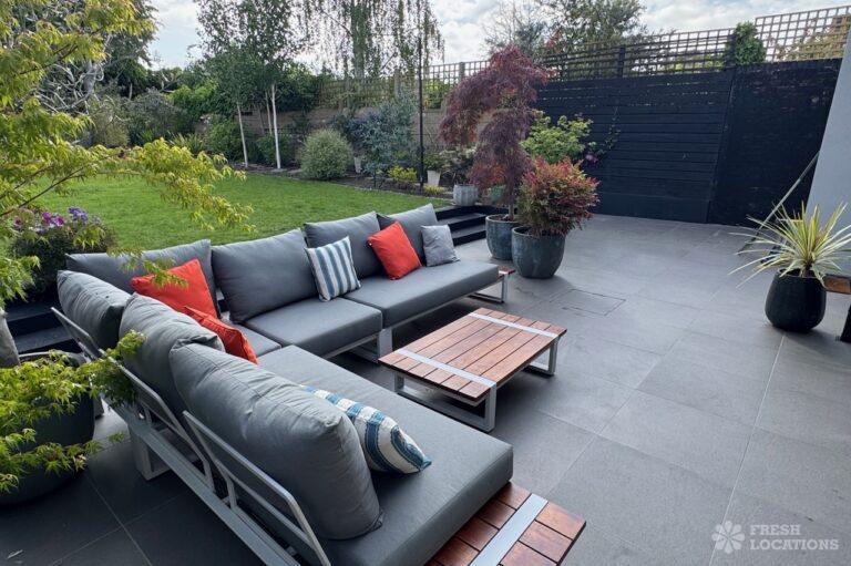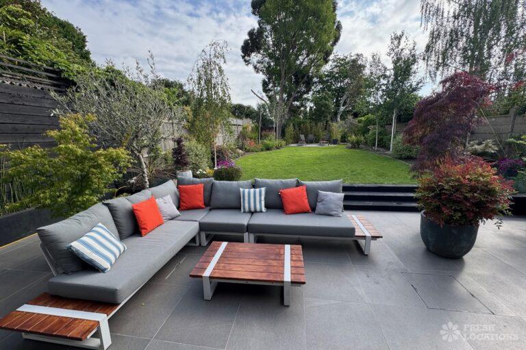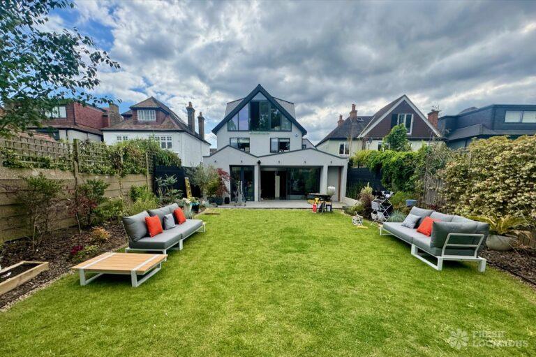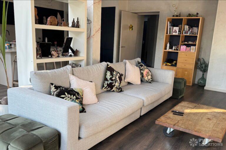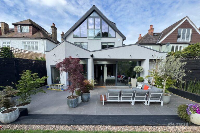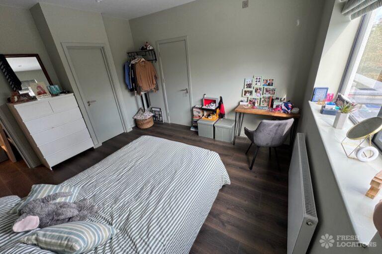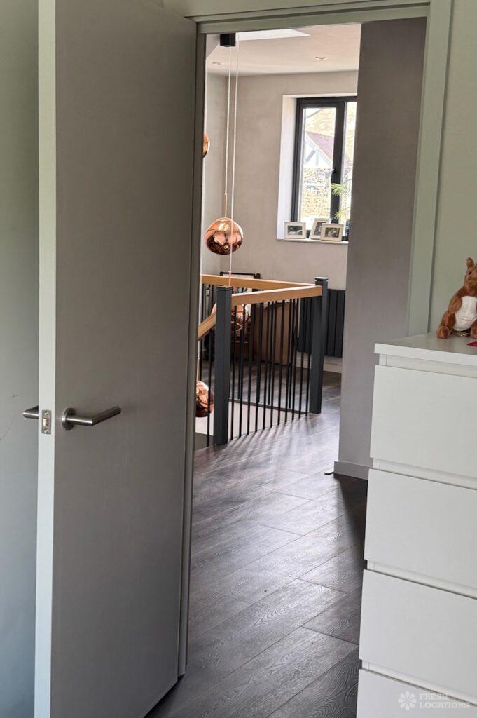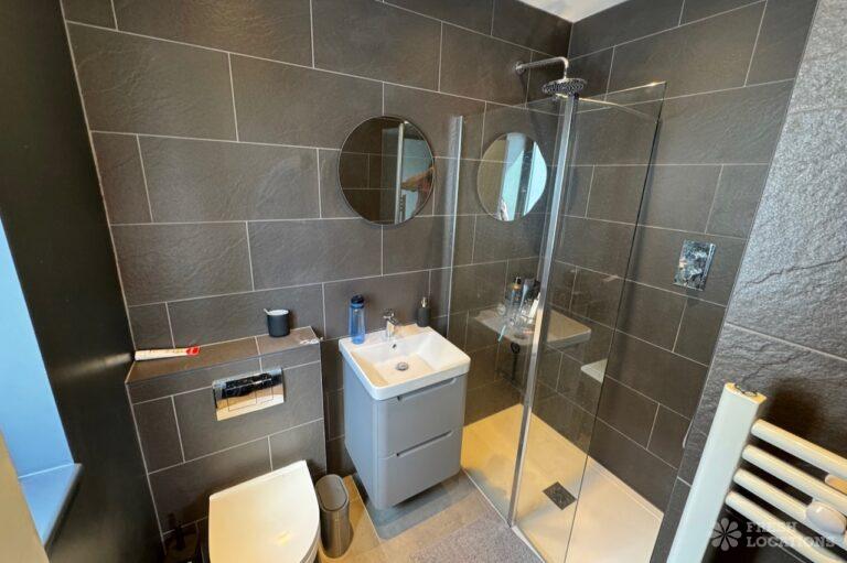 This stunning modern home offers a unique and versatile shoot location with an abundance of natural light, dramatic architecture, and stylish interiors. Featuring a spacious open-plan living area with vaulted skylight ceilings, sleek wooden flooring, and minimalist concrete finishes, the space exudes contemporary elegance. A cozy secondary lounge under a white staircase adds character, while the loft-style bedroom boasts striking geometric windows overlooking a lush garden.