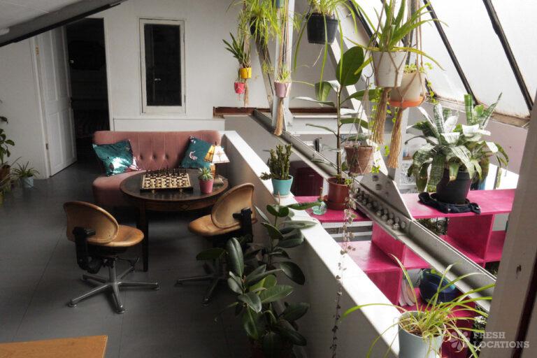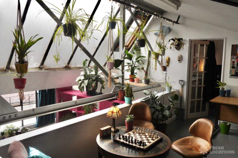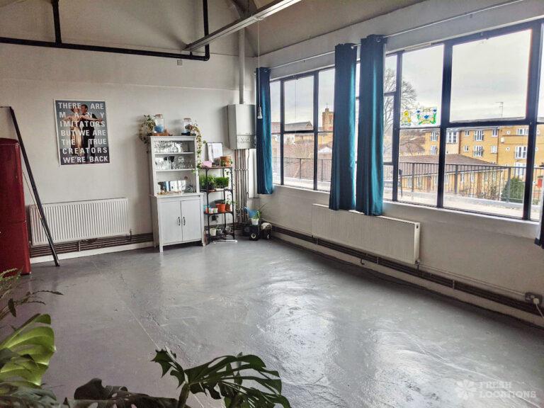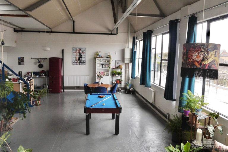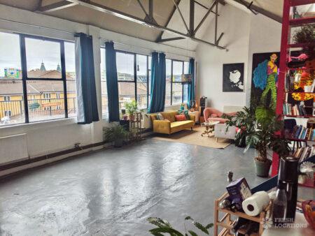Large open warehouse unit in the heart of Hackney Wick on the top floor of a complex. Featuring open plan kitchen/diner/living area with lots of natural light and high ceilings. London Borough of Hackney.