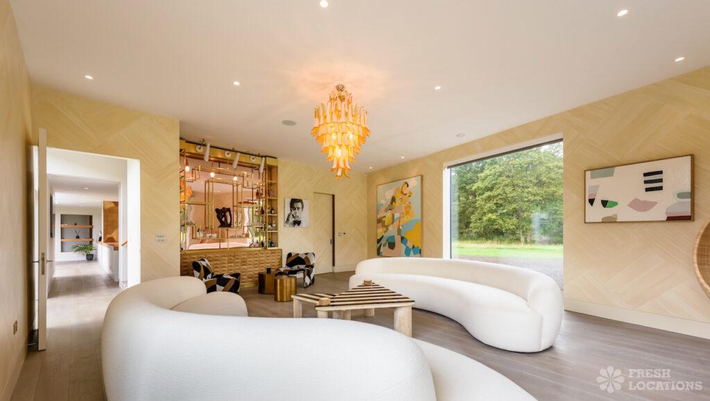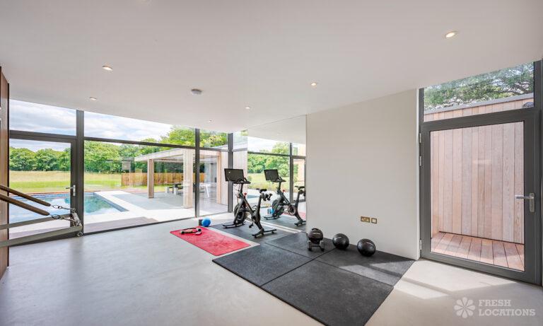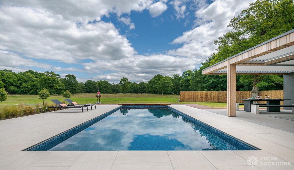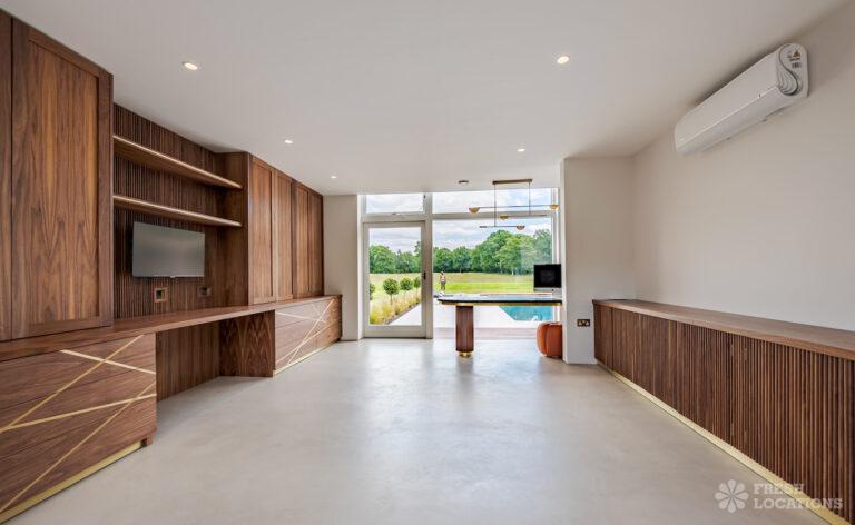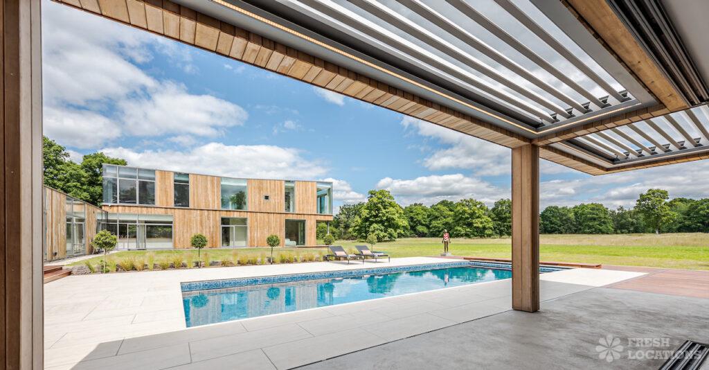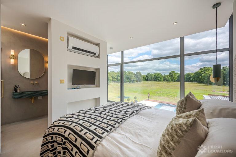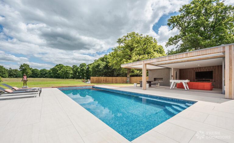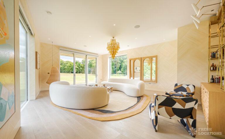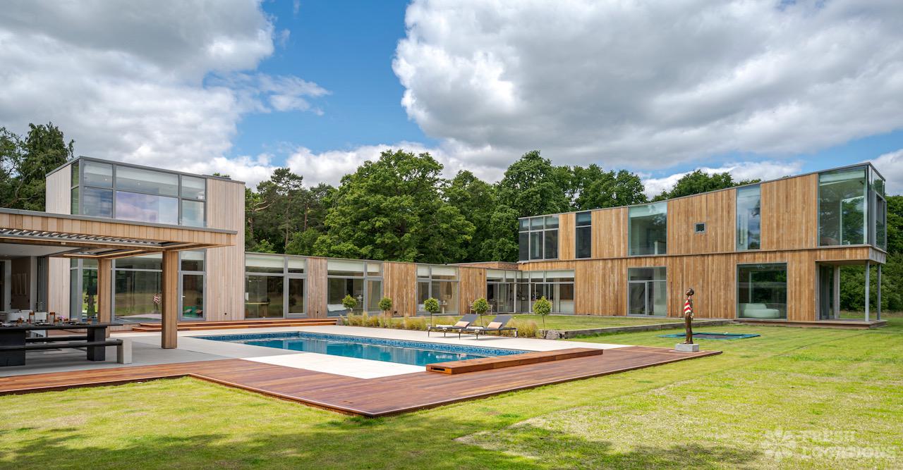 Wood Floors, Decked Terrace, Driveway, Ensuite, Exposed Brick, Fireplace, Front Garden, Full Height Windows, Garden, Home Gym, Island Cooker, Island Kitchen, Large Bathroom, Large Bedroom, Large Driveway, Large Kitchen, Light Wood Floor, Open Plan, Staircase, Swimming Pool, Tiled Floor, Walk In Shower, Walk In Wardrobe, White KitchenModern Californian style home in Surrey. This shoot location is set in 14 acres of land, featuring an outdoor swimming pool, pond and a large garden. Five bedrooms all with ensuites, full height windows throughout and an open plan kitchen/diner. There is also a large dining room and a formal drawing room with a bar.