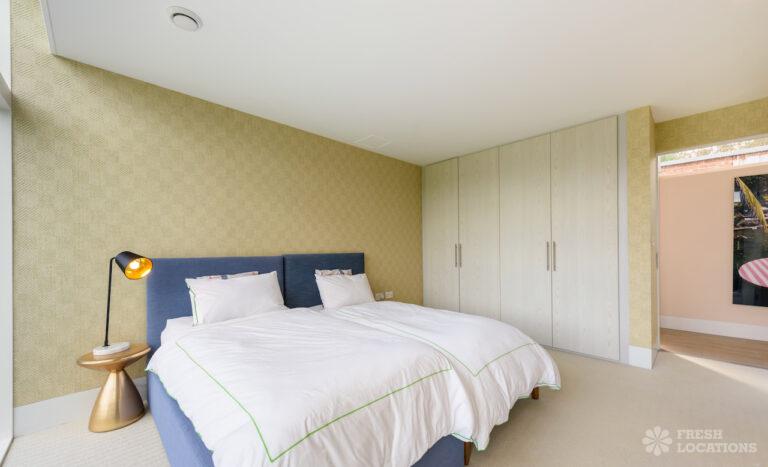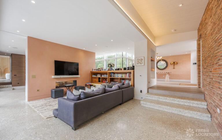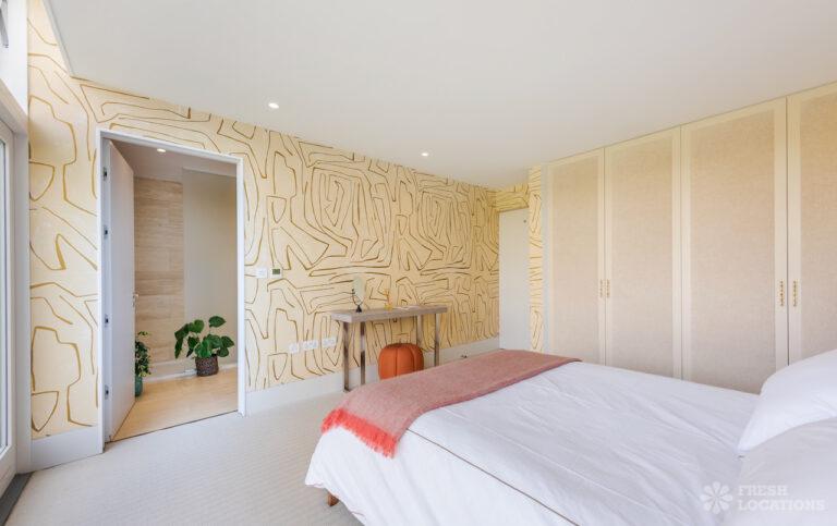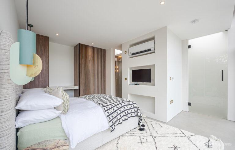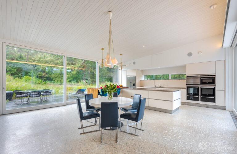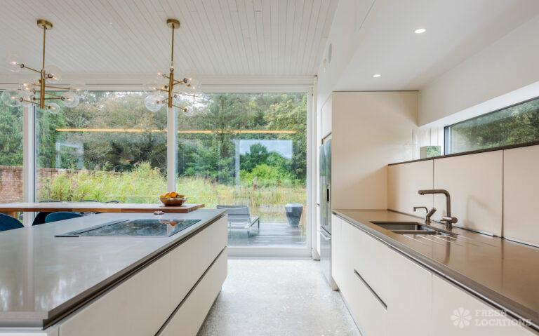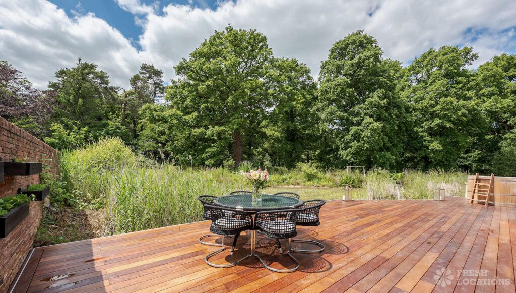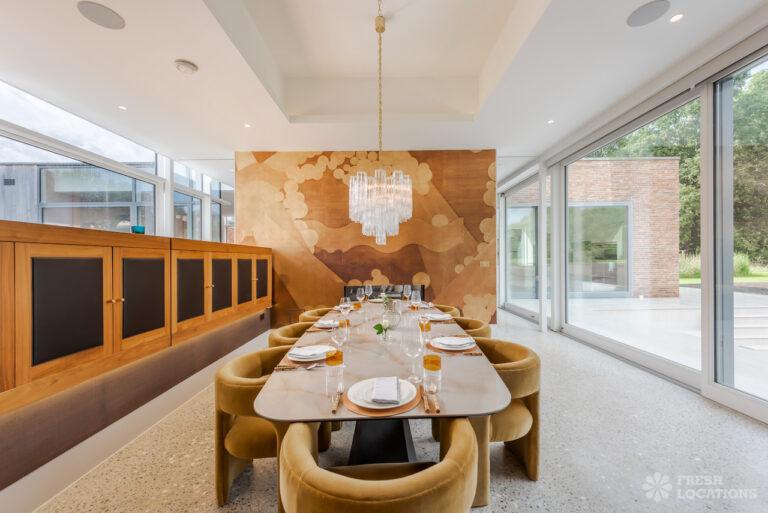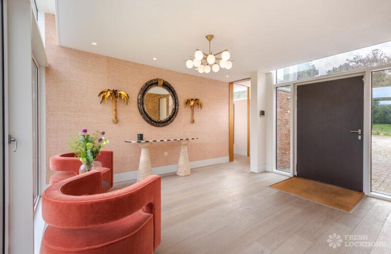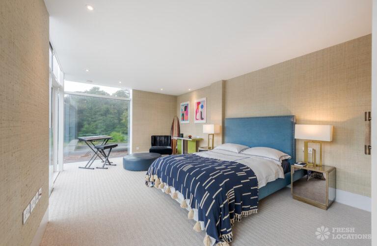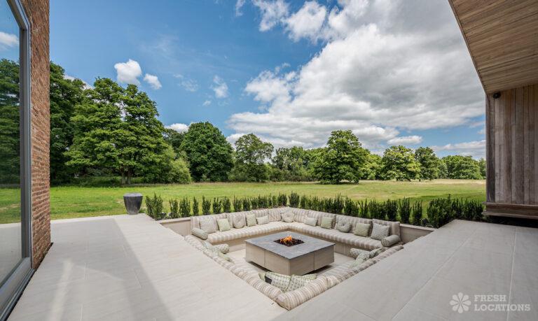 Wood Floors, Decked Terrace, Driveway, Ensuite, Exposed Brick, Fireplace, Front Garden, Full Height Windows, Garden, Home Gym, Island Cooker, Island Kitchen, Large Bathroom, Large Bedroom, Large Driveway, Large Kitchen, Light Wood Floor, Open Plan, Staircase, Swimming Pool, Tiled Floor, Walk In Shower, Walk In Wardrobe, White KitchenModern Californian style home in Surrey. This shoot location is set in 14 acres of land, featuring an outdoor swimming pool, pond and a large garden. Five bedrooms all with ensuites, full height windows throughout and an open plan kitchen/diner. There is also a large dining room and a formal drawing room with a bar.