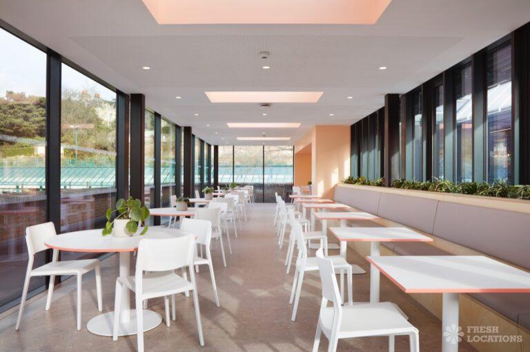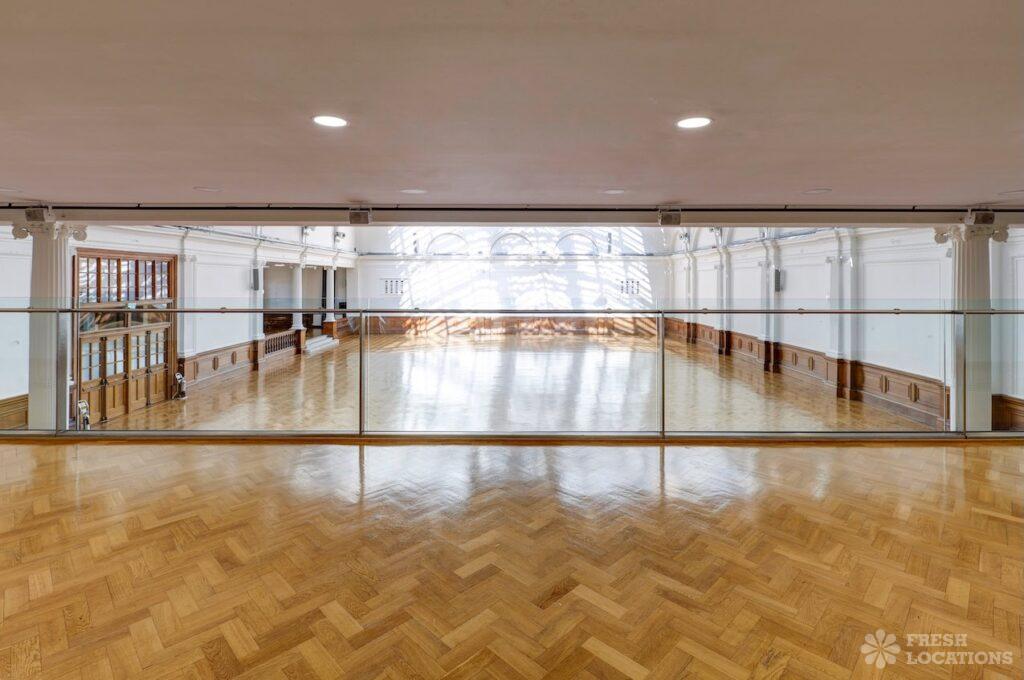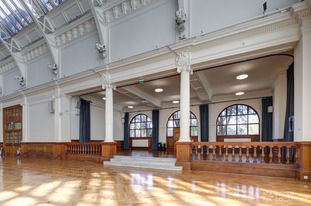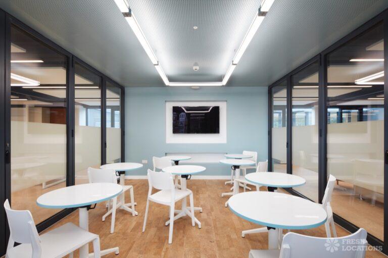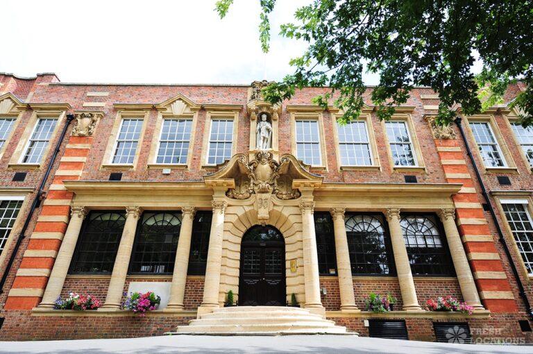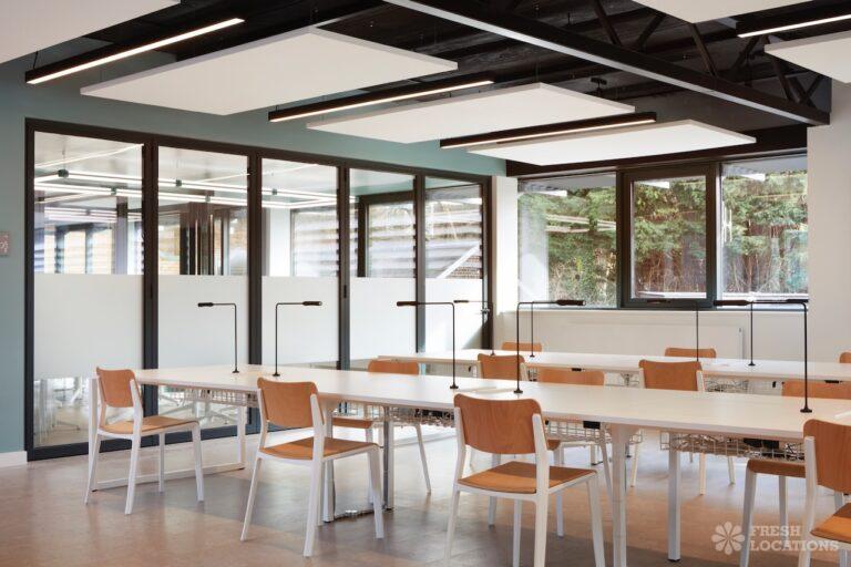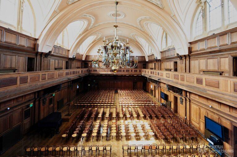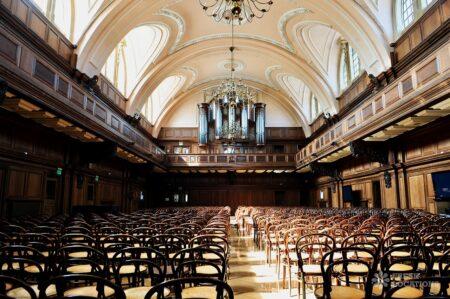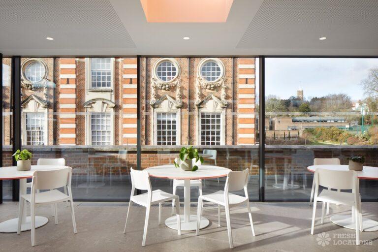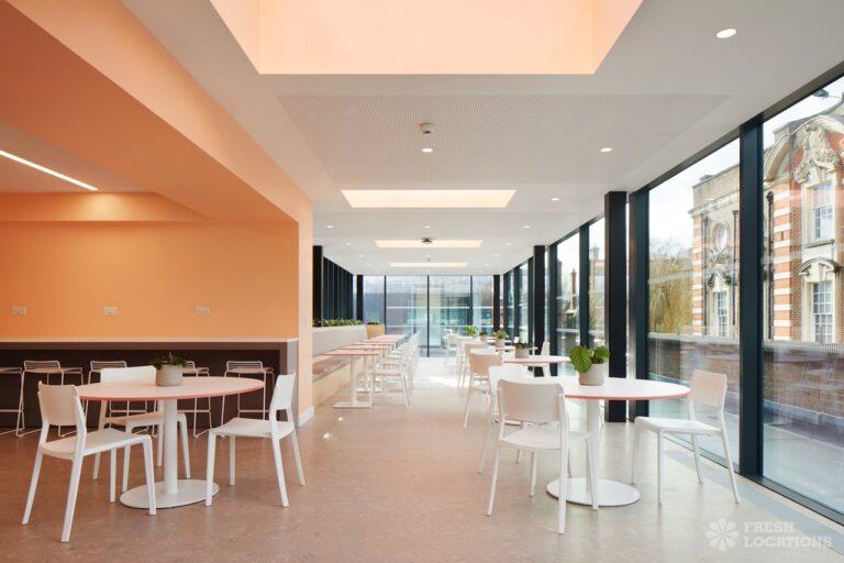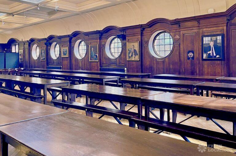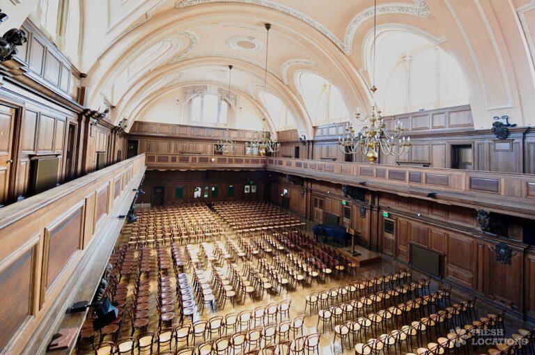 A shoot location in North West London featuring high vaulted ceilings with intricate architectural detailing, the space is bathed in natural light streaming through large arched windows. Rows of classic wooden chairs and warm wood paneling lend a timeless, elegant atmosphere to the hall. A grand chandelier and a stately organ at the far end serve as striking focal points, perfect for period dramas, concerts, or upscale event scenes. The combination of ornate design, rich textures, and impressive scale makes this location both versatile and visually captivating for production needs. The separate Sixth Form Centre is a flexible space with meeting rooms and a cafe. London Borough of Camden.