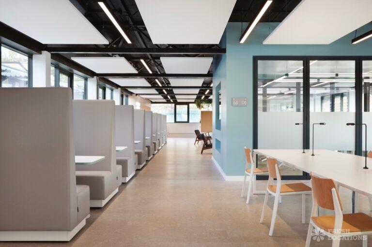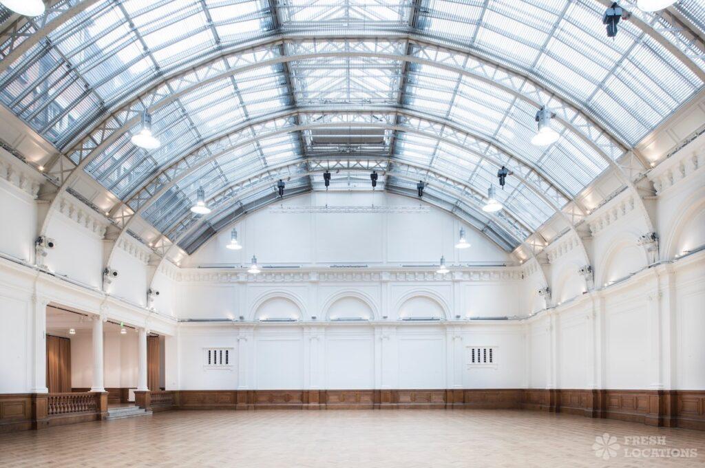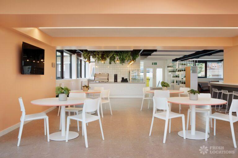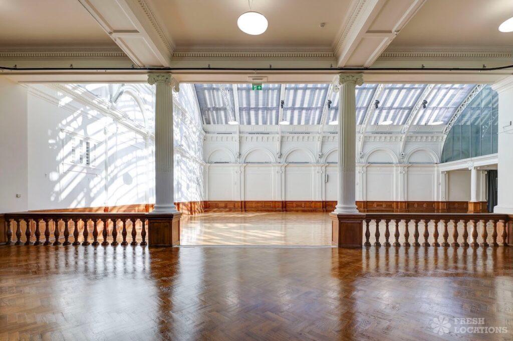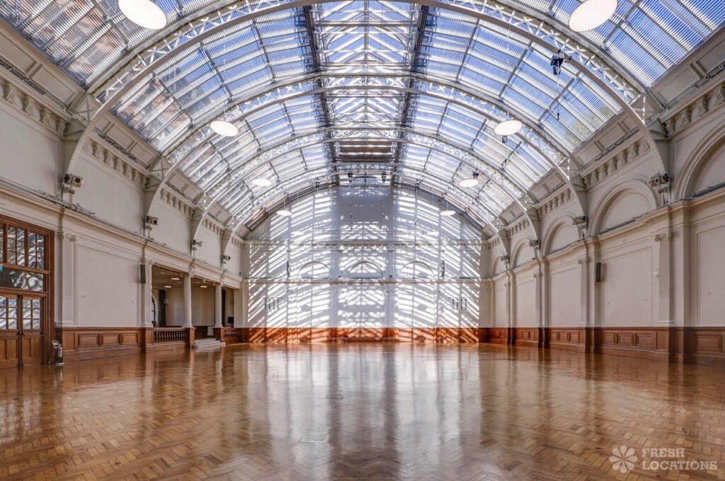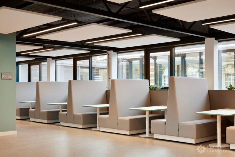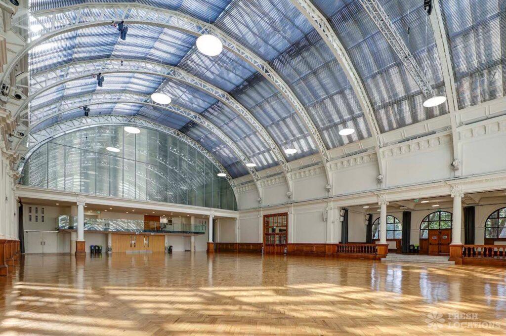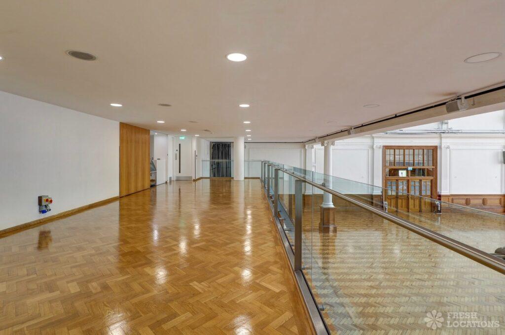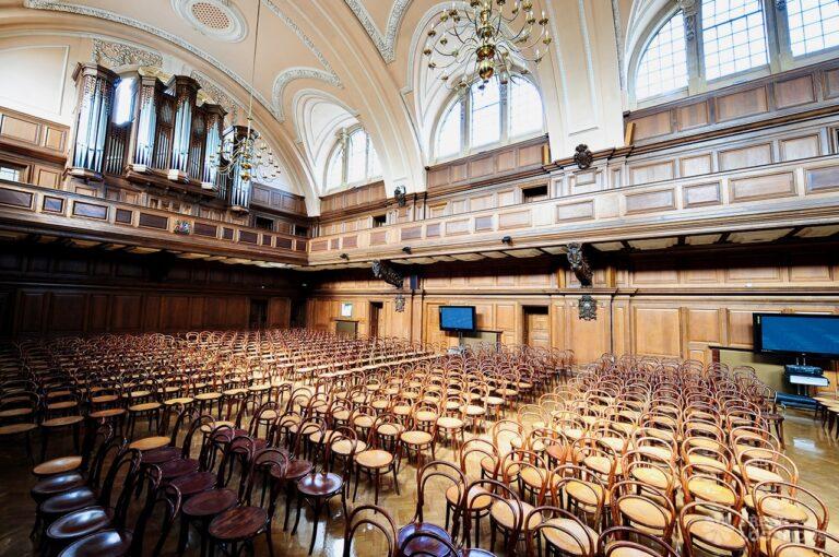 A shoot location in North West London featuring high vaulted ceilings with intricate architectural detailing, the space is bathed in natural light streaming through large arched windows. Rows of classic wooden chairs and warm wood paneling lend a timeless, elegant atmosphere to the hall. A grand chandelier and a stately organ at the far end serve as striking focal points, perfect for period dramas, concerts, or upscale event scenes. The combination of ornate design, rich textures, and impressive scale makes this location both versatile and visually captivating for production needs. The separate Sixth Form Centre is a flexible space with meeting rooms and a cafe. London Borough of Camden.