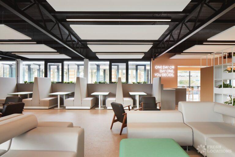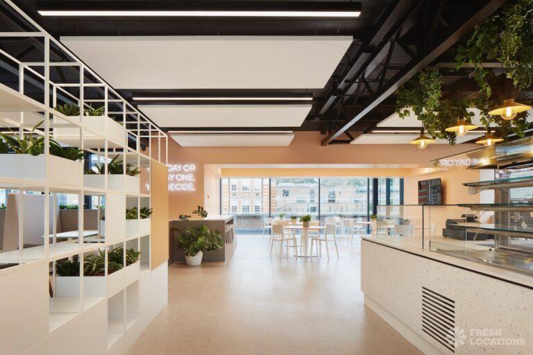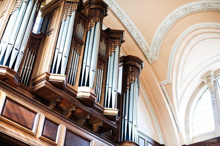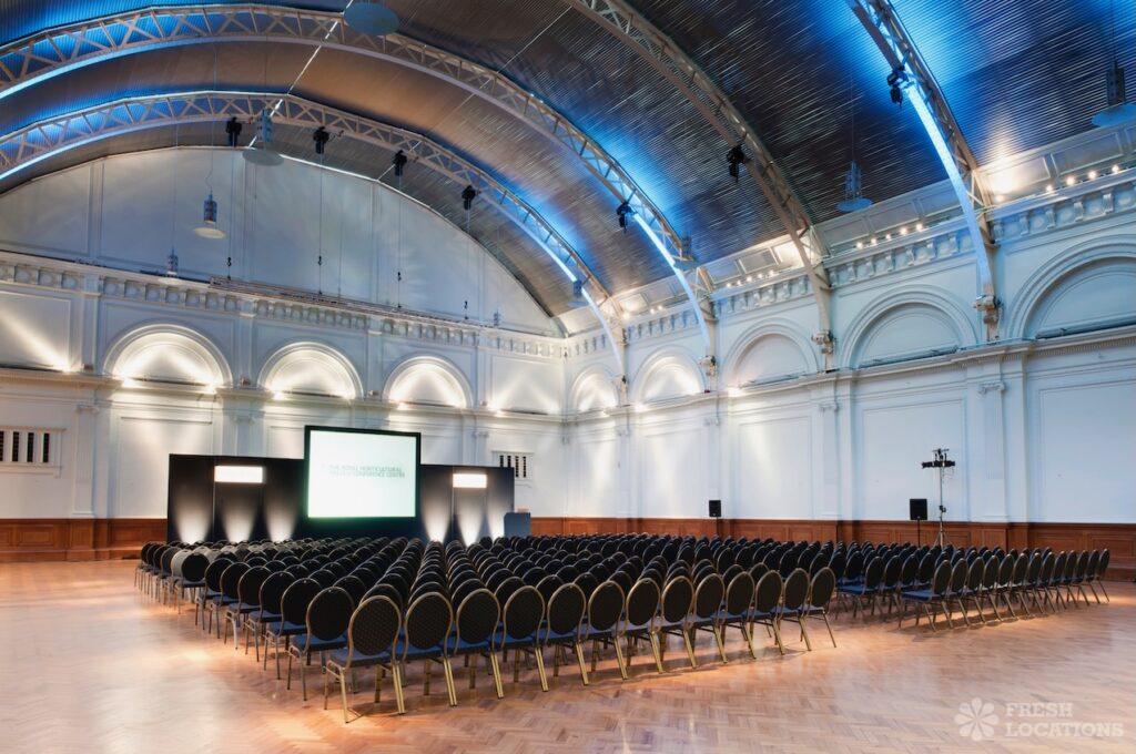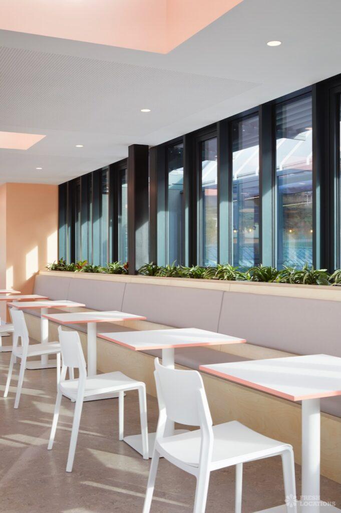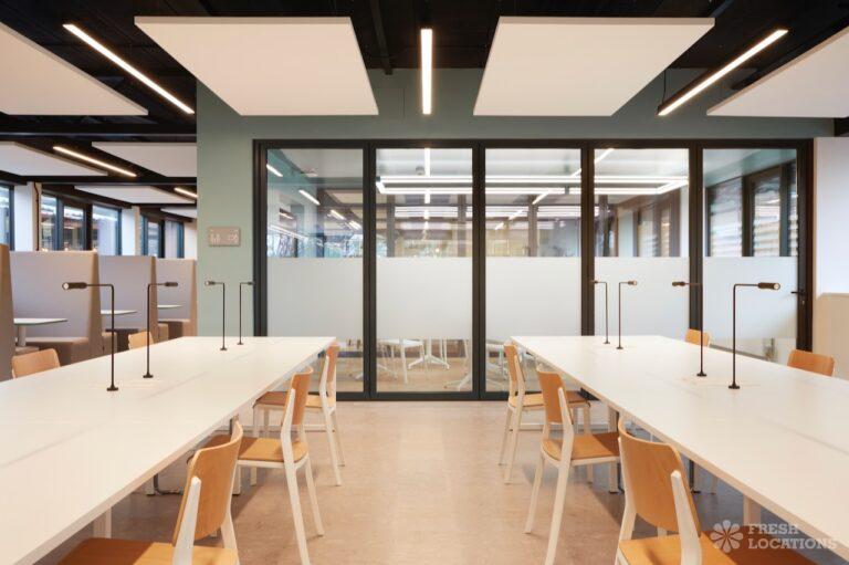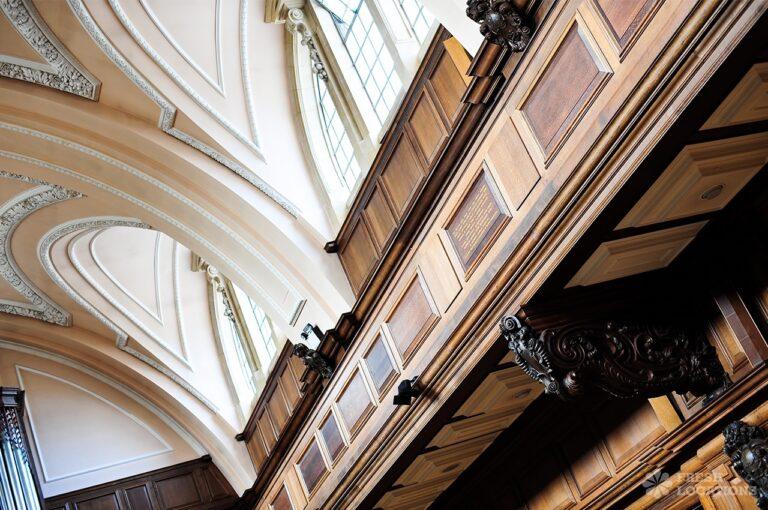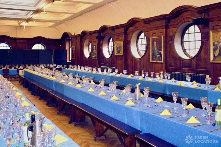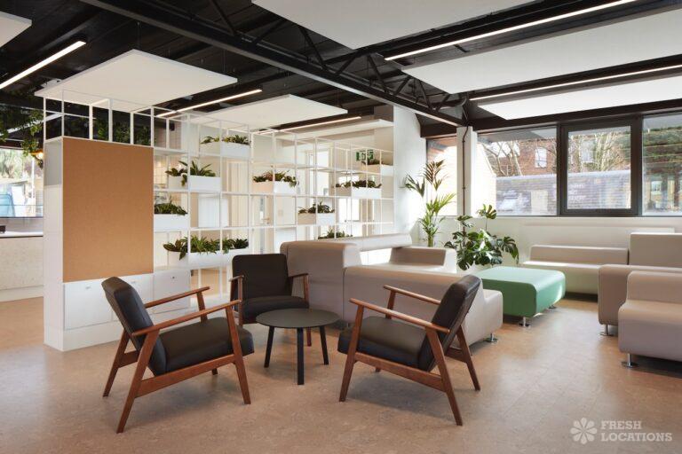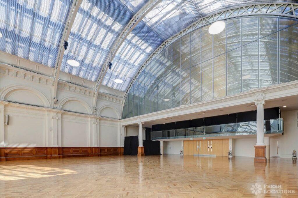 A shoot location in North West London featuring high vaulted ceilings with intricate architectural detailing, the space is bathed in natural light streaming through large arched windows. Rows of classic wooden chairs and warm wood paneling lend a timeless, elegant atmosphere to the hall. A grand chandelier and a stately organ at the far end serve as striking focal points, perfect for period dramas, concerts, or upscale event scenes. The combination of ornate design, rich textures, and impressive scale makes this location both versatile and visually captivating for production needs. The separate Sixth Form Centre is a flexible space with meeting rooms and a cafe. London Borough of Camden.