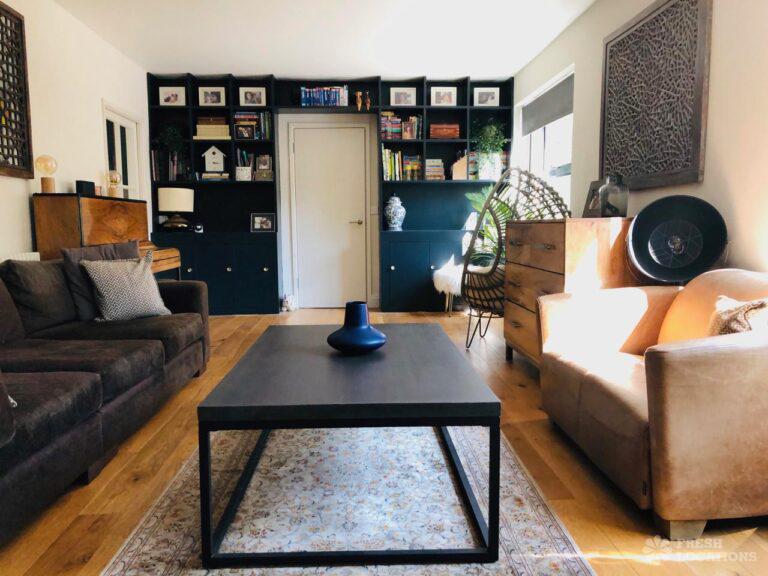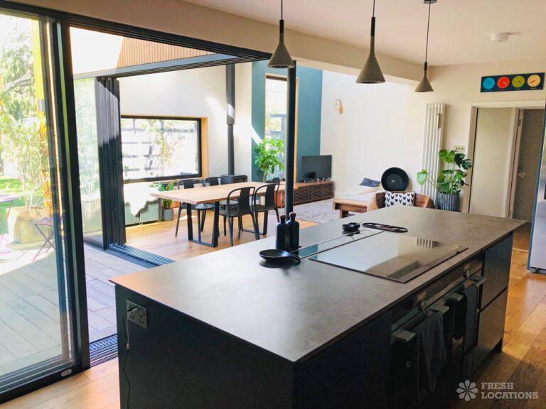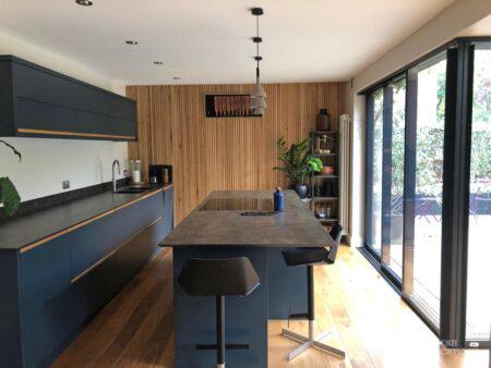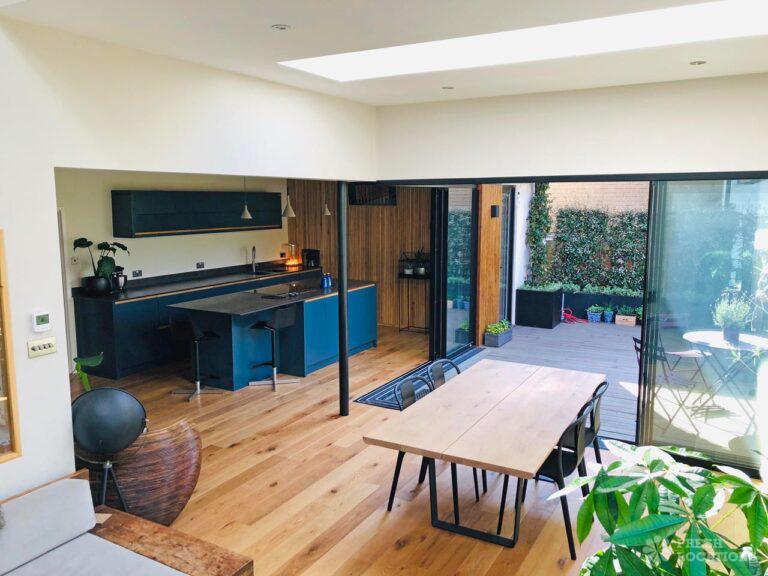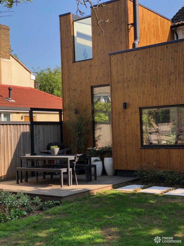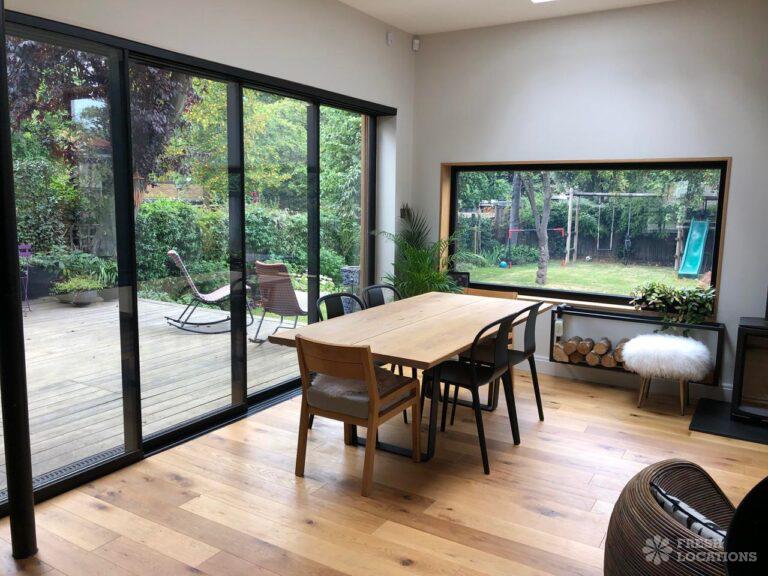 Wood Floors, Decked Terrace, Driveway, Fireplace, Garden, Island Cooker, Island Kitchen, Large Kitchen, Light Wood Floor, Open Plan, Skylights, StaircaseDetached 5 bedroom modern family home with landscaped garden featuring a decked terrace and lawn. Open plan living/dining area with double height space and L shaped kitchen with wood cladded wall. Skylights and large windows provide plenty of natural lighting. Wooden flooring throughout ground floor, with two wood burning fireplaces. London Borough of Greenwich.
