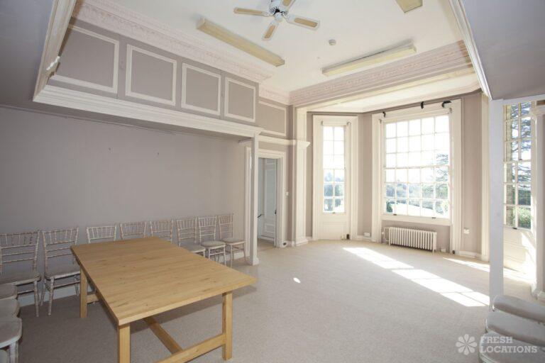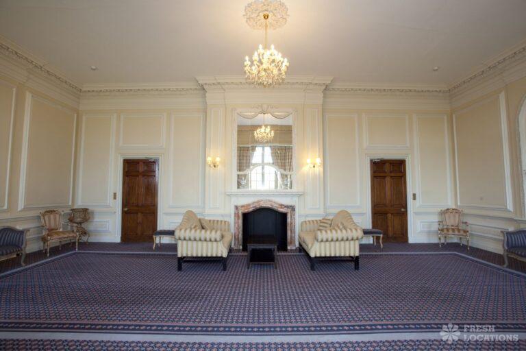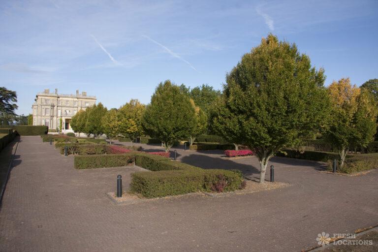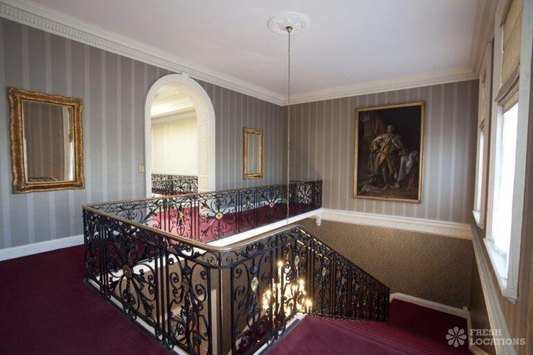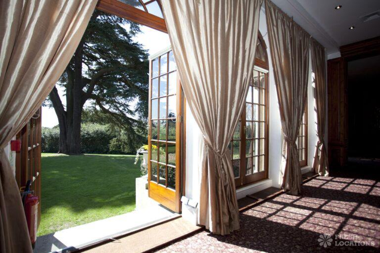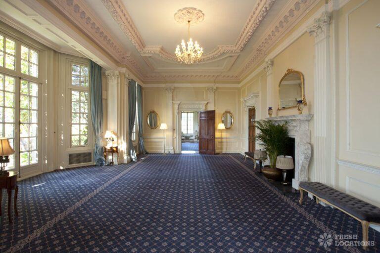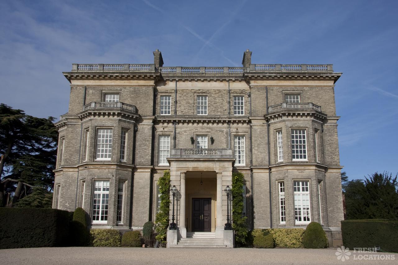 Wood Floors, Balcony, Dark Wood Floor, Driveway, Ensuite, Fireplace, Garden, Large Bedroom, Open Plan, Panelling, Roof Terrace, Skylights, Staircase, Tennis Court, Tiled FloorEmpty stately home in Buckinghamshire. Palladian hall with overlooking balcony, wood panelled room. Views over parkland. Filming and events.