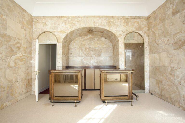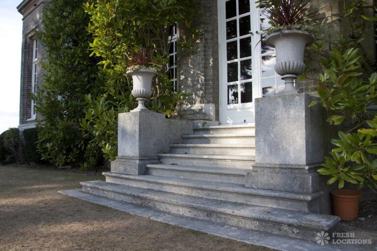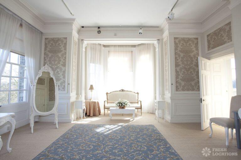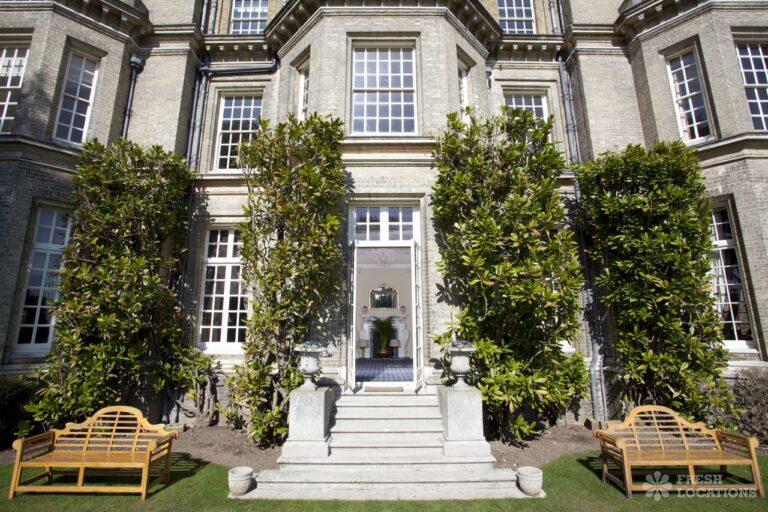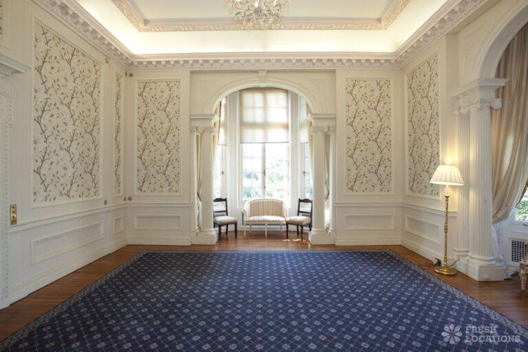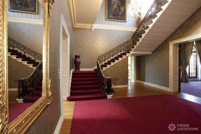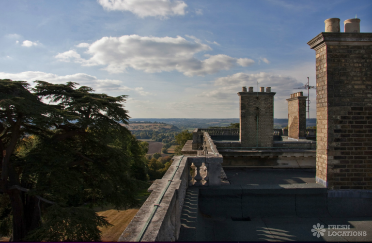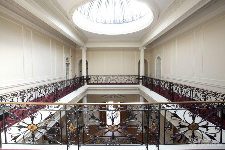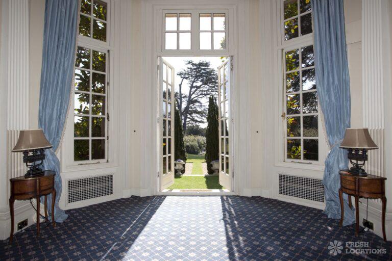 Wood Floors, Balcony, Dark Wood Floor, Driveway, Ensuite, Fireplace, Garden, Large Bedroom, Open Plan, Panelling, Roof Terrace, Skylights, Staircase, Tennis Court, Tiled FloorEmpty stately home in Buckinghamshire. Palladian hall with overlooking balcony, wood panelled room. Views over parkland. Filming and events.