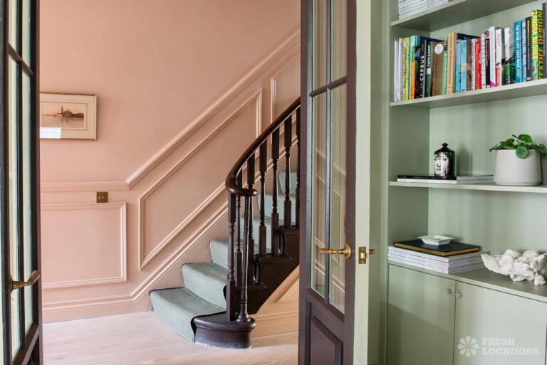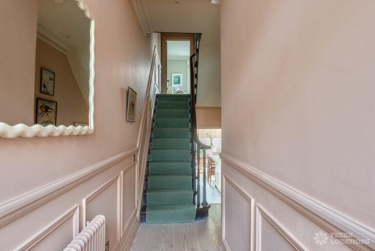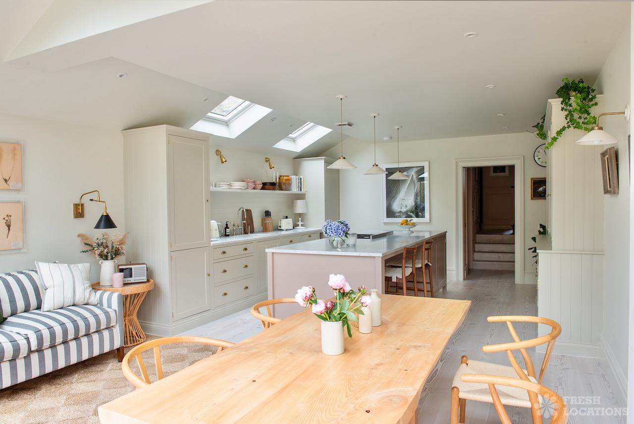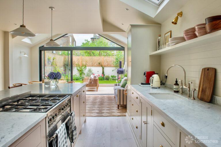 Wood Floors, Bay Window, Ensuite, Fireplace, Garden, Island Cooker, Island Kitchen, Open Plan, Skylights, Staircase, Tiled Floor, Walk In ShowerLovely family home shoot location in West London. Open plan kitchen/diner with sliding doors opening out to a garden with patio area. Four bedrooms, four bathrooms and large double reception room. London Borough of Hammersmith and Fulham.