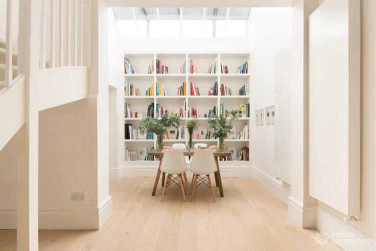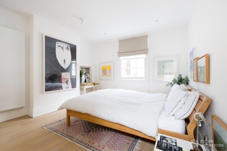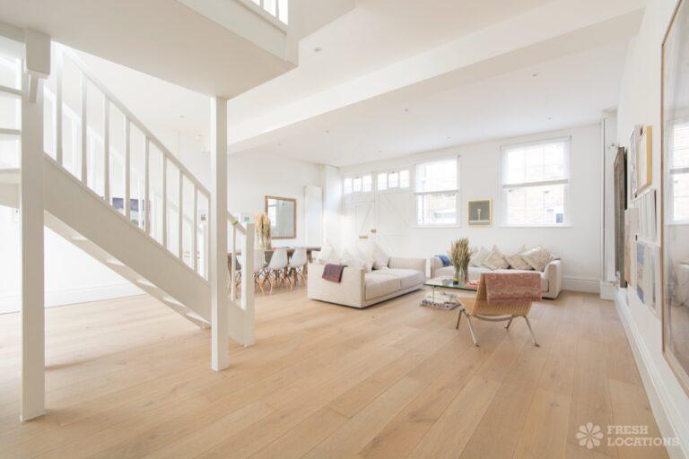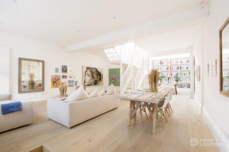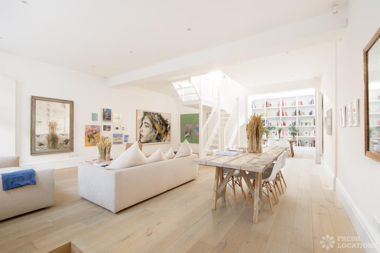 Wood Floors, Ensuite, Large Bathroom, Large Bedroom, Light Wood Floor, Marble Floor, Open Plan, Skylights, Staircase, Walk In Shower, White KitchenA unique, light and bright mews house in Kensington with a large original garage double door which opens up into the large open planned living/dining room, high ceilings and a wealth of modern art. London Borough of Kensington and Chelsea.