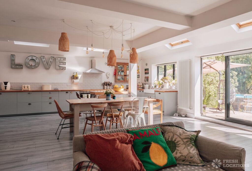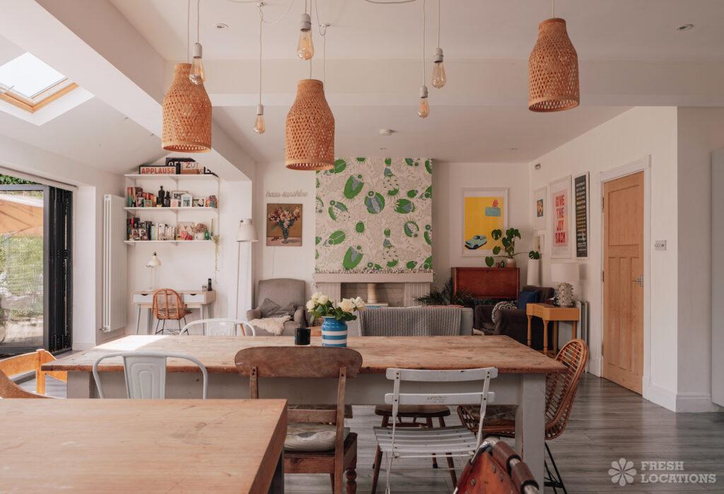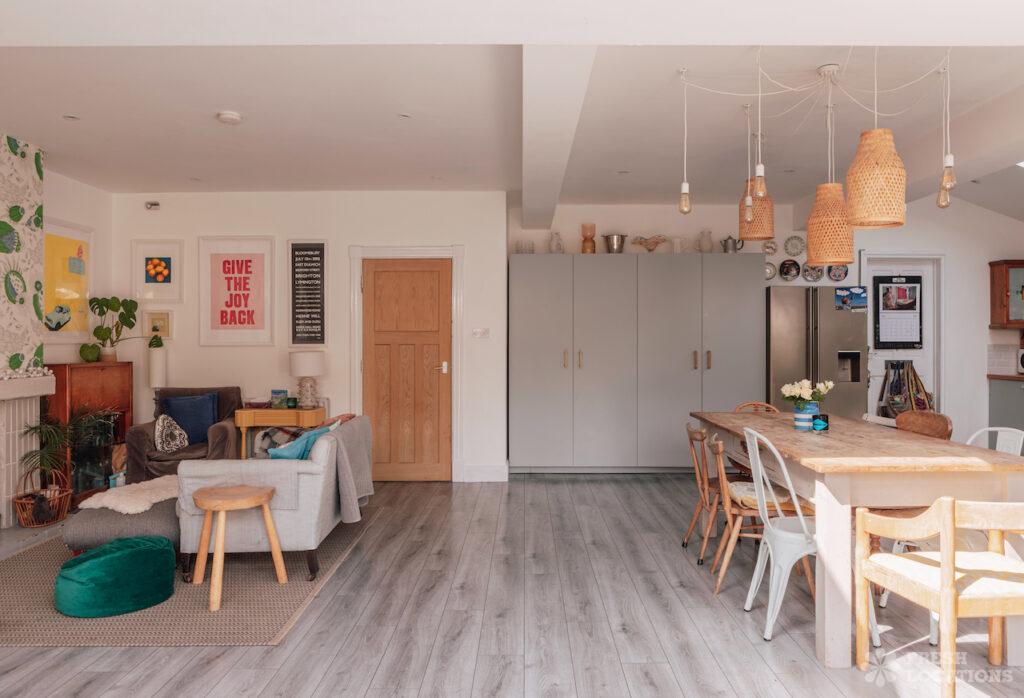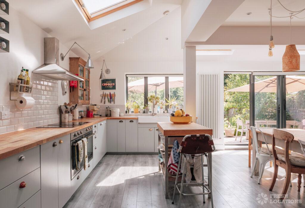 Garden, Ensuite, Exposed Plaster, Fireplace, Island Kitchen, Multiple Bathrooms, Multiple Bedrooms, Open Plan, Painted Floors, Polished Concrete, Skylights, Staircase, Walk In Shower, White Kitchen, Wood FloorsBright, lived in family home shoot location in North West London. Open plan kitchen/dining /living area with sliding doors leading to a garden with a spacious terrace. Shabby chic with polished concrete floors and lots of props throughout. London Borough of Brent.