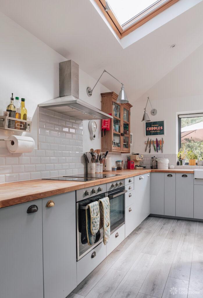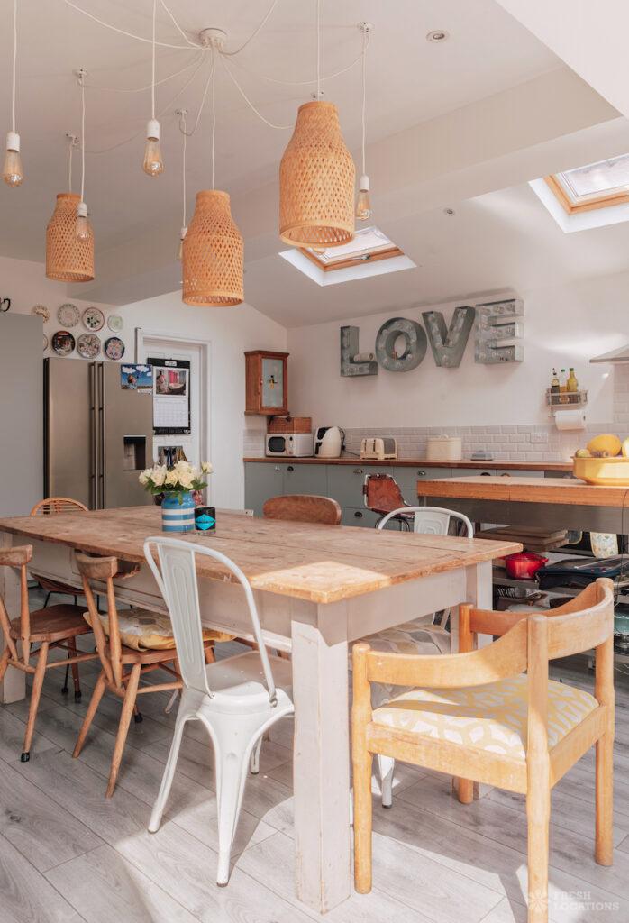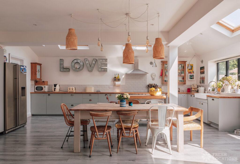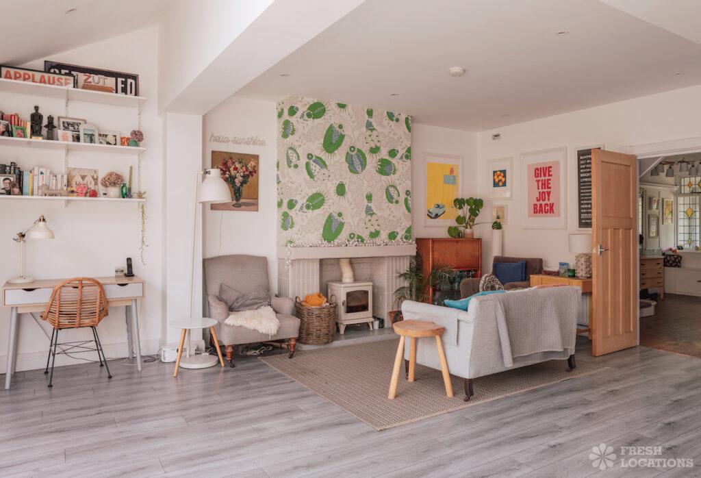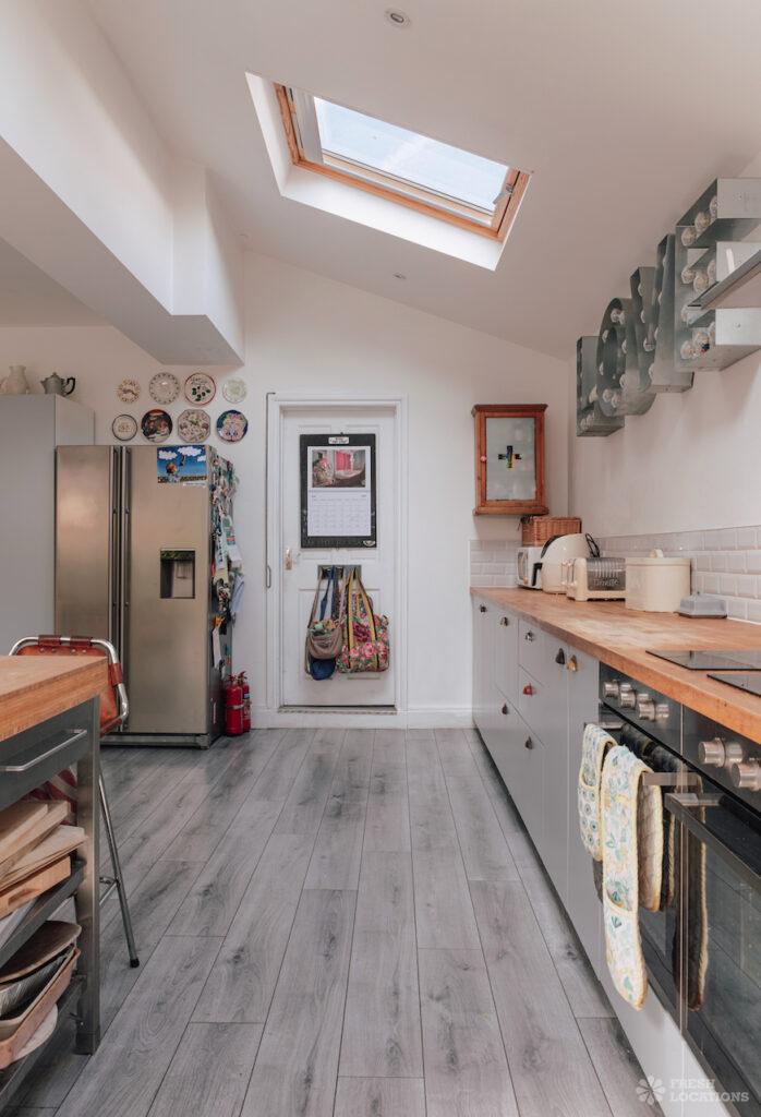 Garden, Ensuite, Exposed Plaster, Fireplace, Island Kitchen, Multiple Bathrooms, Multiple Bedrooms, Open Plan, Painted Floors, Polished Concrete, Skylights, Staircase, Walk In Shower, White Kitchen, Wood FloorsBright, lived in family home shoot location in North West London. Open plan kitchen/dining /living area with sliding doors leading to a garden with a spacious terrace. Shabby chic with polished concrete floors and lots of props throughout. London Borough of Brent.