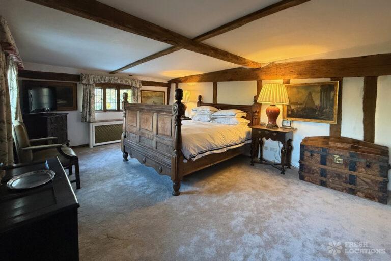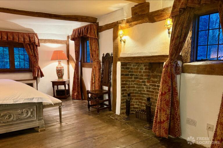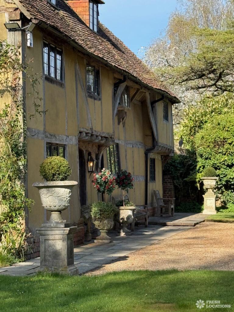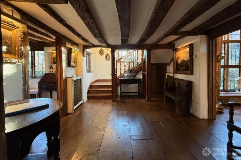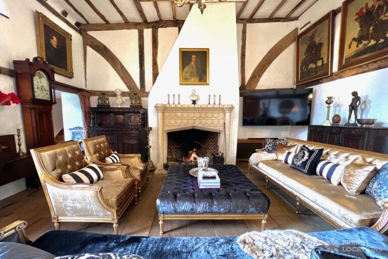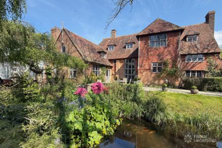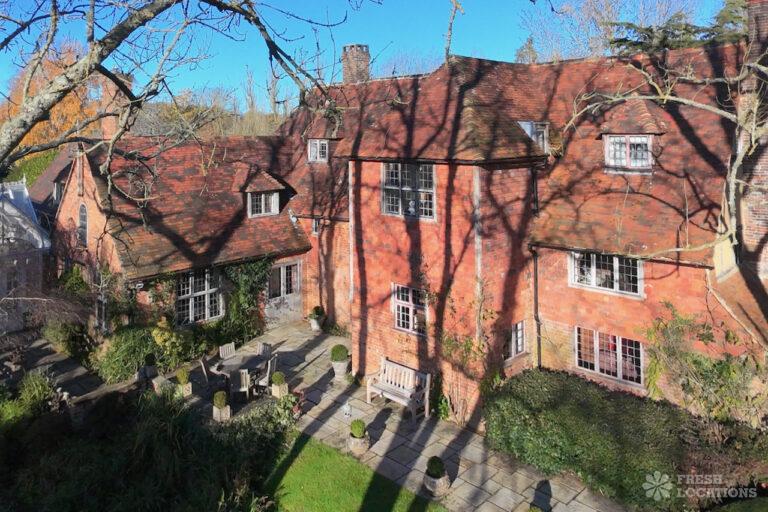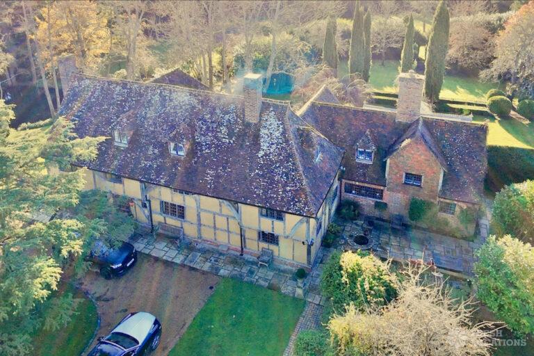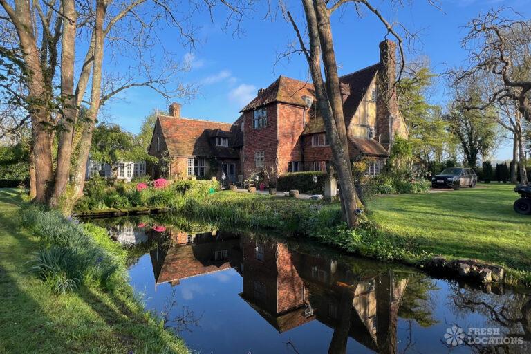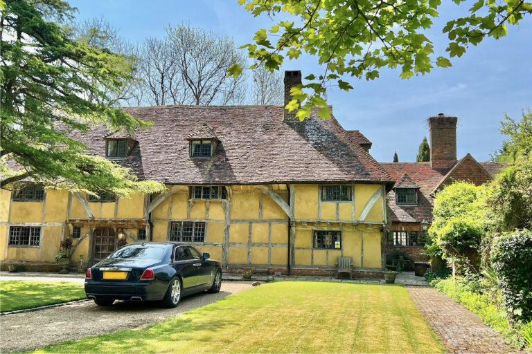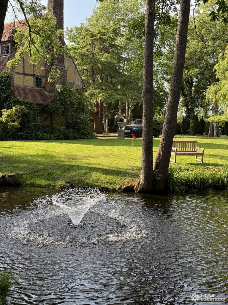 A Tudor estate in Surrey surrounded by beautifully landscaped gardens, a serene lake, elegant fountains, and expansive outdoor spaces. The property features ten bedrooms and seven bathrooms and a range of outbuildings.