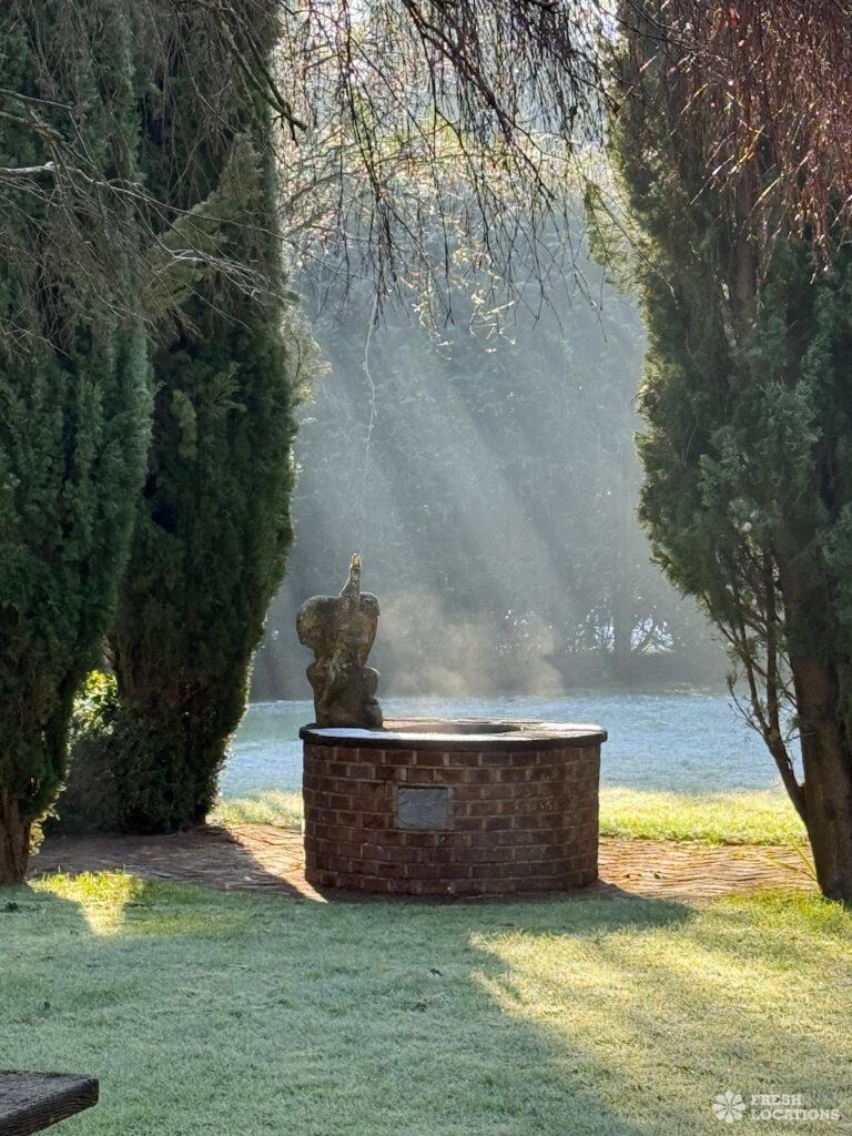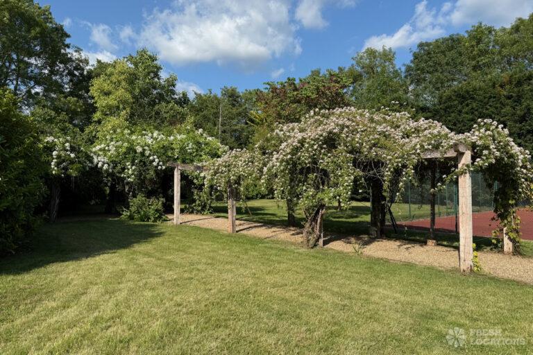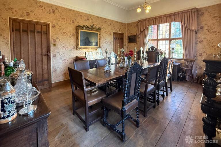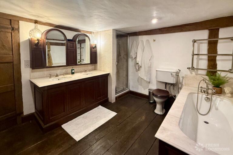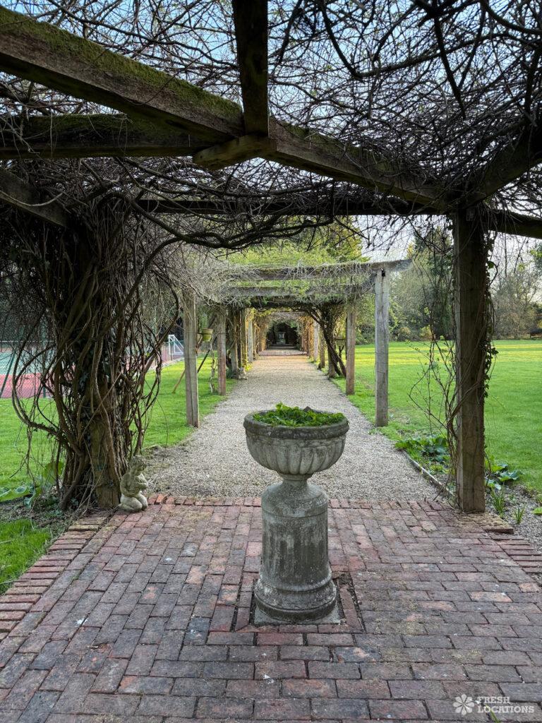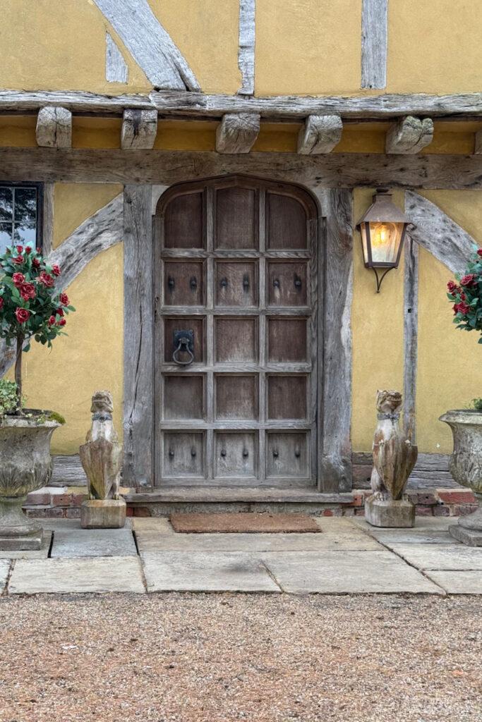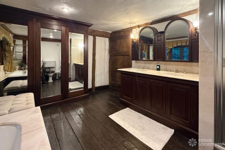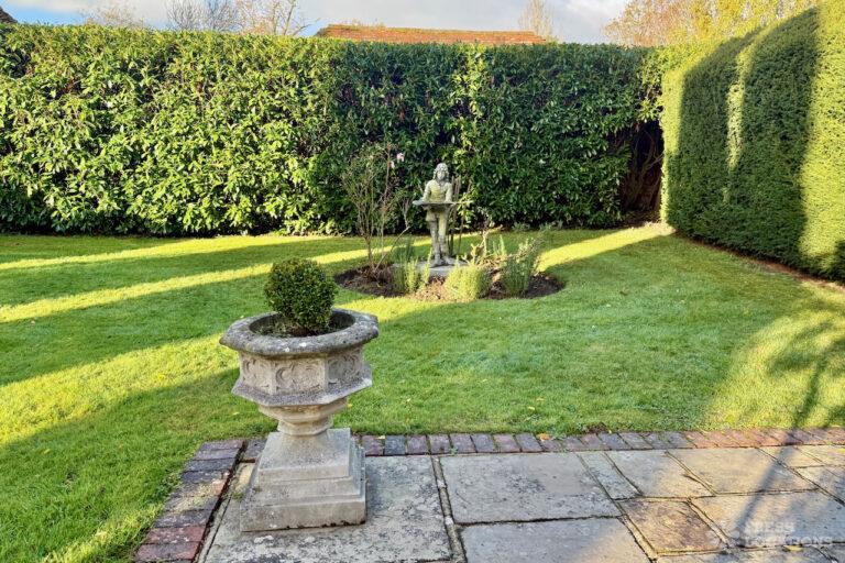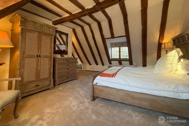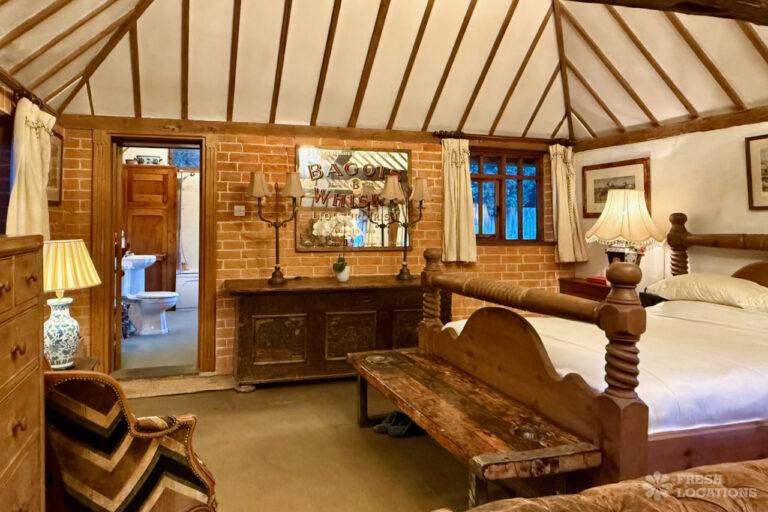 A Tudor estate in Surrey surrounded by beautifully landscaped gardens, a serene lake, elegant fountains, and expansive outdoor spaces. The property features ten bedrooms and seven bathrooms and a range of outbuildings.