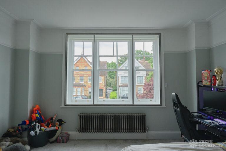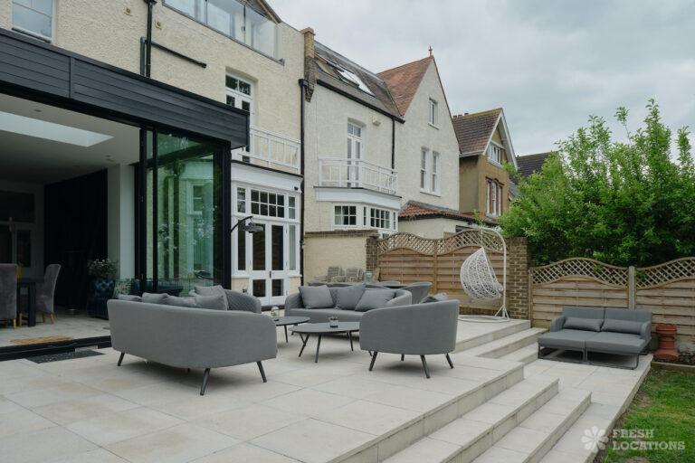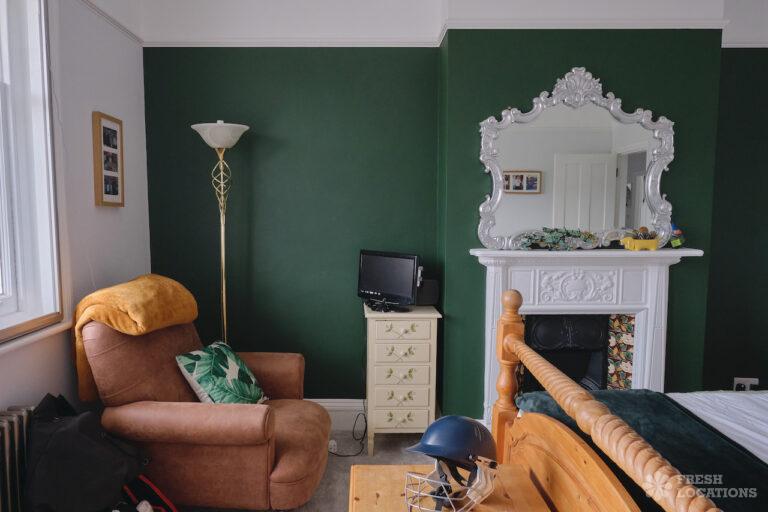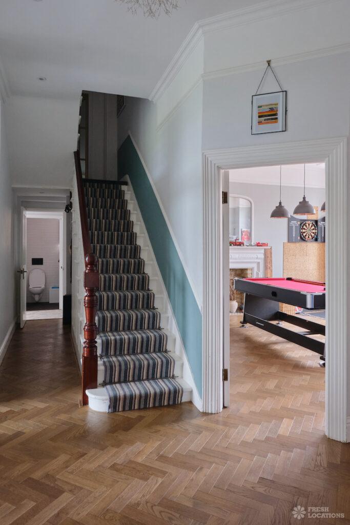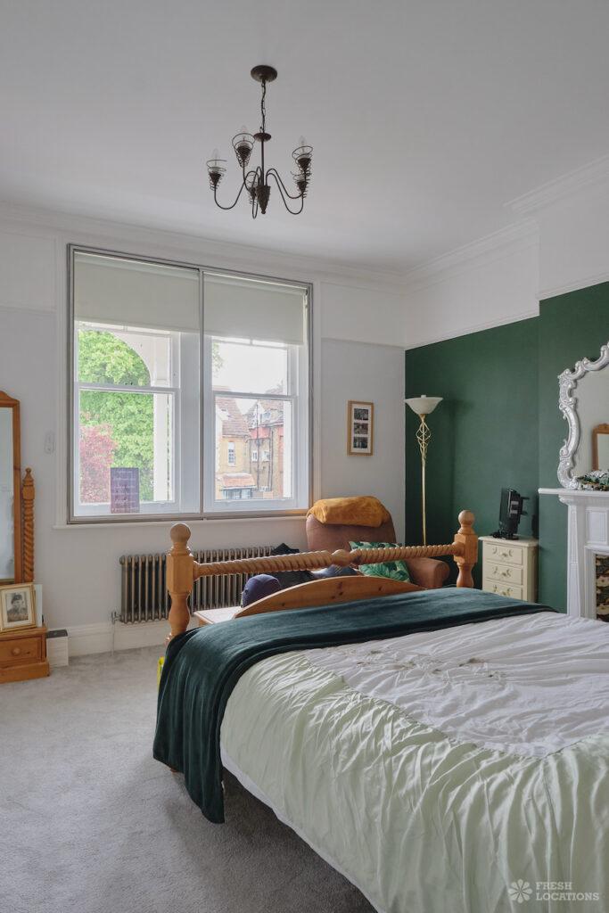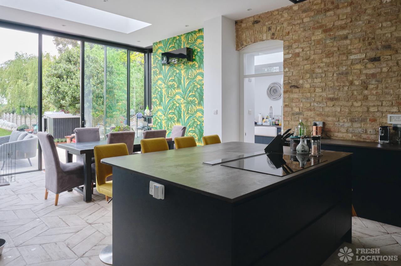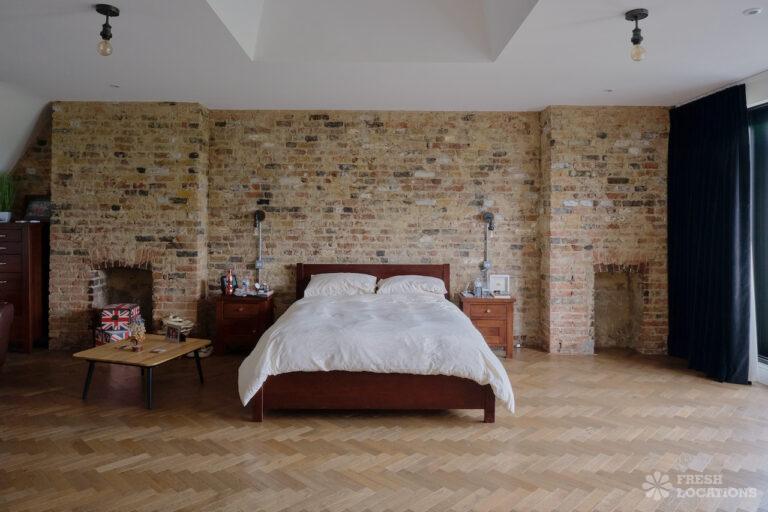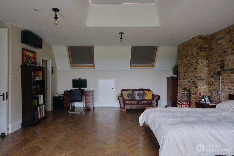 Driveway, Bay Window, Colourful Kitchen, Ensuite, Fireplace, Full Height Windows, Garden, Home Gym, Island Cooker, Island Kitchen, Large Bedroom, Large Garden, Light Wood Floor, Multiple Bedrooms, Parquet Floor, Skylights, Staircase, Tiled Floor, Walk In Shower, Wood FloorsLarge Edwardian semi-detached house in South East London. This shoot location features exposed brick walls, full height windows and a large garden. Rooms include multiple bedrooms, a games room, and a basement gym. London Borough of Bromley.