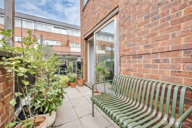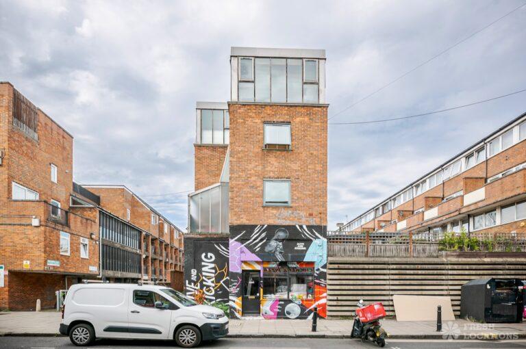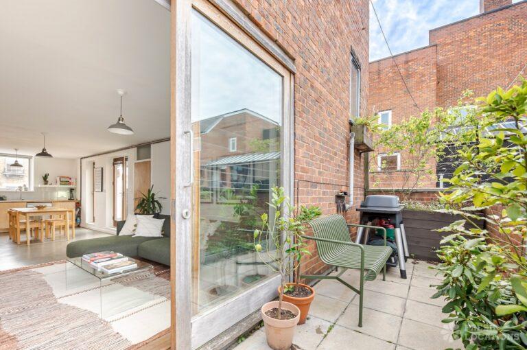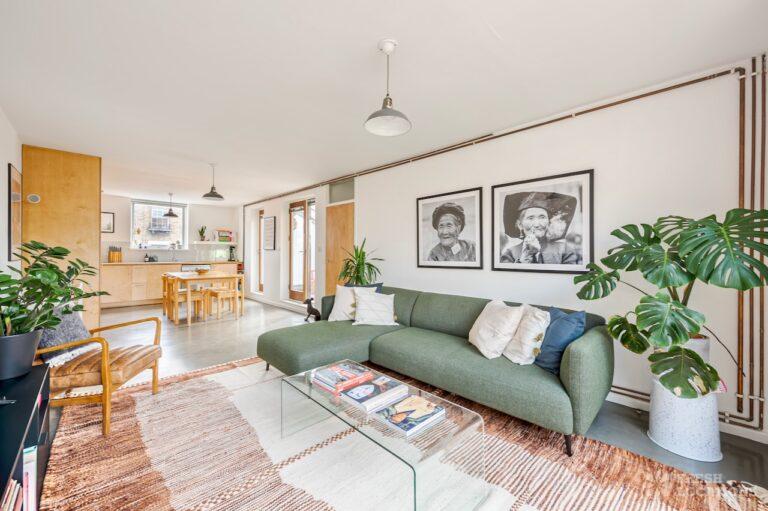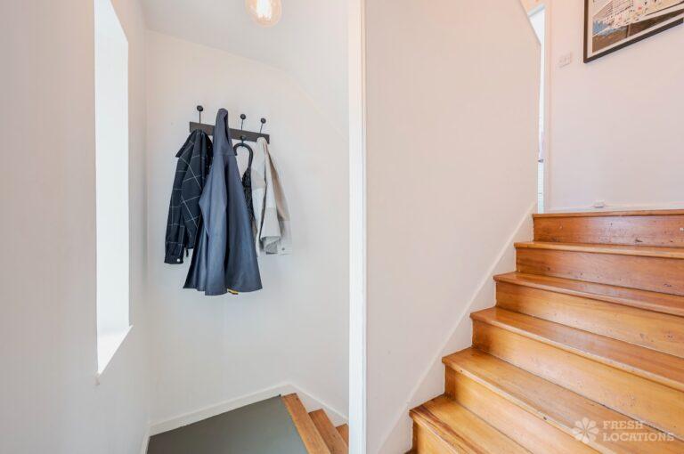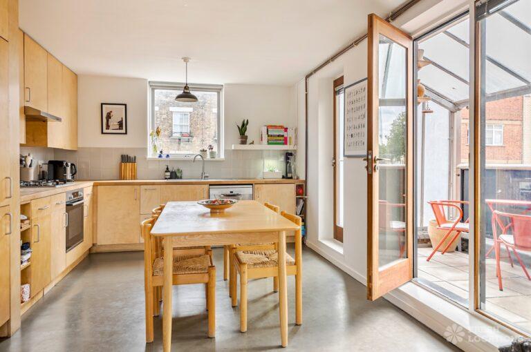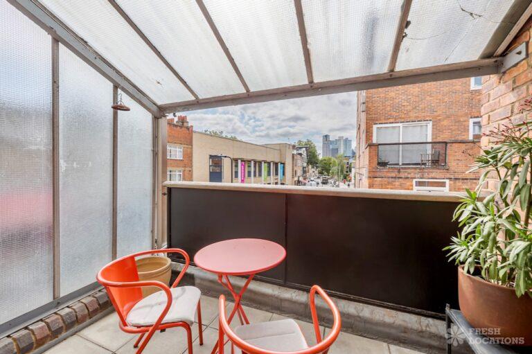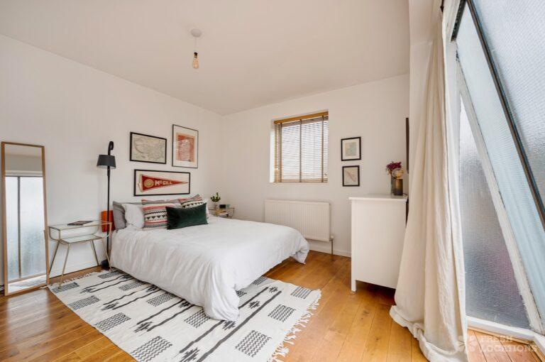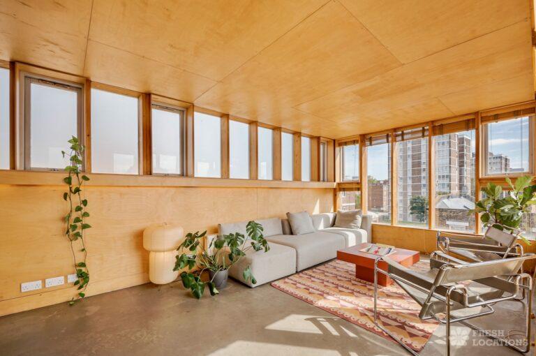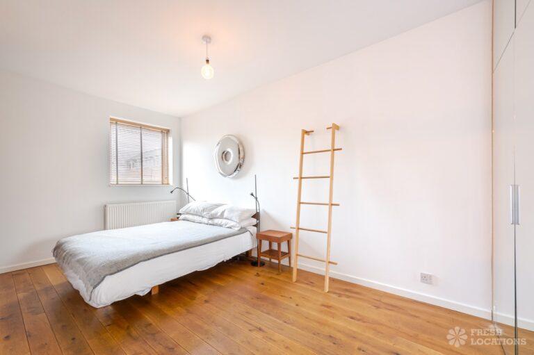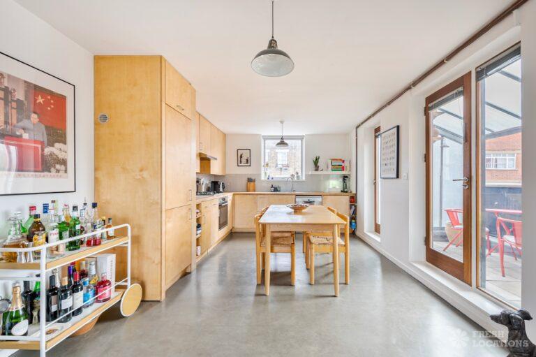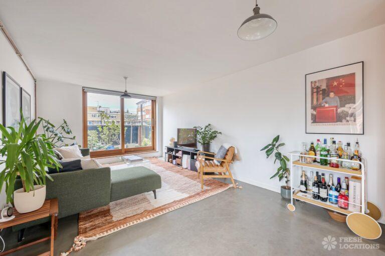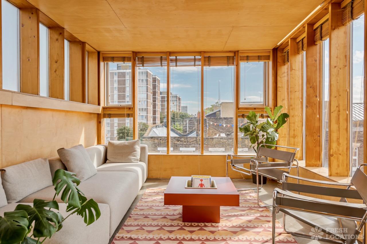 City Views, Courtyard, Light Wood Floor, Open Plan, Polished Concrete, Staircase, Wood FloorsA loft apartment shoot location in North London. This unique property has wooden slatted windows, a minimalist design and neutral colours throughout. London Borough of Hackney.