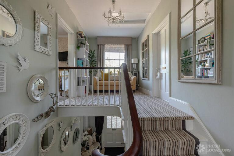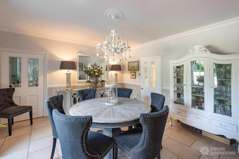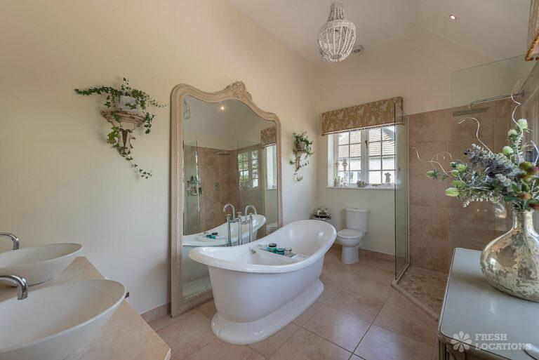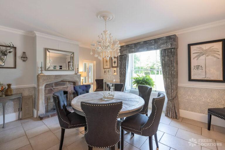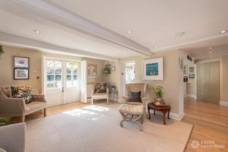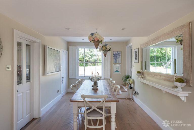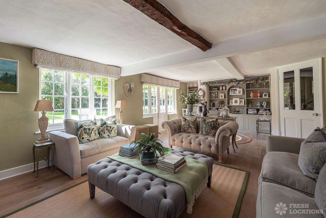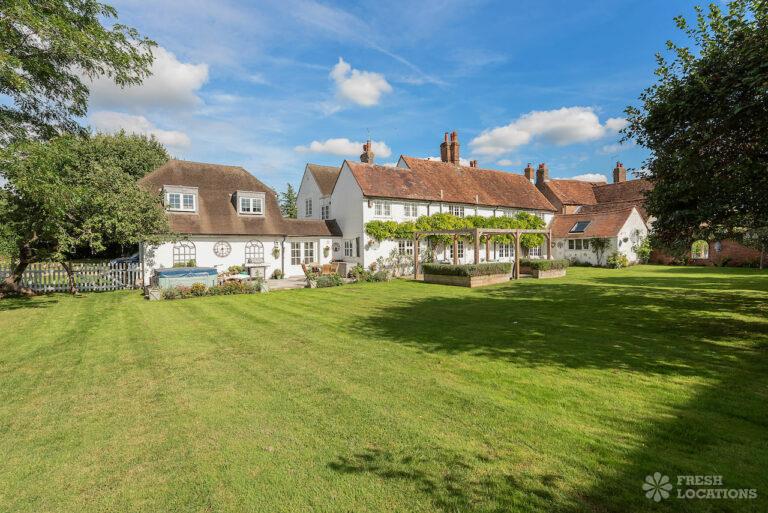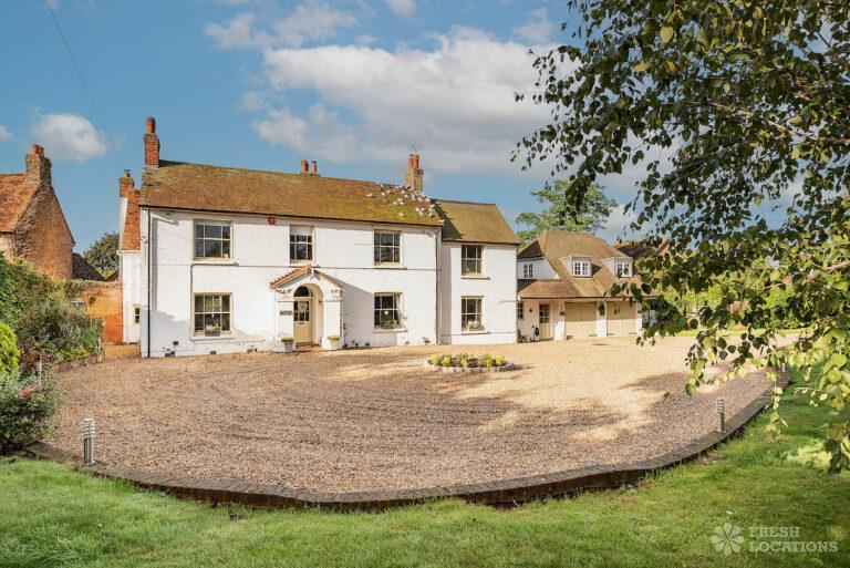 Wood Floors, Aga, Dark Wood Floor, Driveway, Ensuite, Fireplace, Garage, Garden, Gas Hob, Inglenook Fireplace, Island Kitchen, Large Bathroom, Large Bedroom, Large Driveway, Large Garden, Light Wood Floor, Multiple Bedrooms, Multiple Living Rooms, Staircase, Tiled Floor, Walk In ShowerThis shoot location in Buckinghamshire is made up of an 1800’s Farmhouse and a Georgian Manor House. On the ground floor of this property there are multiple living rooms, a kitchen diner, and a separate dining room. There are five bedrooms and three bathrooms. The house has a neutral colour palette throughout. It is grade II listed for its Georgian frontage, and there are original wooden beams in the Victorian part of the house. There is a sizeable front and back garden, which also provides space for the large driveway.