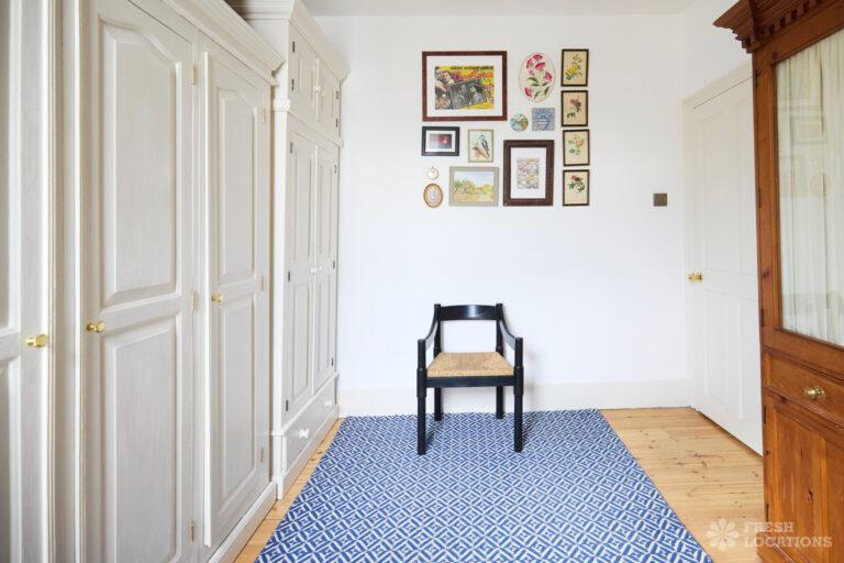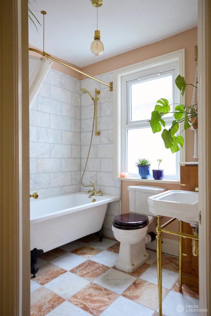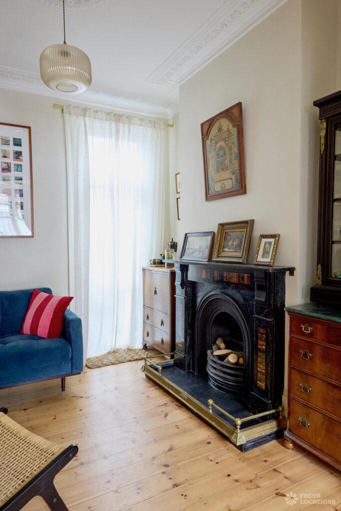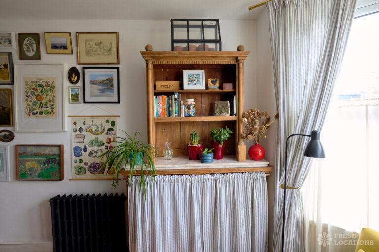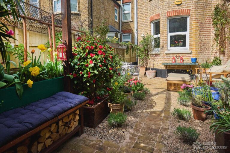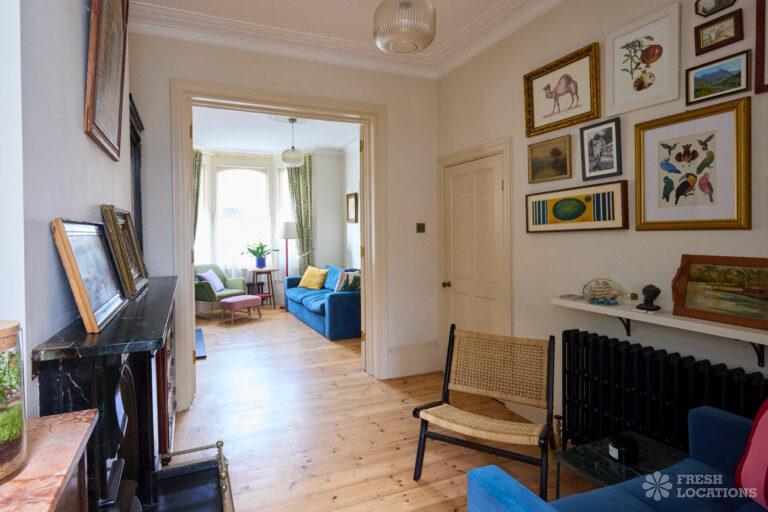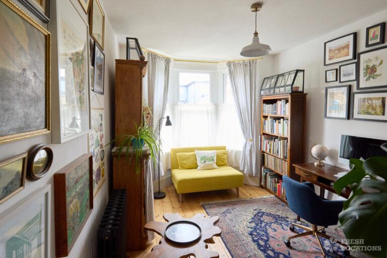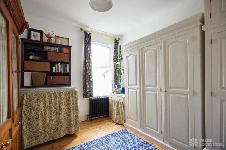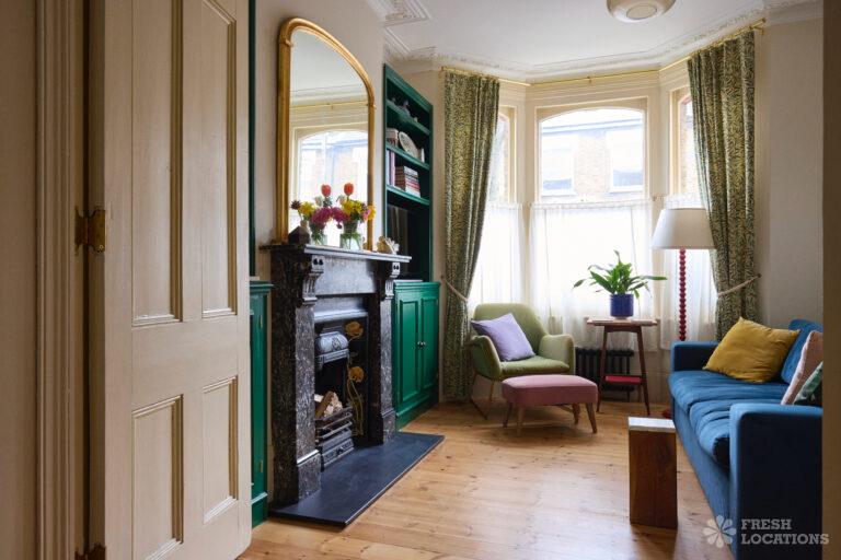 A bright and characterful terraced house in East London, this shoot location blends period charm with vibrant touches. The colourful kitchen features vintage-inspired cabinetry, a range cooker, and marble-tiled flooring, while the living space boasts a bay window, ornate cornicing, and eclectic furnishings. The bathroom continues the mix of old and new, with a roll-top bath, brass fittings, and stained-glass details. A stylish, light-filled home with unique textures and a warm, inviting atmosphere. London Borough of Waltham Forest.