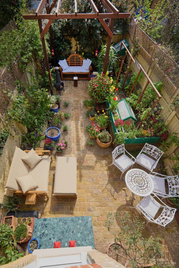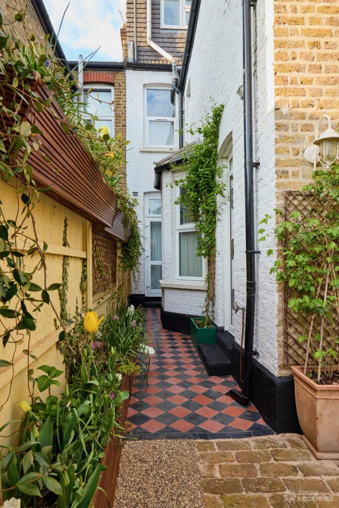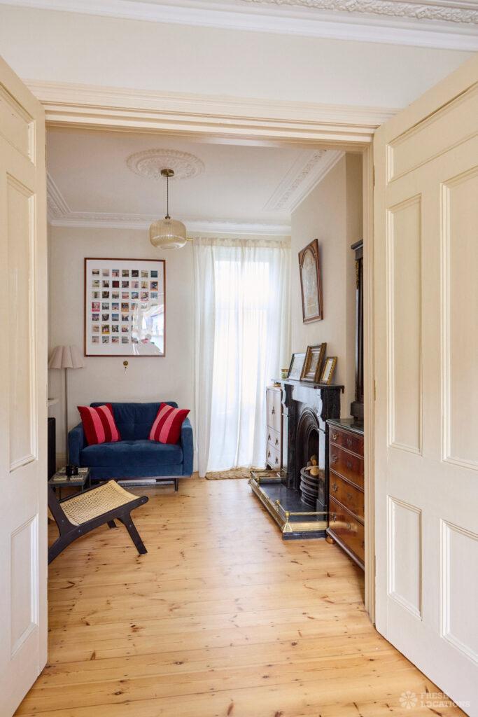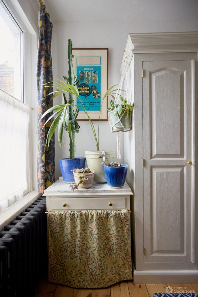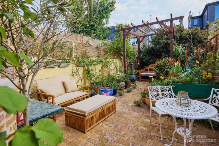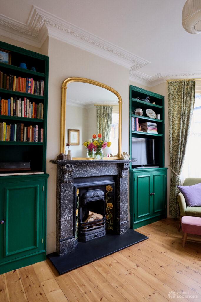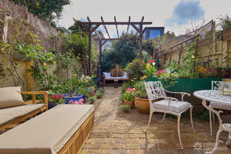 A bright and characterful terraced house in East London, this shoot location blends period charm with vibrant touches. The colourful kitchen features vintage-inspired cabinetry, a range cooker, and marble-tiled flooring, while the living space boasts a bay window, ornate cornicing, and eclectic furnishings. The bathroom continues the mix of old and new, with a roll-top bath, brass fittings, and stained-glass details. A stylish, light-filled home with unique textures and a warm, inviting atmosphere. London Borough of Waltham Forest.