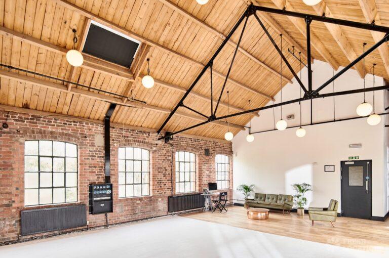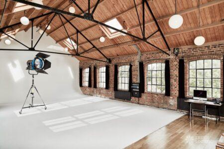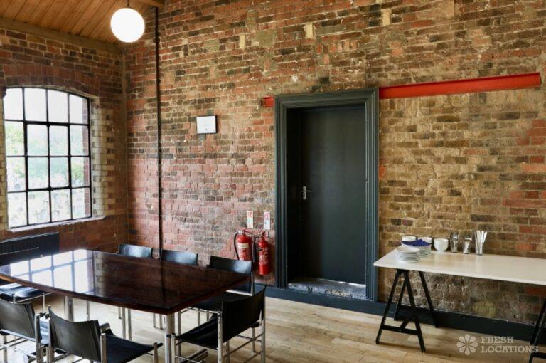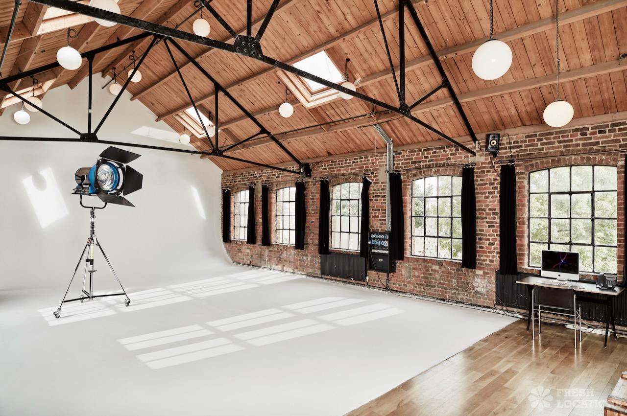Large photography studio with dressing room and crew dining area. Features include exposed brick, light wood floor and high ceilings. London Borough of Hammersmith and Fulham.