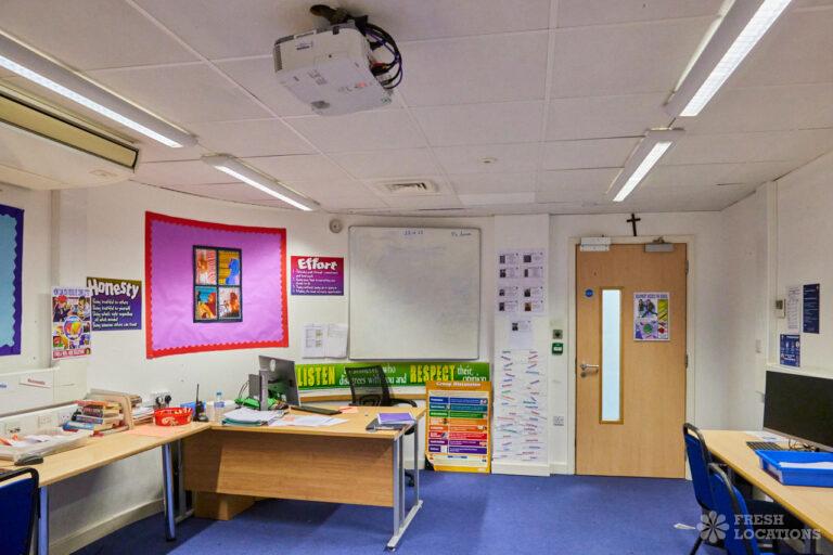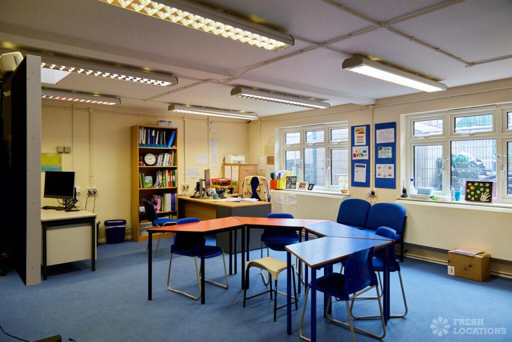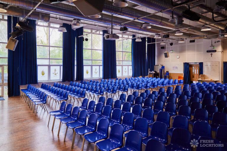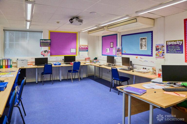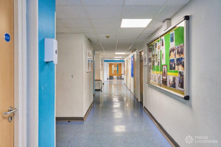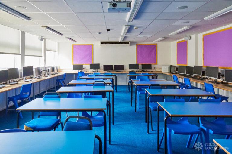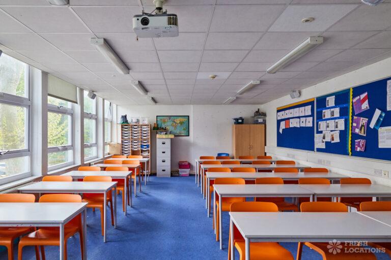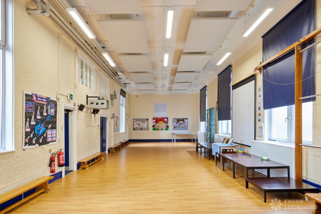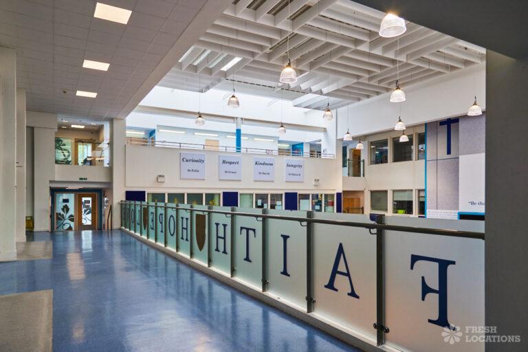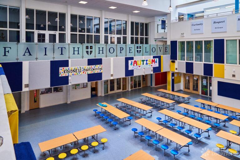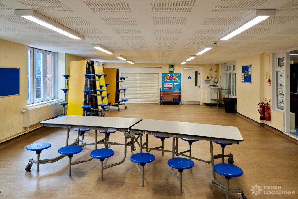 Large secondary school in North West London featuring multiple colourful classrooms, a spacious assembly hall and cafeteria as well as wide corridors and an outdoor gym. London Borough of Westminster.