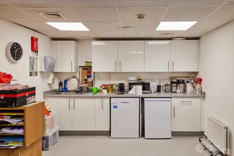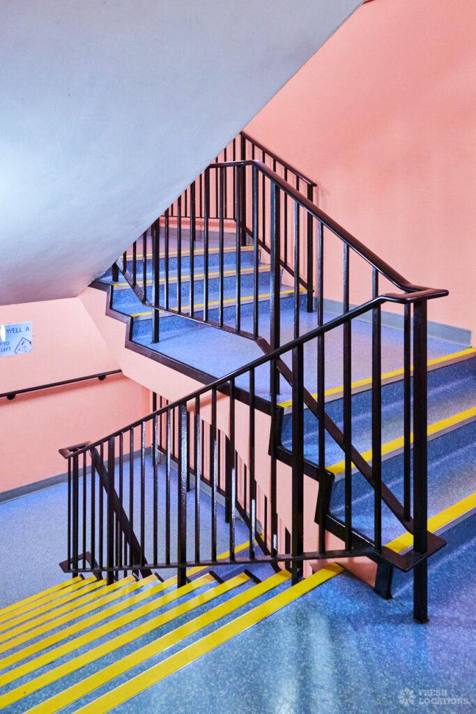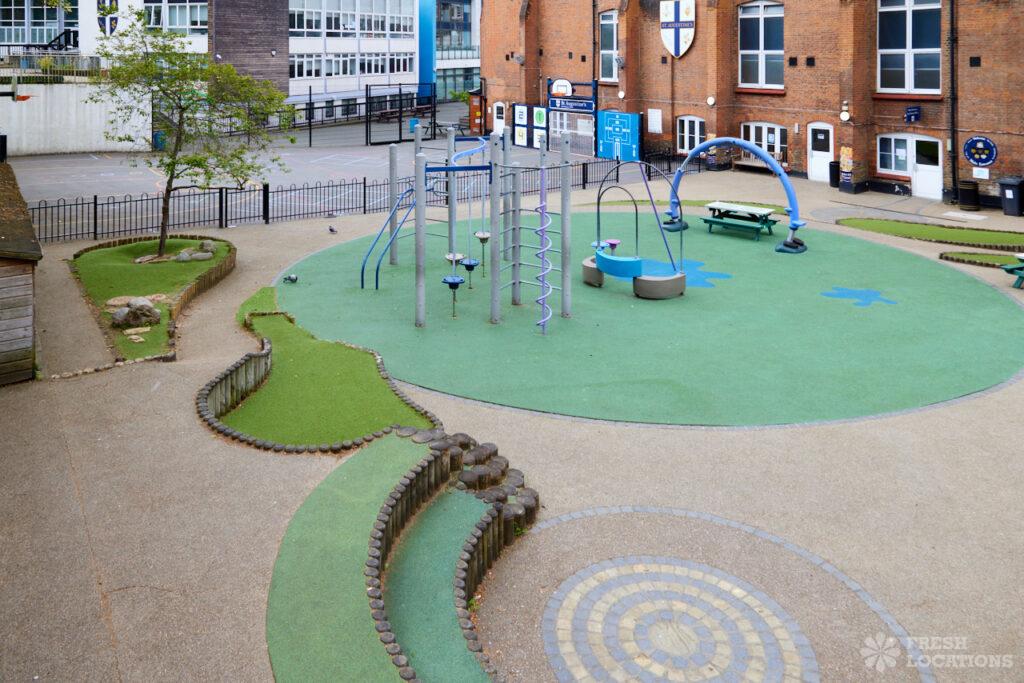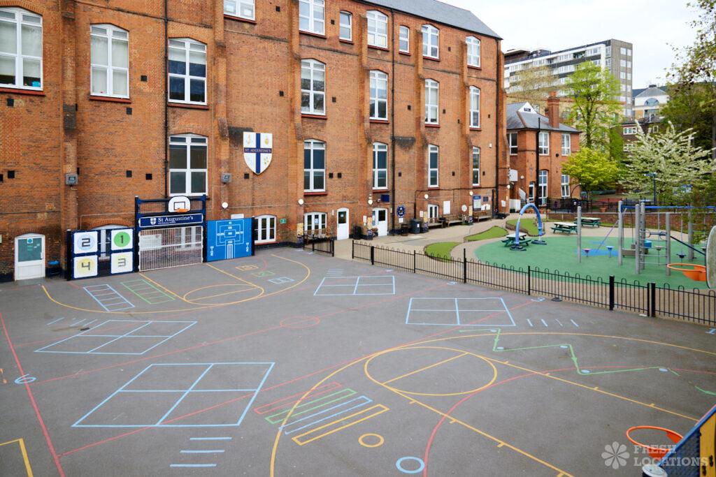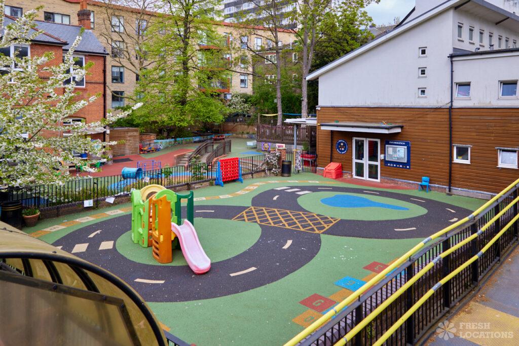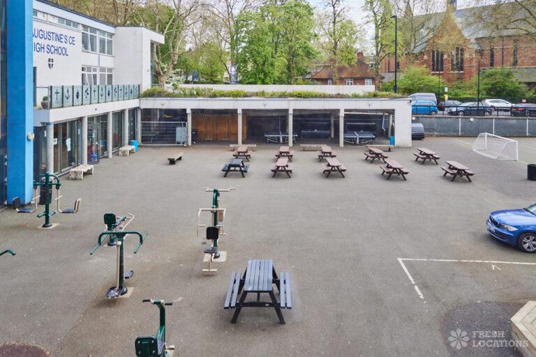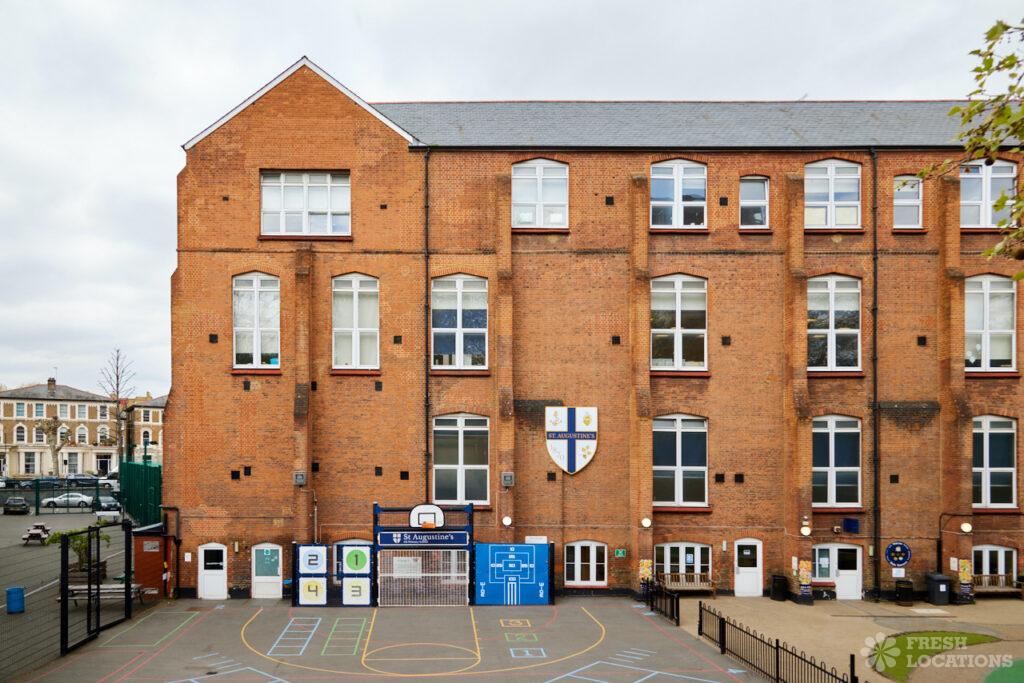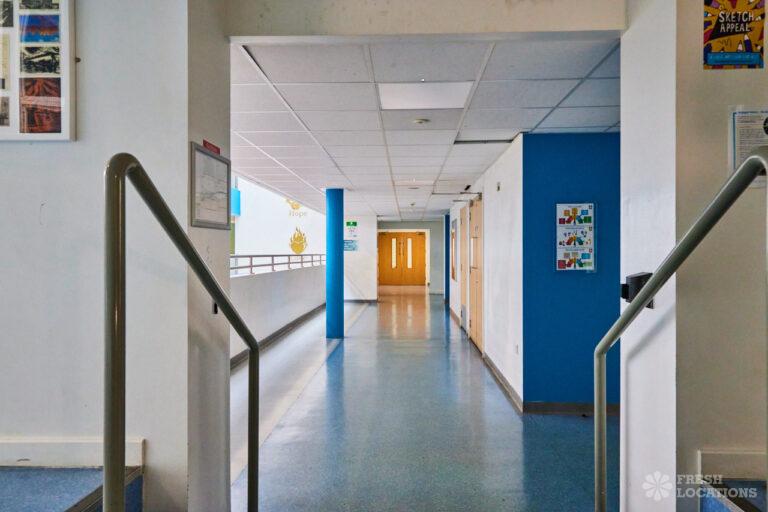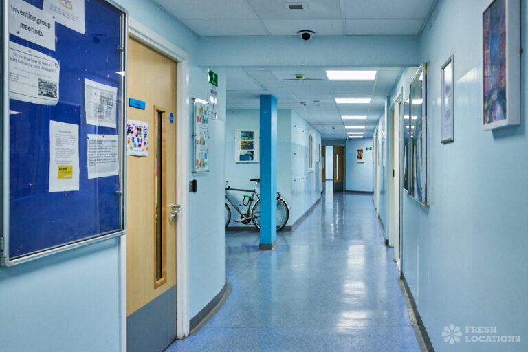 Large secondary school in North West London featuring multiple colourful classrooms, a spacious assembly hall and cafeteria as well as wide corridors and an outdoor gym. London Borough of Westminster.