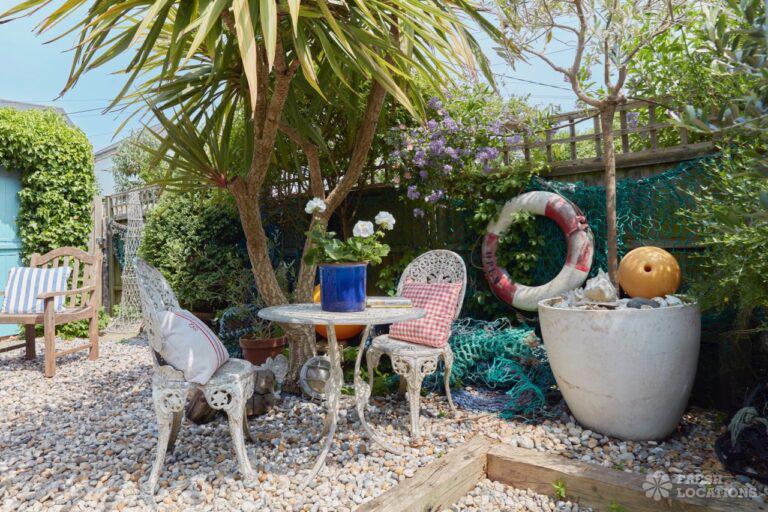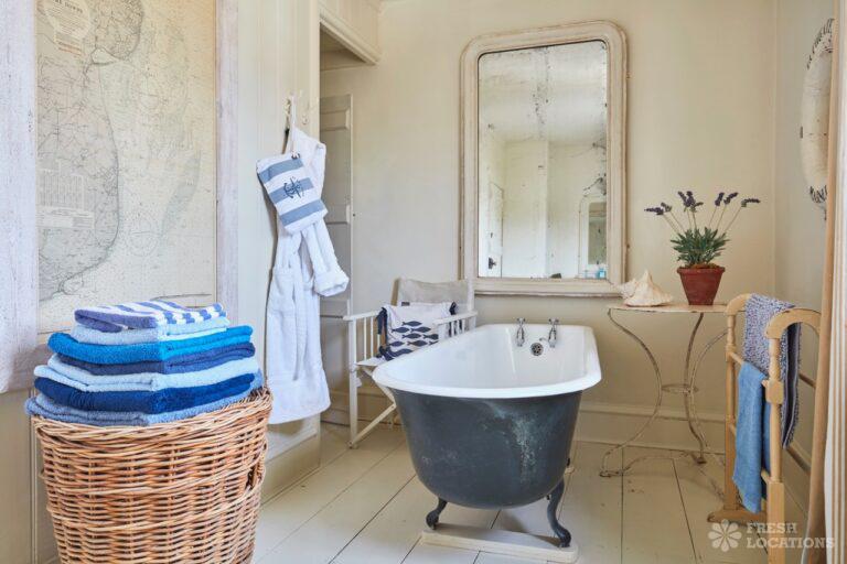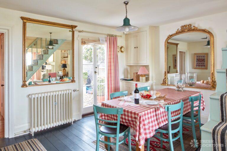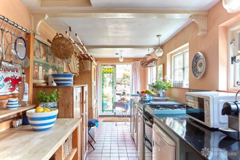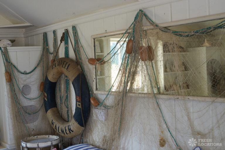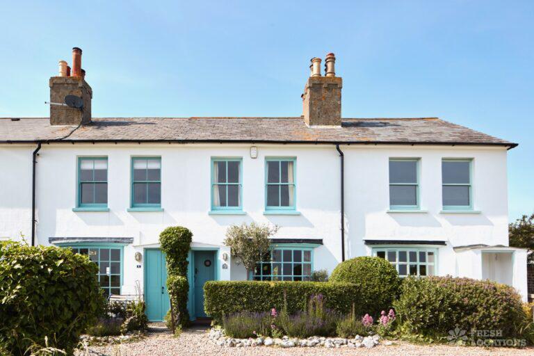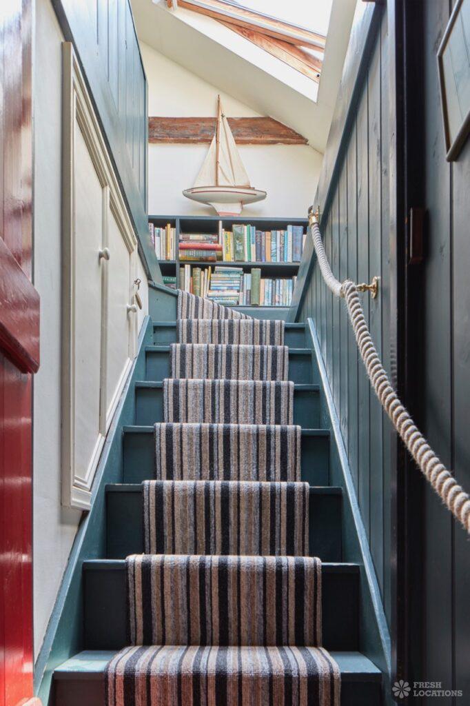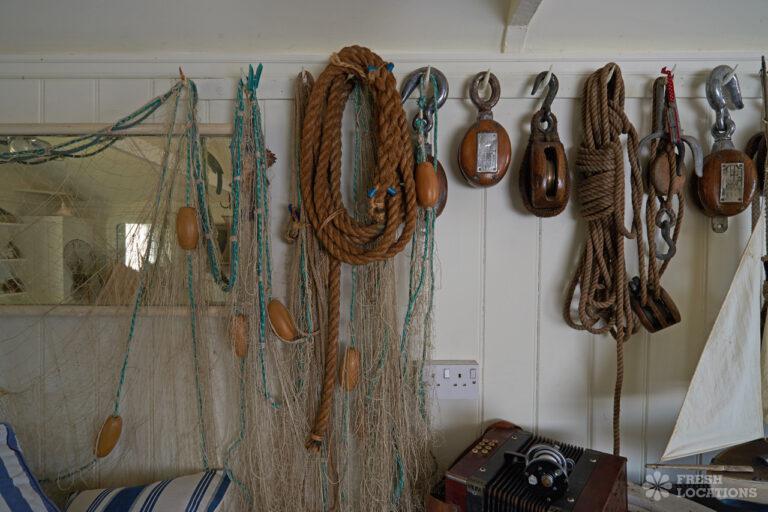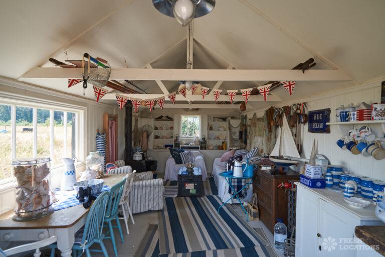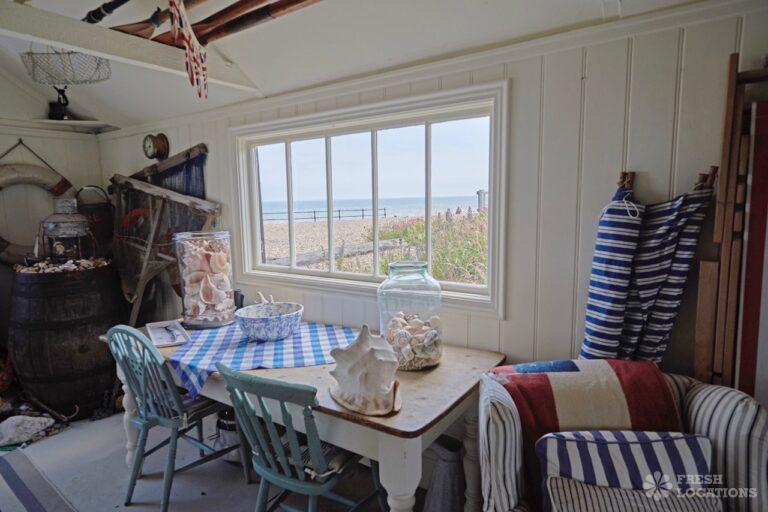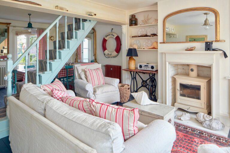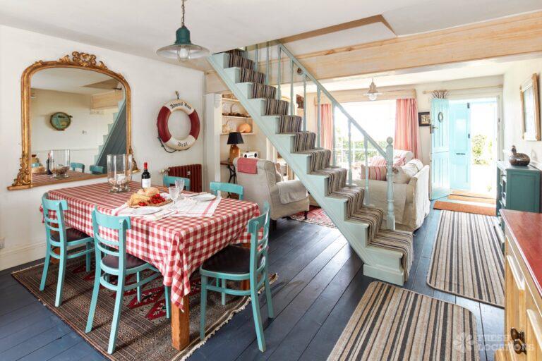 Wood Floors, Dark Wood Floor, Exposed Beams, Fireplace, Garden, Gas Hob, Light Wood Floor, Open Plan, Painted Floors, Staircase, Tiled FloorA cottage and a beach hut within a stone’s-throw of each other on the Kent coast. The hut is a former fisherman’s hut and decorated with old nets, ropes and life rings. The cottage space has an authentic rustic feel with an open plan living and dining area.