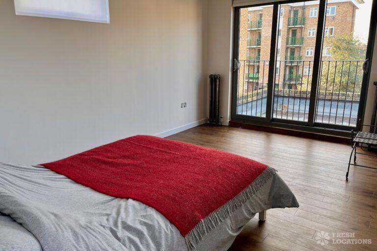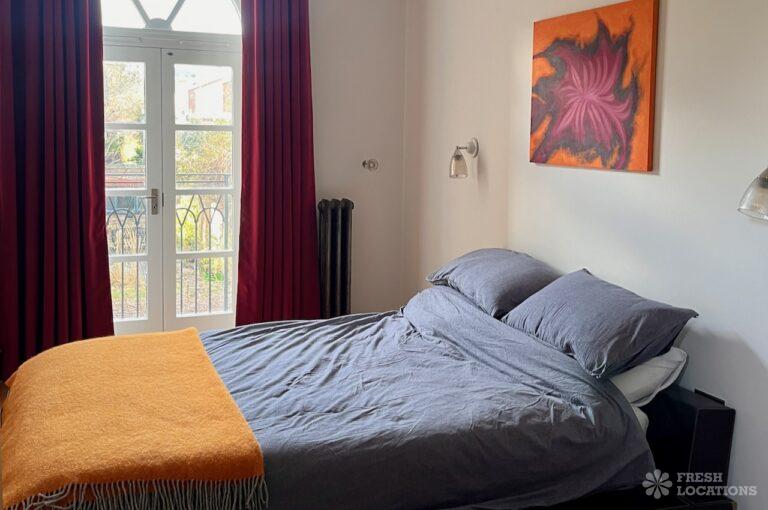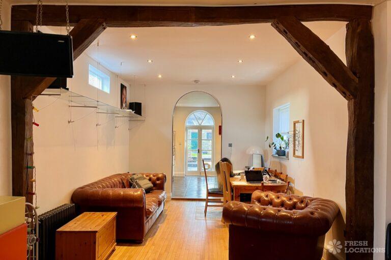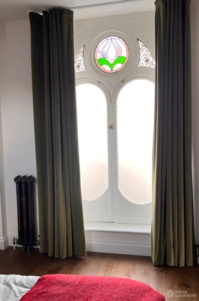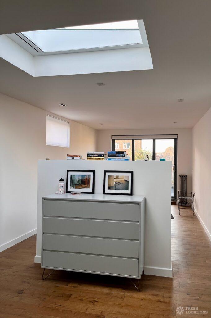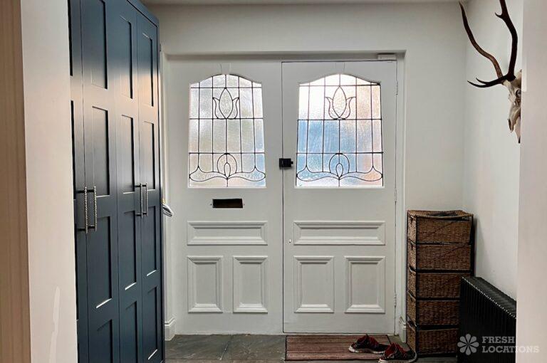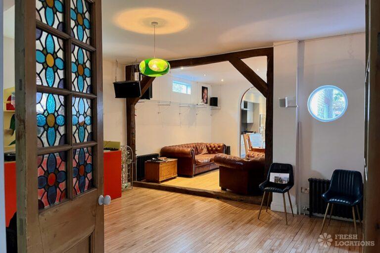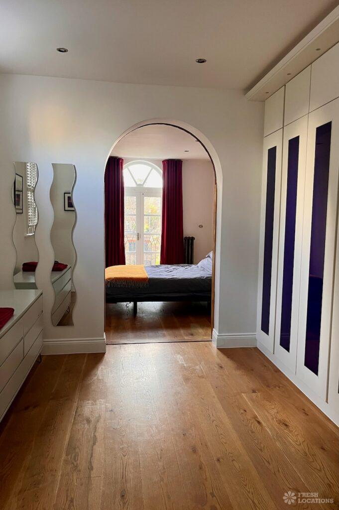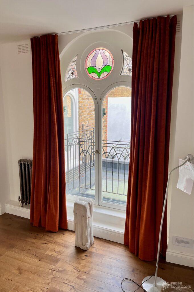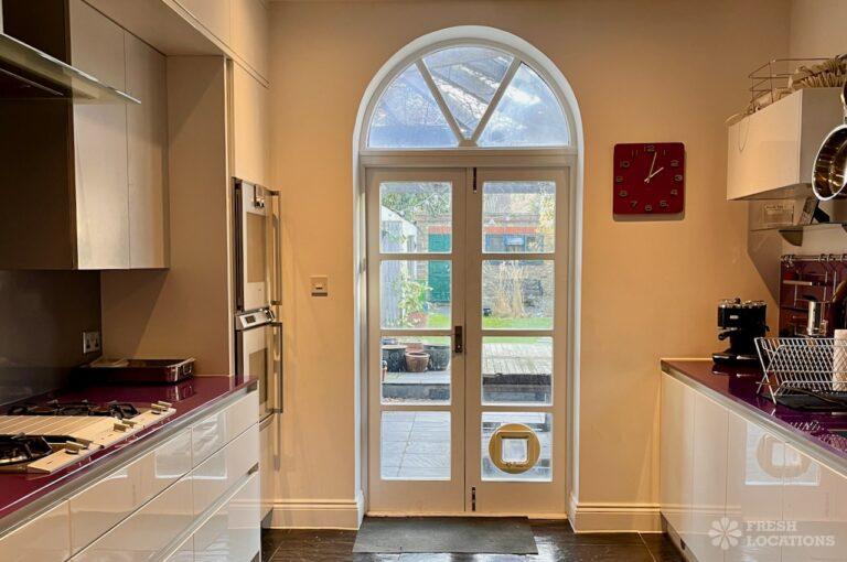A converted factory that has been renovated into a house shoot location in North London. This property features a light interior with exposed beams, stained glass doors and a modern purple kitchen. London Borough of Islington.