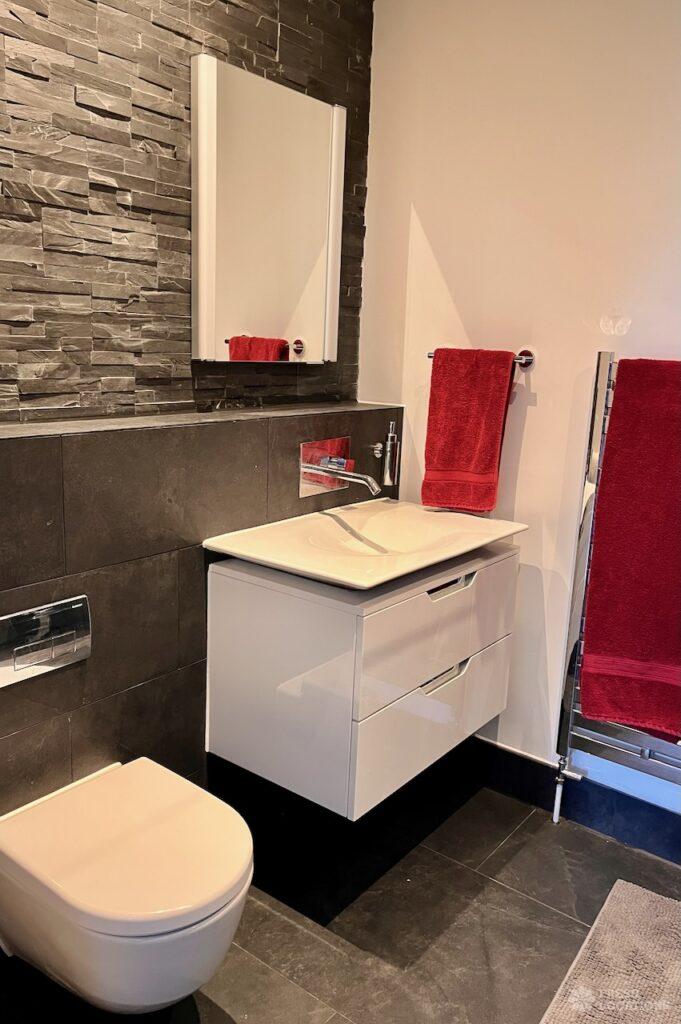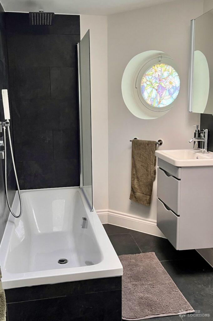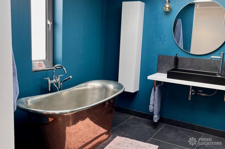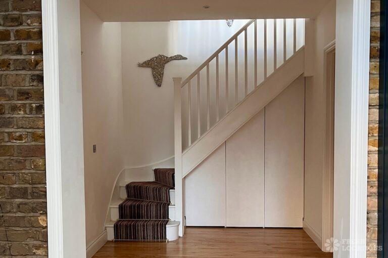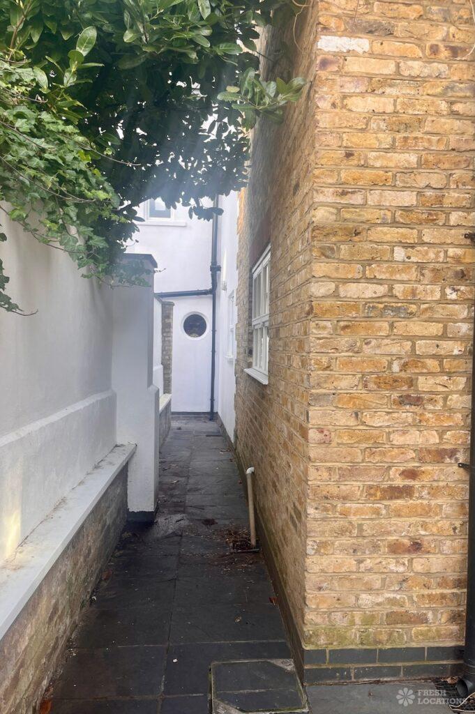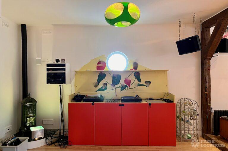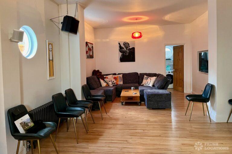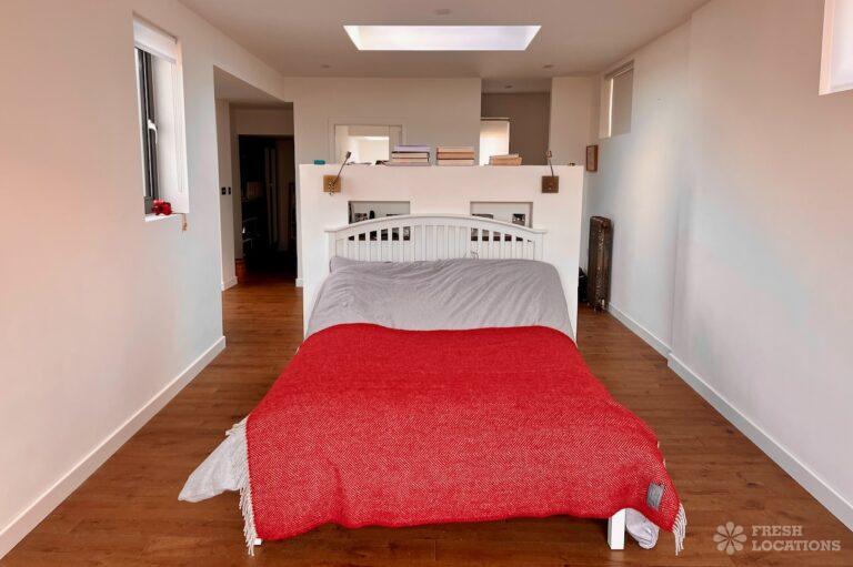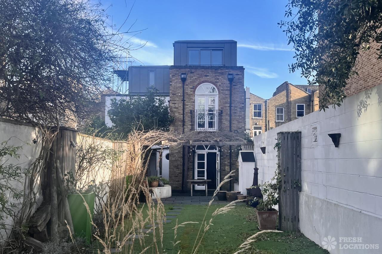 A converted factory that has been renovated into a house shoot location in North London. This property features a light interior with exposed beams, stained glass doors and a modern purple kitchen. London Borough of Islington.