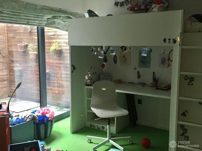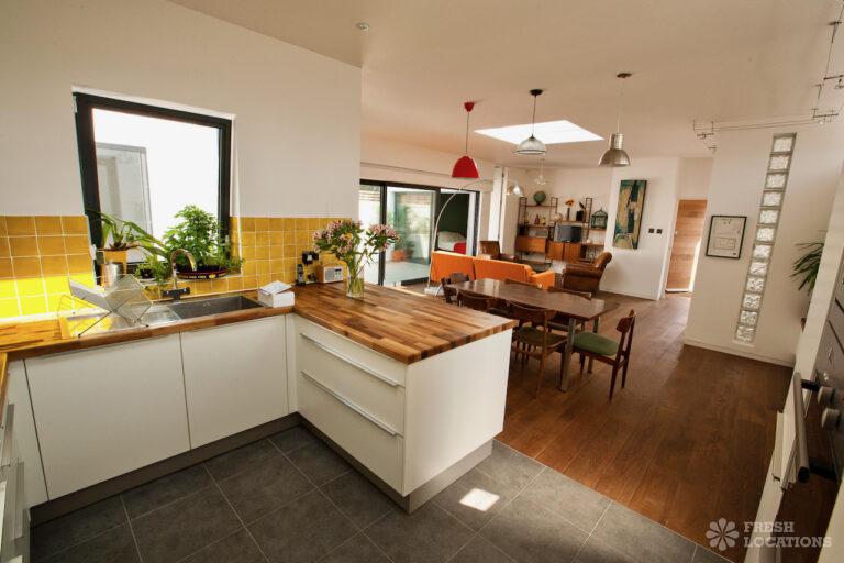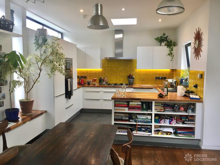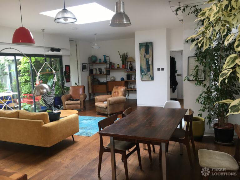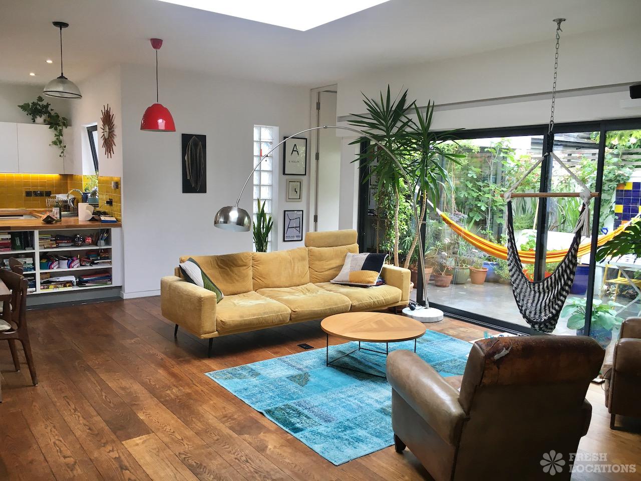 Modern family home shoot location in North London. Featuring open plan lounge, kitchen, diner, master bedroom and study built around a courtyard garden on ground floor. Wooden floors, sky lights and plenty of natural light throughout. London Borough of Haringey.