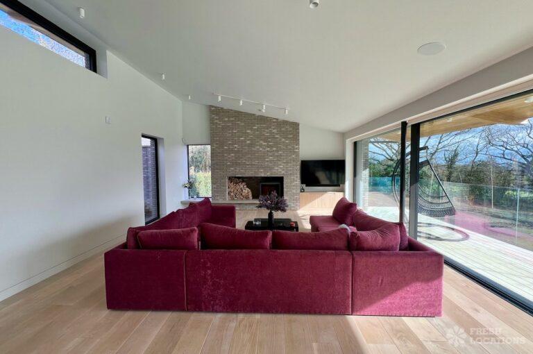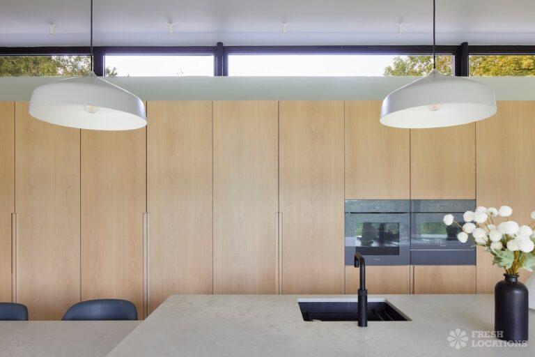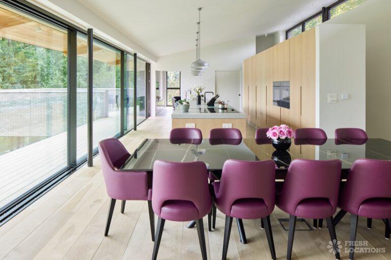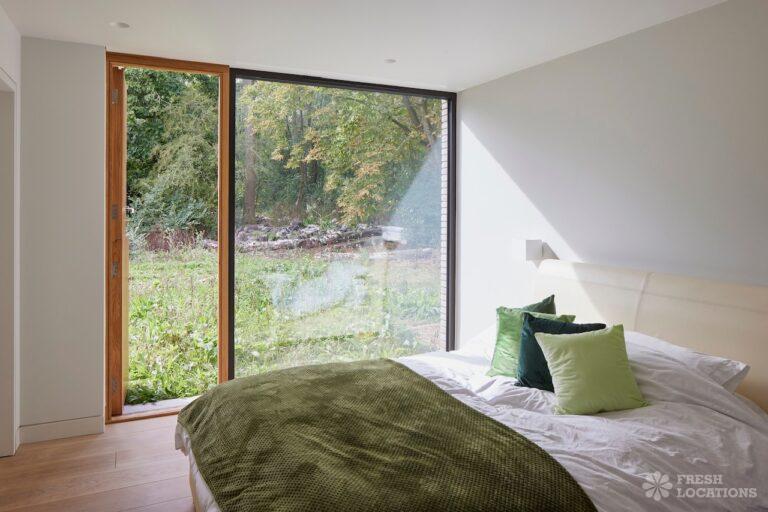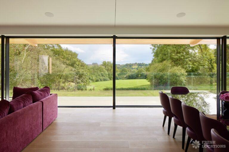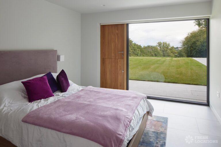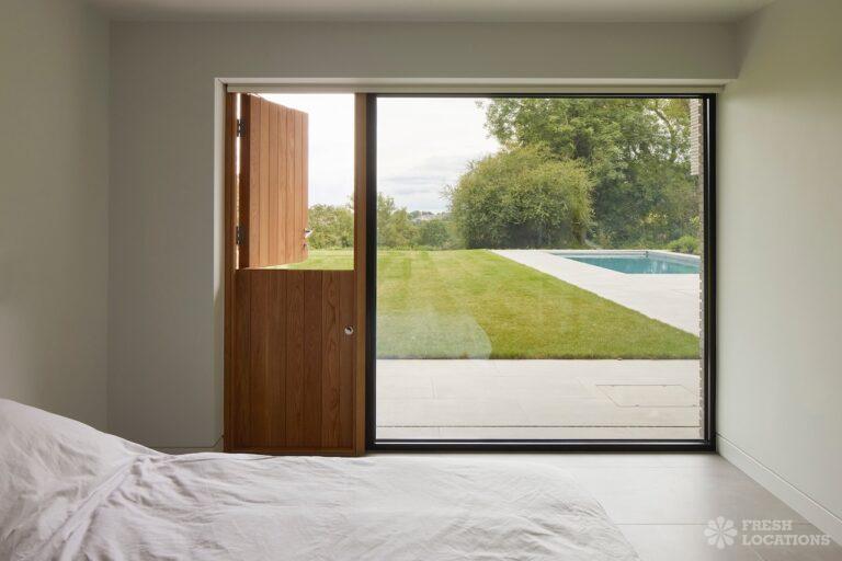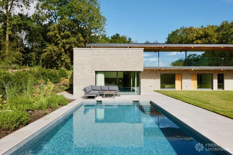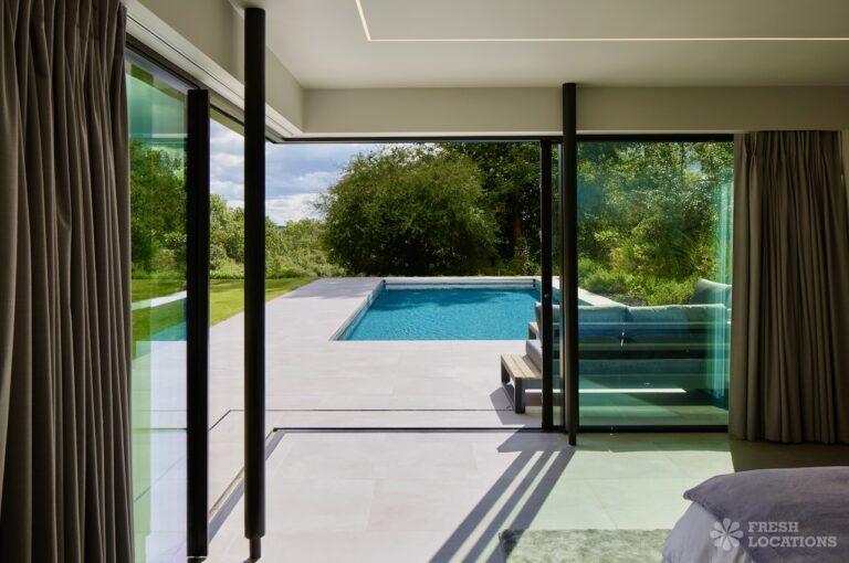 Balcony, Full Height Windows, Island Kitchen, Large Kitchen, Light Wood Floor, Open Plan, Wood FloorsA modern house shoot location in North London surrounded by lush greenery and features expansive floor-to-ceiling windows, a sleek open-plan kitchen and living area, and minimalist contemporary design. With a private pool, large terrace, manicured lawn, and south facing garden offers a seamless connection to nature. Spacious bedrooms with garden access and luxurious finishes throughout with large windows providing a bright, elegant, and versatile backdrop.