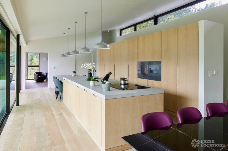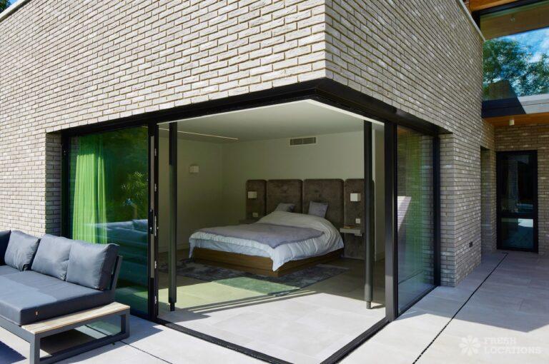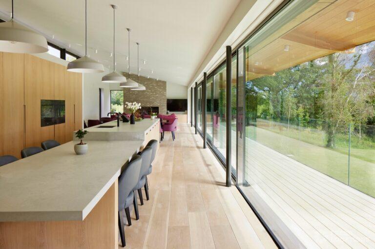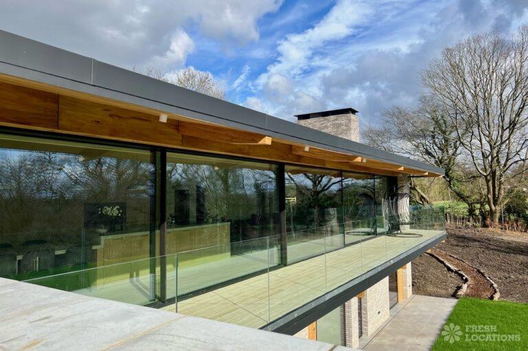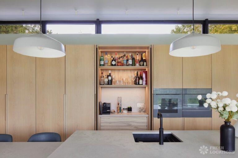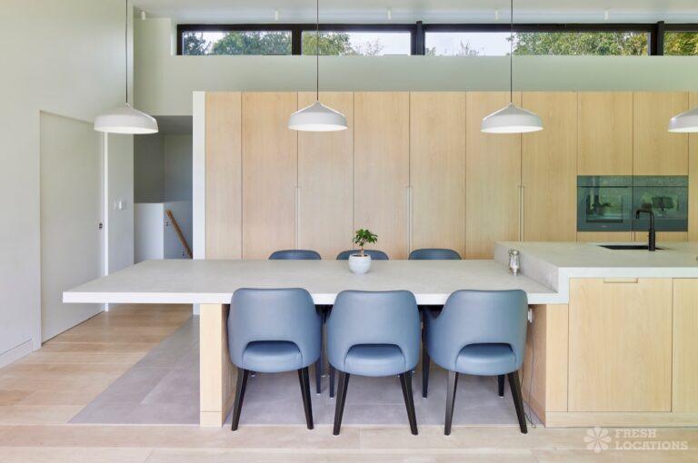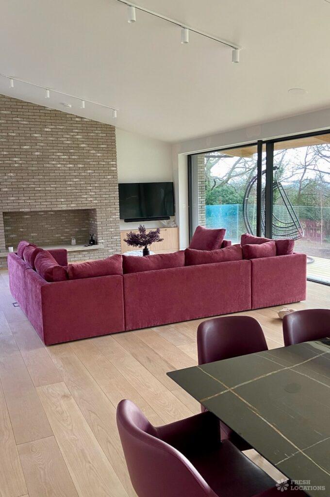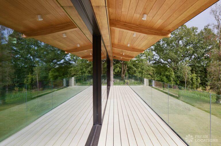 Balcony, Full Height Windows, Island Kitchen, Large Kitchen, Light Wood Floor, Open Plan, Wood FloorsA modern house shoot location in North London surrounded by lush greenery and features expansive floor-to-ceiling windows, a sleek open-plan kitchen and living area, and minimalist contemporary design. With a private pool, large terrace, manicured lawn, and south facing garden offers a seamless connection to nature. Spacious bedrooms with garden access and luxurious finishes throughout with large windows providing a bright, elegant, and versatile backdrop.
