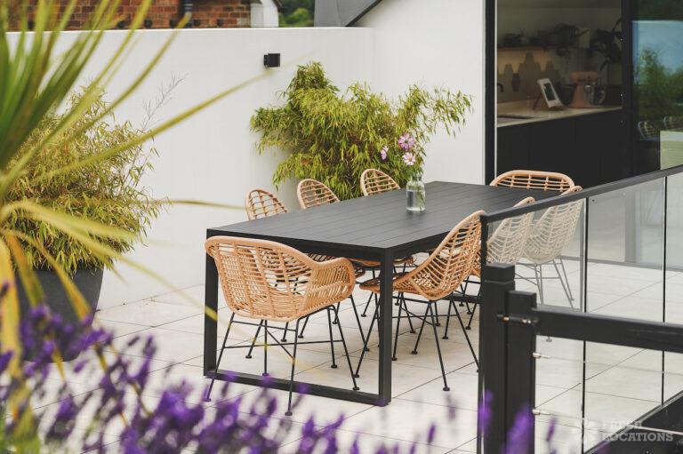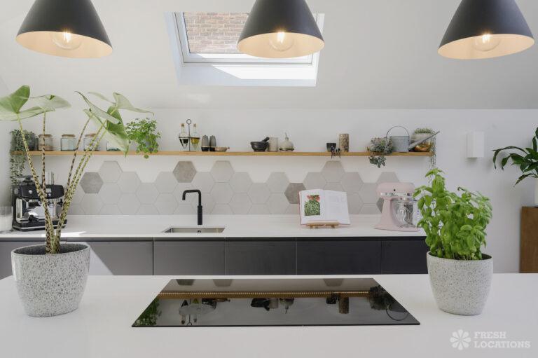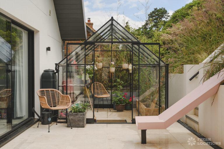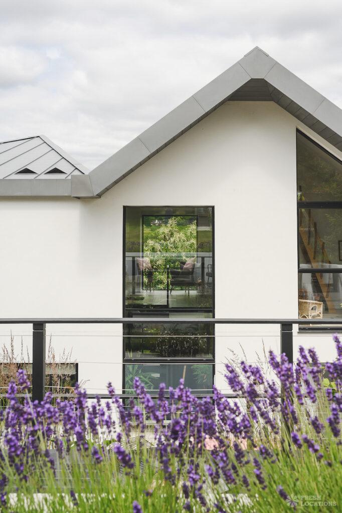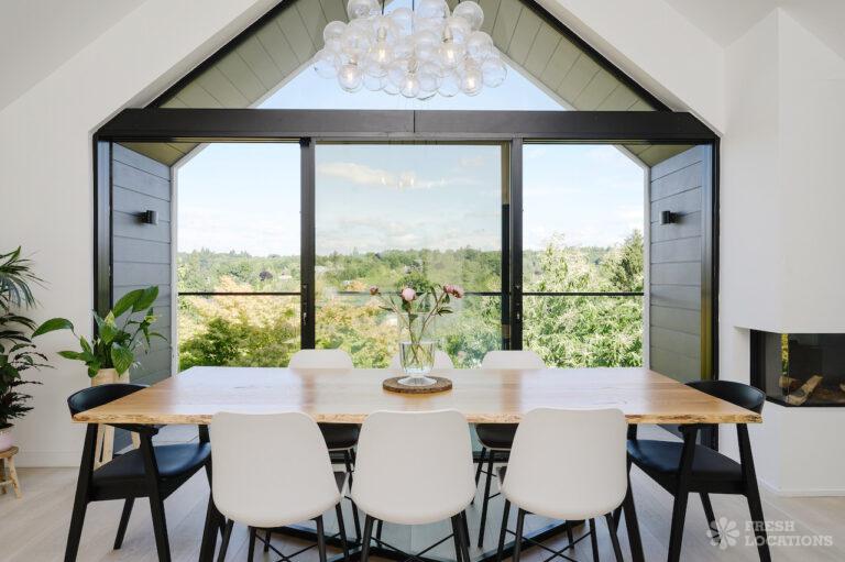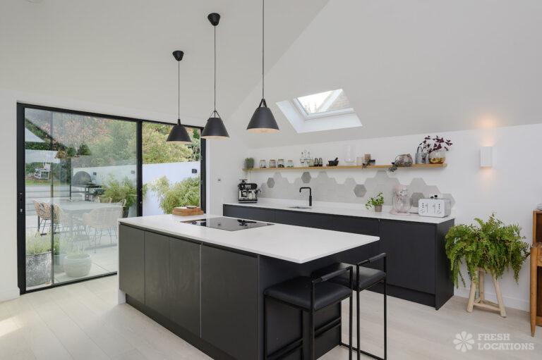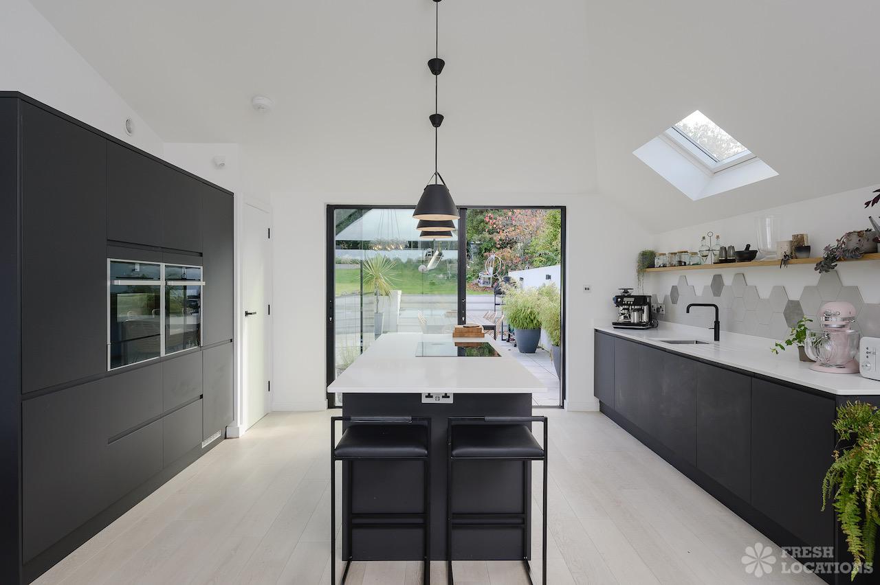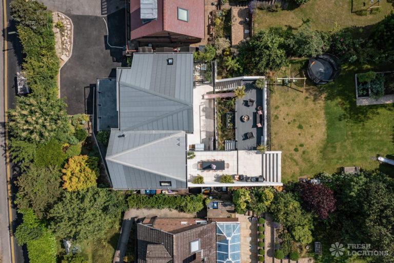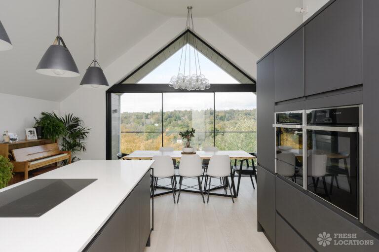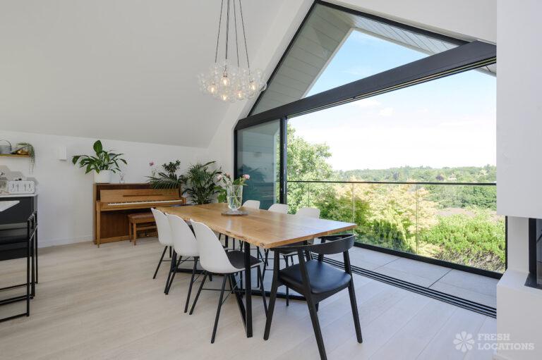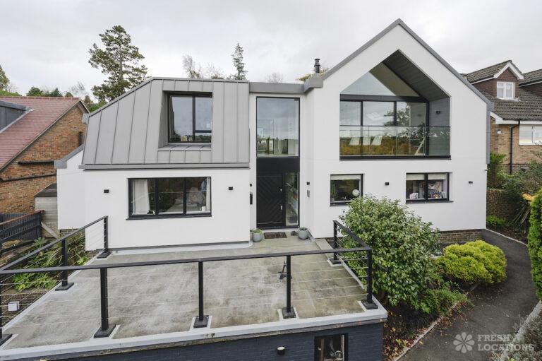 Wood Floors, Driveway, Fireplace, Full Height Windows, Garden, Island Cooker, Island Kitchen, Large Driveway, Light Wood Floor, Open Plan, Skylights, Staircase, Tiled Floor, Walk In ShowerContemporary shoot location house in Surrey. This architecturally designed upside-down home features high ceilings, an open plan kitchen/dining area, full height windows, a landscaped garden with a pond, separate decked areas and fantastic forest views.