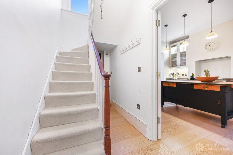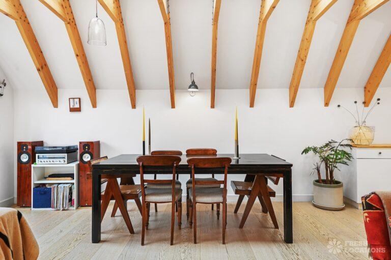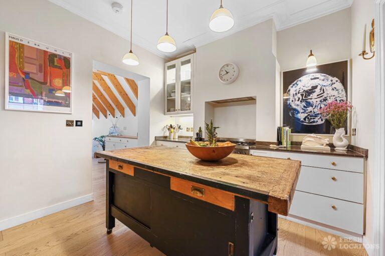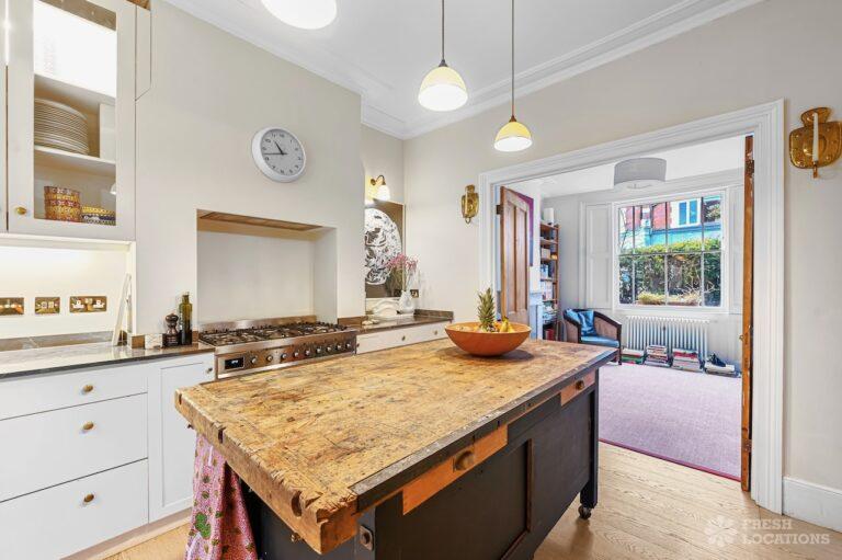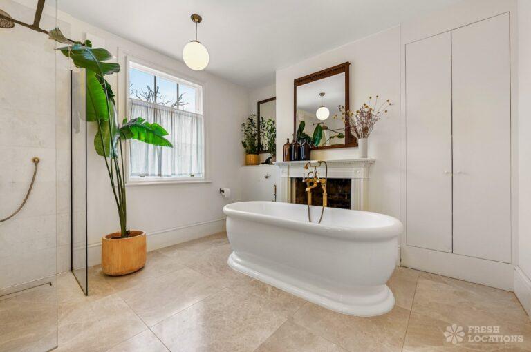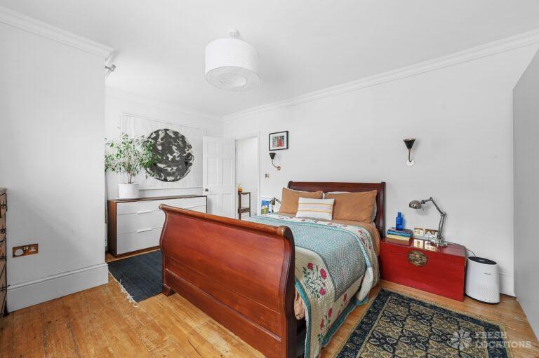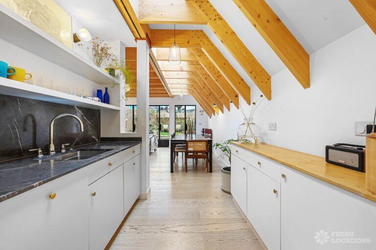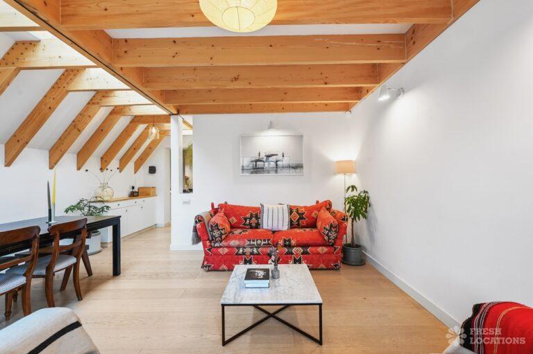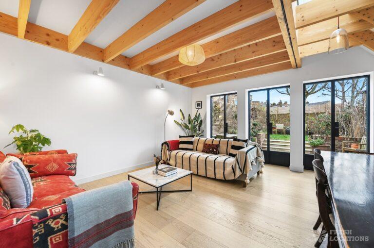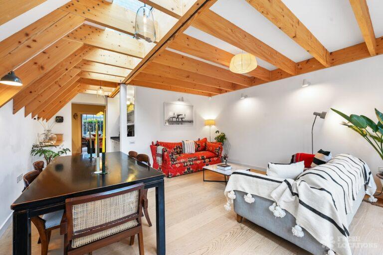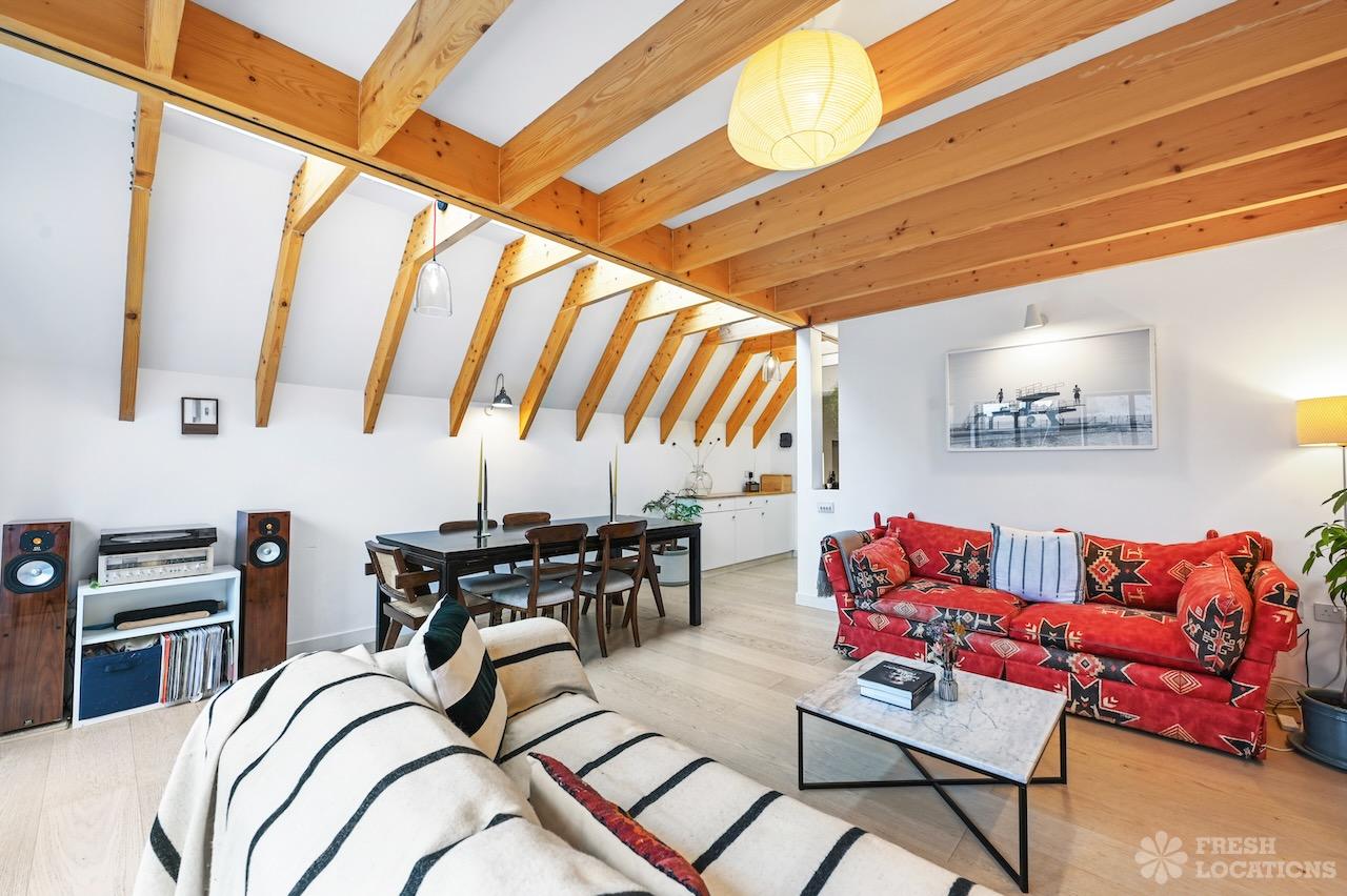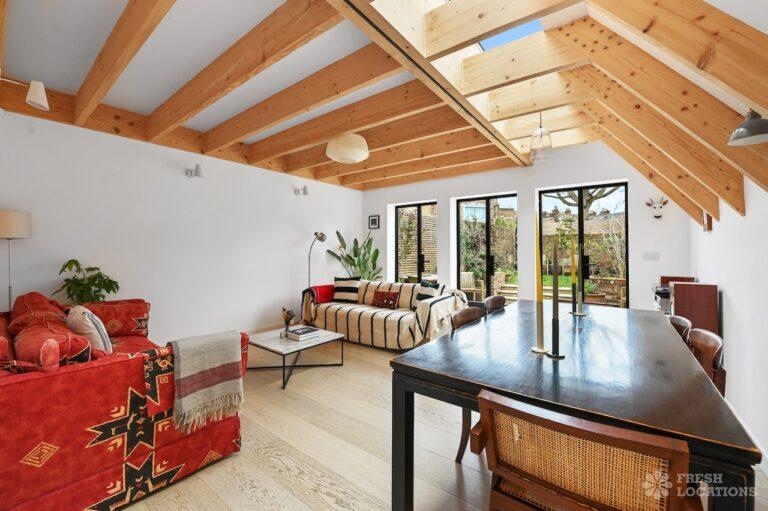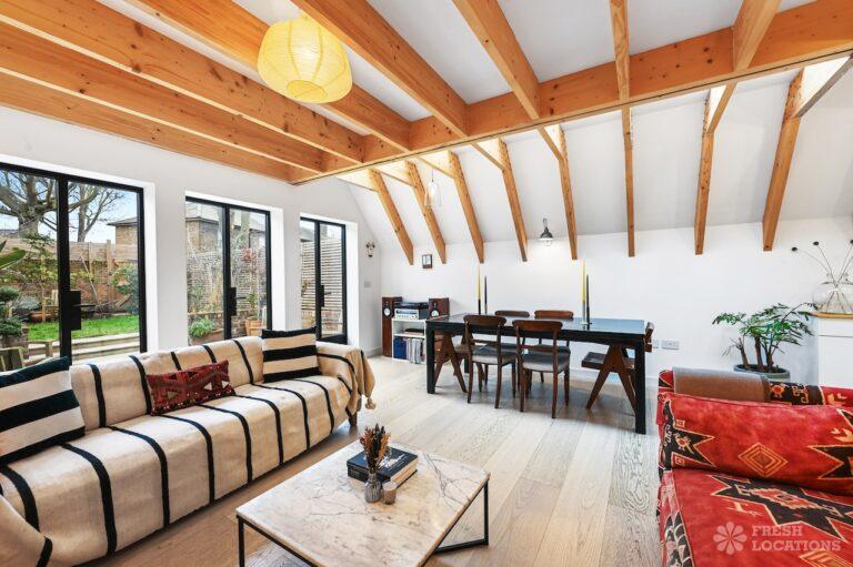Exposed Beams, Fireplace, Garden, Large Bathroom, Light Wood Floor, Multiple Bathrooms, Staircase, Walk In Shower, Wood FloorsA late Georgian house with a modern extension in North London. This unique shoot location offers a blend of rustic charm and modern elegance, featuring exposed wooden beams, eclectic furnishings, and an abundance of natural light. The open-plan living and dining area boasts a striking vaulted ceiling with warm timber details, while the stylish bathroom pairs vintage touches with contemporary finishes. A characterful bedroom with rich wooden floors and carefully curated decor completes the space, making it an ideal backdrop for lifestyle, fashion, and interior shoots. London Borough of Haringey.
