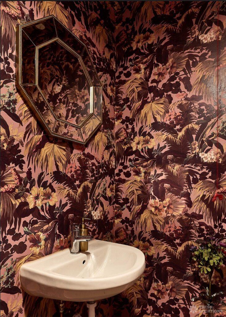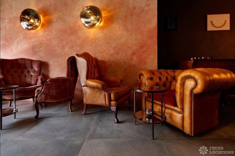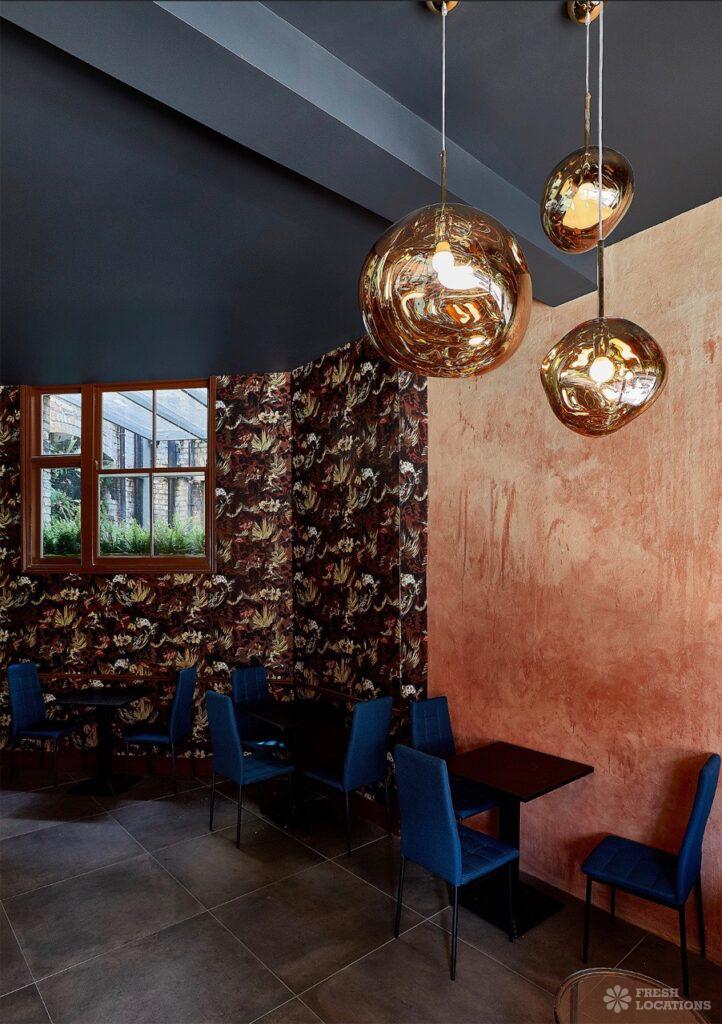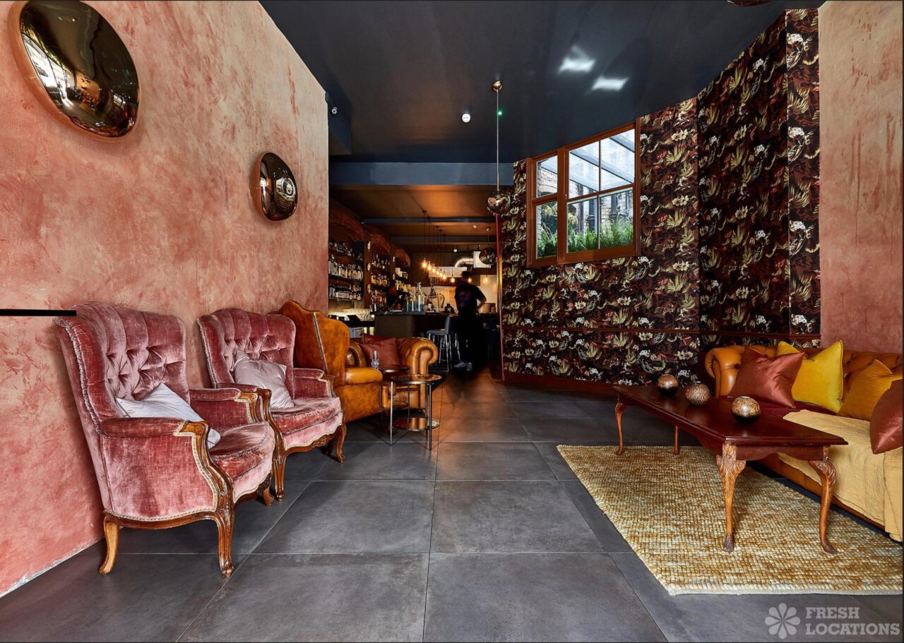 Trendy venue with a cosy seating area and bar in North London. Bar has an industrial feel with dark colours and exposed brick walls. Features include exposed plaster walls, retro wallpaper and tiled concrete flooring. London Borough of Haringey.