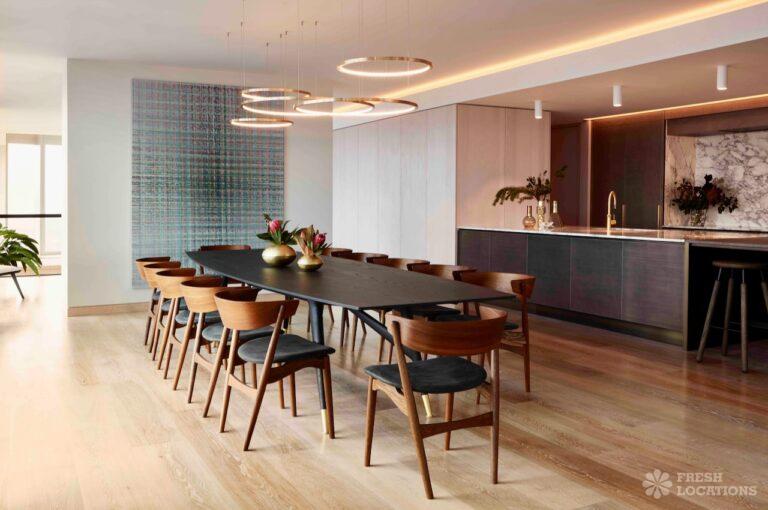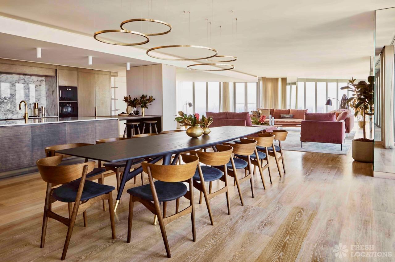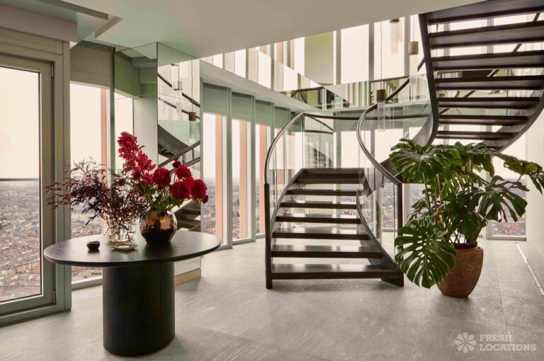 Sleek Penthouse shoot location in East London, with surrounding city views. This open plan shoot space features a large dining area, living room and kitchen, upstairs there are two bedrooms and one bathroom. London Borough of Newham.