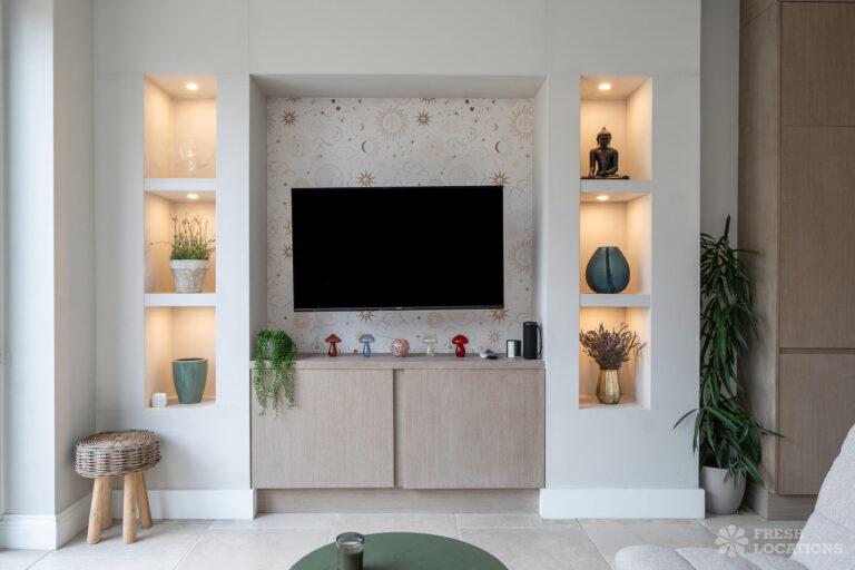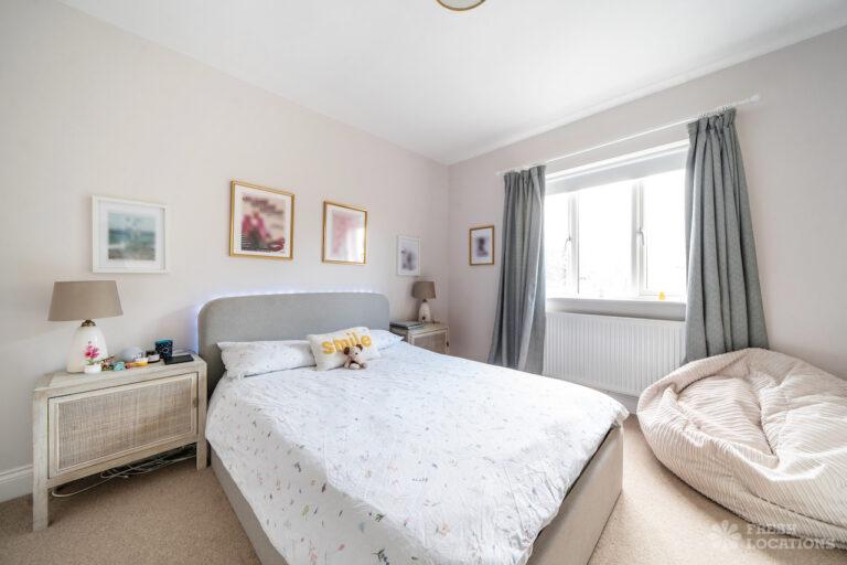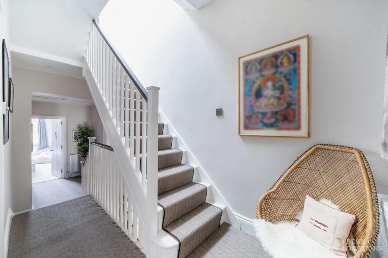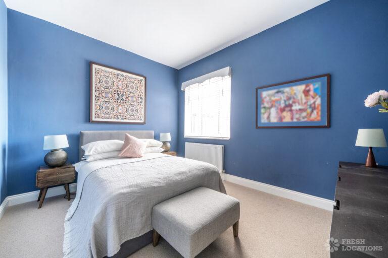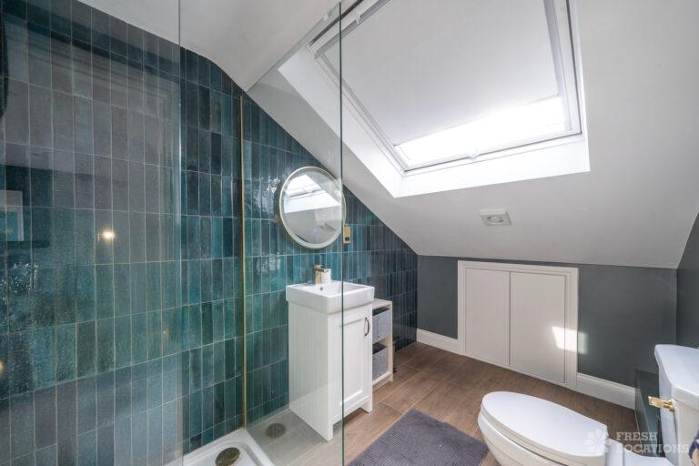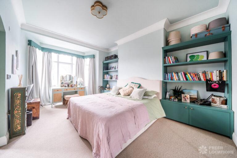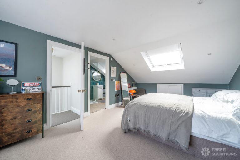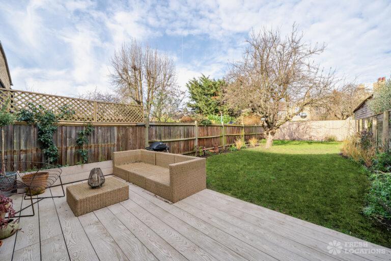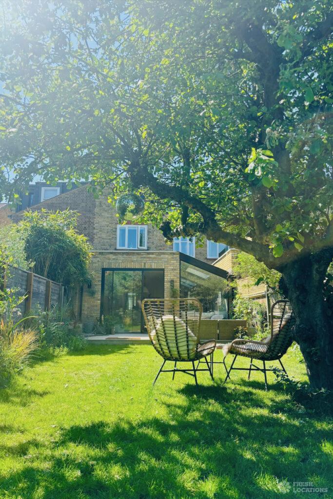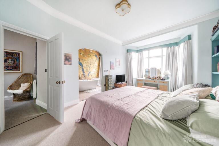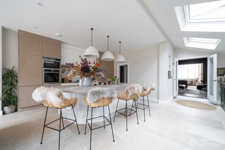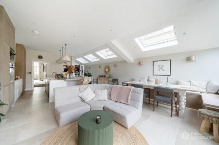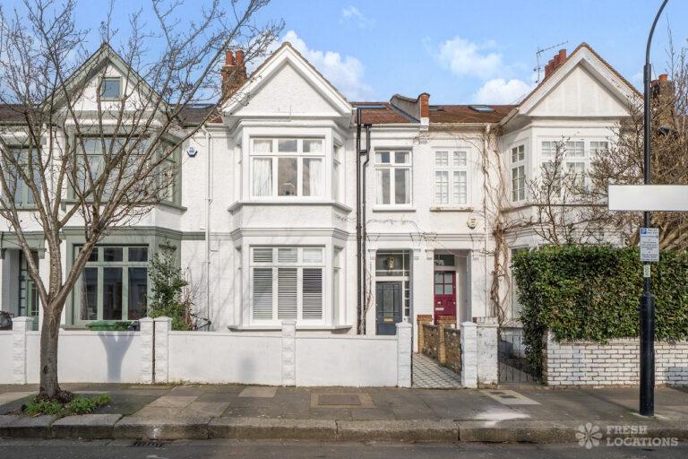 Bay Window, Dark Wood Floor, Ensuite, Fireplace, Full Height Windows, Garden, Island Kitchen, Multiple Bathrooms, Multiple Bedrooms, Parquet Floor, Skylights, Staircase, Walk In Shower, Wood FloorsA beautifully renovated 1950s house shoot location in West London, offering approximately 3,000 sq ft of light-filled interiors. This spacious shoot location features four double bedrooms and a 30ft x 20ft garden. The open-plan kitchen/diner includes a limestone floor, a large feature window with built-in window seat, and sliding doors to the garden. Key design highlights include a Scandinavian-style fireplace with a cement bench and log burner, original parquet flooring in the double reception rooms, and bold Cordonne peacock wallpaper in the main bedroom’s ensuite. A stylish and versatile setting with a mix of vintage charm and contemporary flair. London Borough of Hammersmith and Fulham.