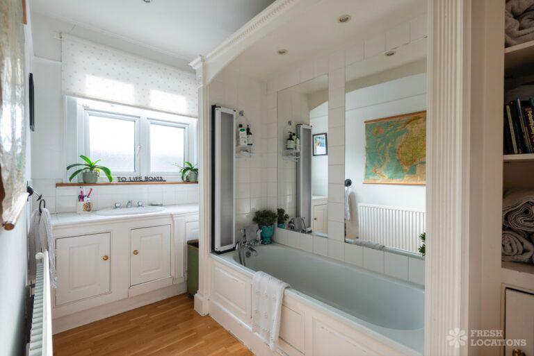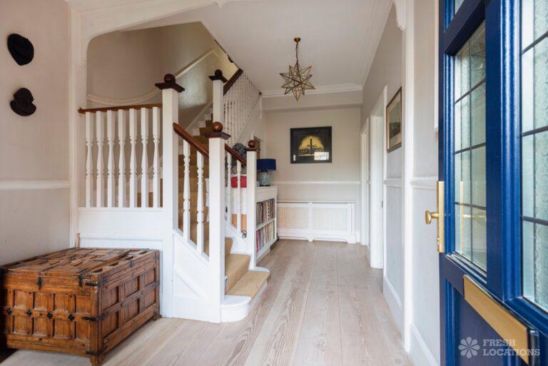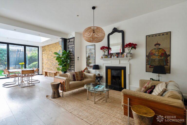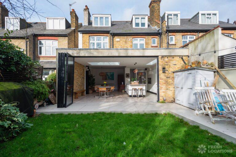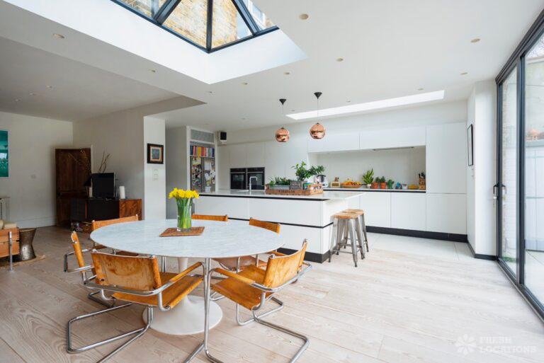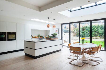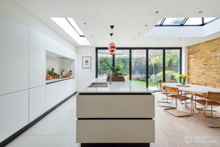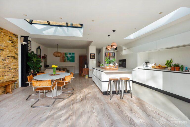Wood Floors, Bay Window, Exposed Brick, Fireplace, Full Height Windows, Garden, Island Kitchen, Large Kitchen, Light Wood Floor, Open Plan, Panelling, Skylights, Staircase, Tiled Floor, Unrestricted Parking, Walk In Shower, White KitchenThis family home Lambeth has versatile living areas. It has a light, open plan kitchen/diner which opens out to a garden. The reception room has muted tones and paneled walls. 5 bedrooms including children’s. London Borough of Lambeth.