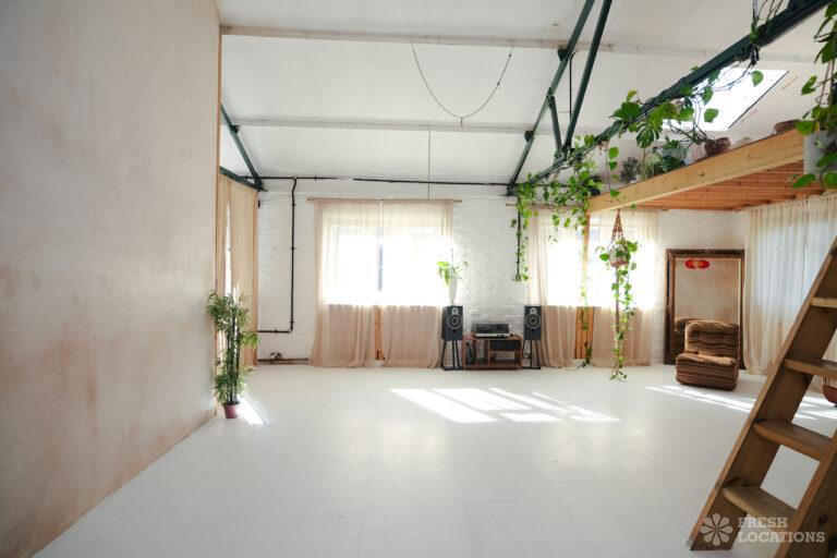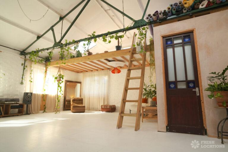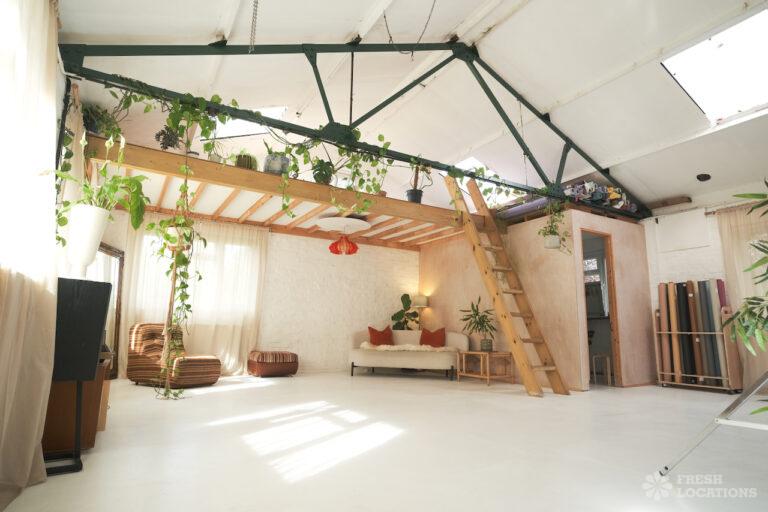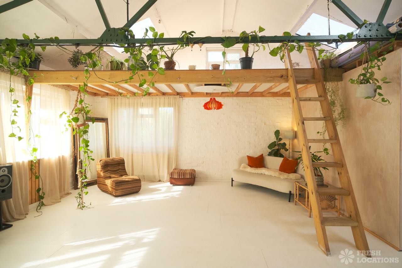 A 900 sqft dayligh studio shoot location, featuring a spacious, open-plan interior with high ceilings and abundant natural light streaming through skylights and large windows. The space combines industrial charm, with exposed beams and whitewashed brick walls, and warm, rustic elements such as wooden mezzanines and natural finishes. Minimalist decor with a mix of modern and vintage furnishings, lush greenery, and earthy tones. The layout includes cozy nooks with soft lighting and textured accents.