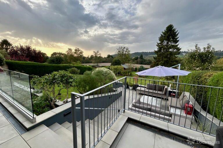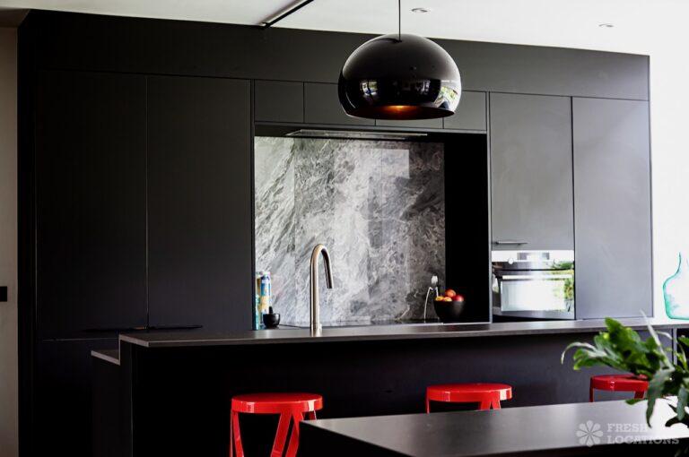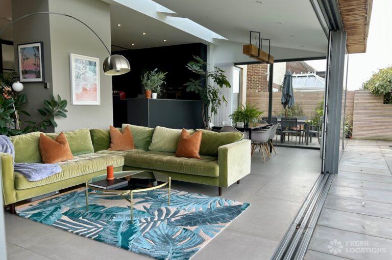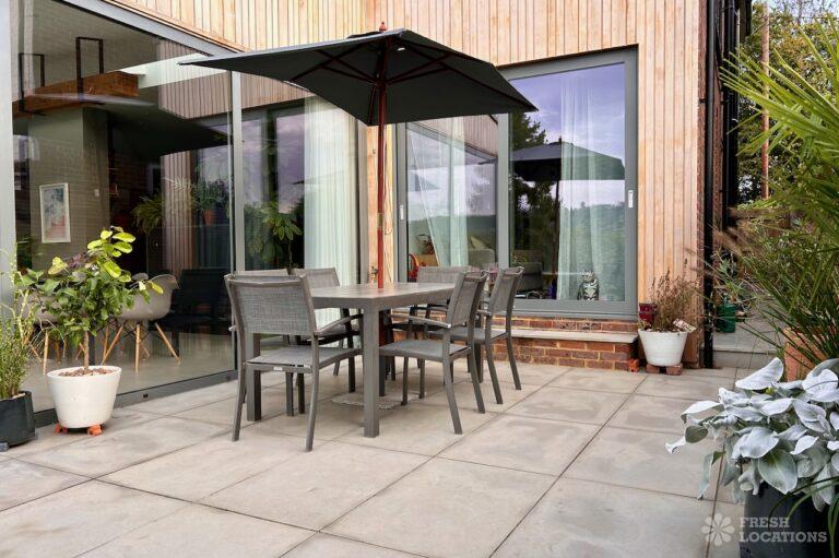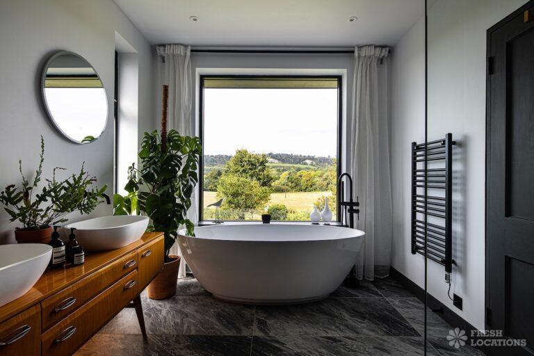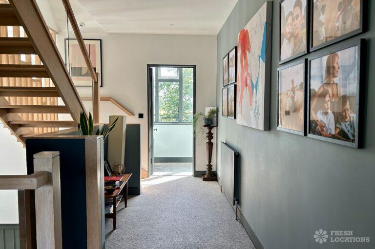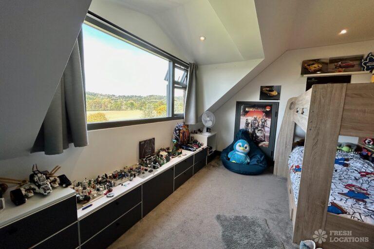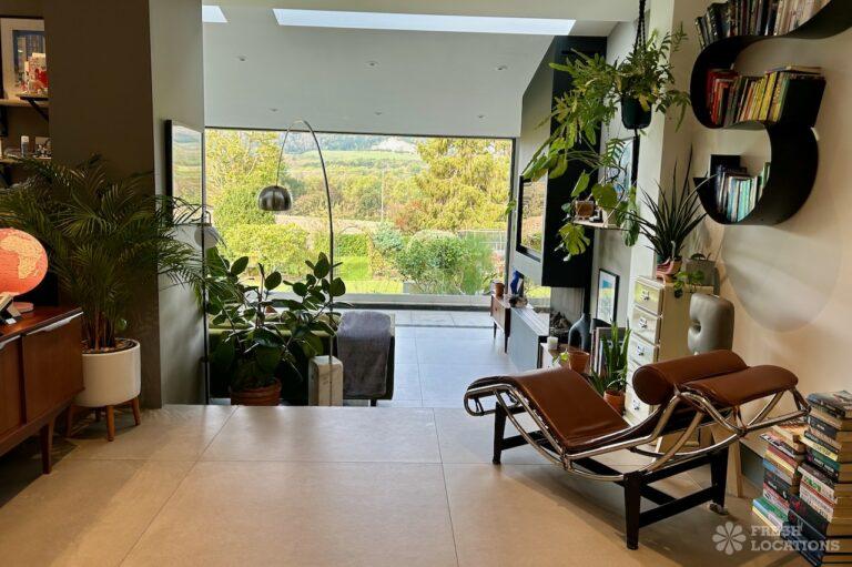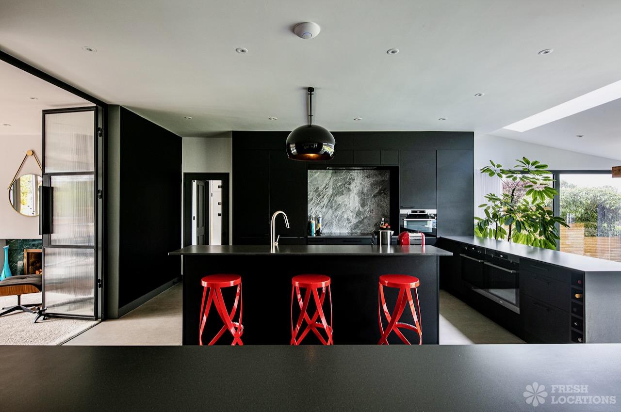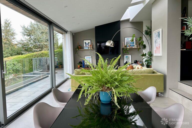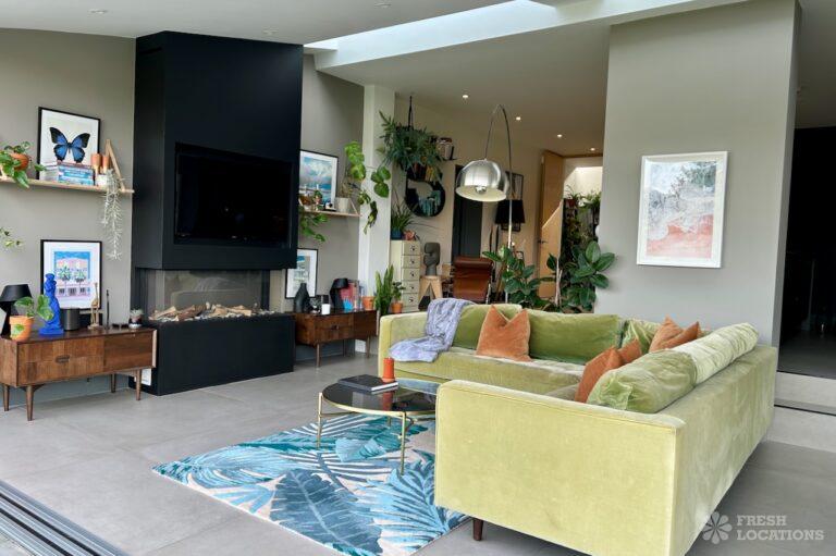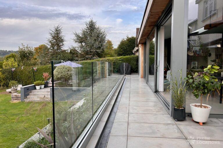 Island Kitchen, Driveway, Fireplace, Full Height Windows, Home Gym, Home Office, Large Bathroom, Multiple Bathrooms, Open Staircase, Walk In ShowerA Detatched house in Surrey close to the M25 with stunning views over the Surrey Hills. This shoot location features a modern matte black kitchen with an island and two attached living areas. Outside there is a large garden with patio areas.