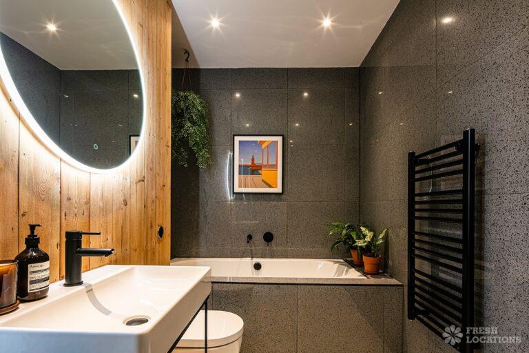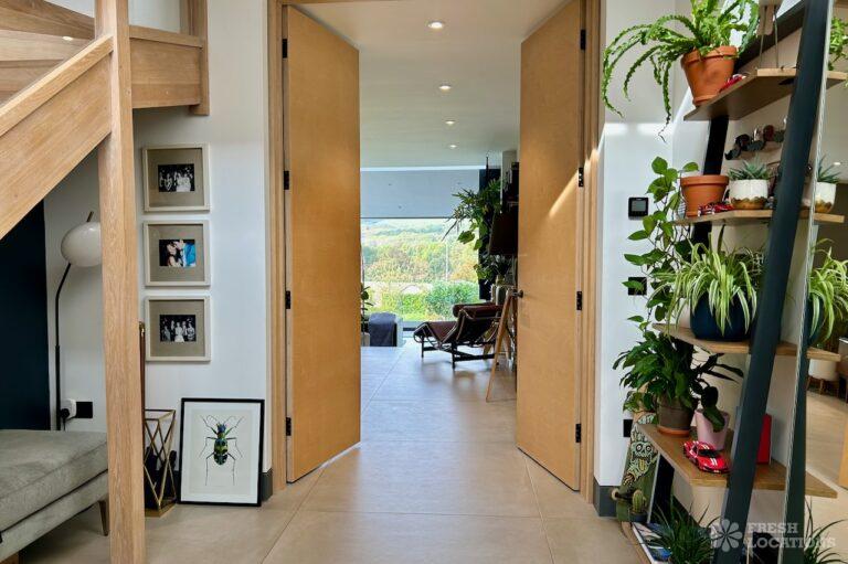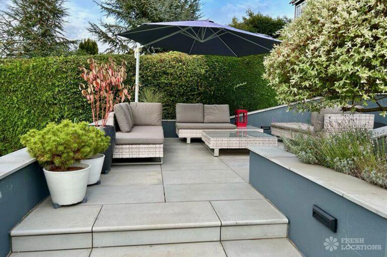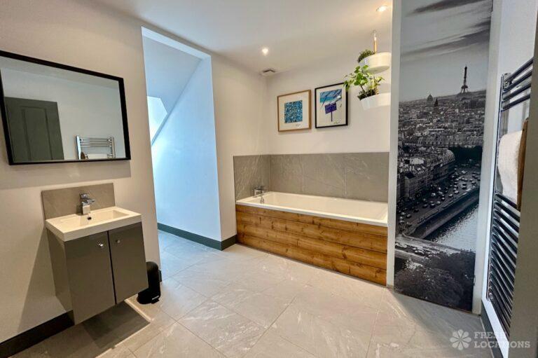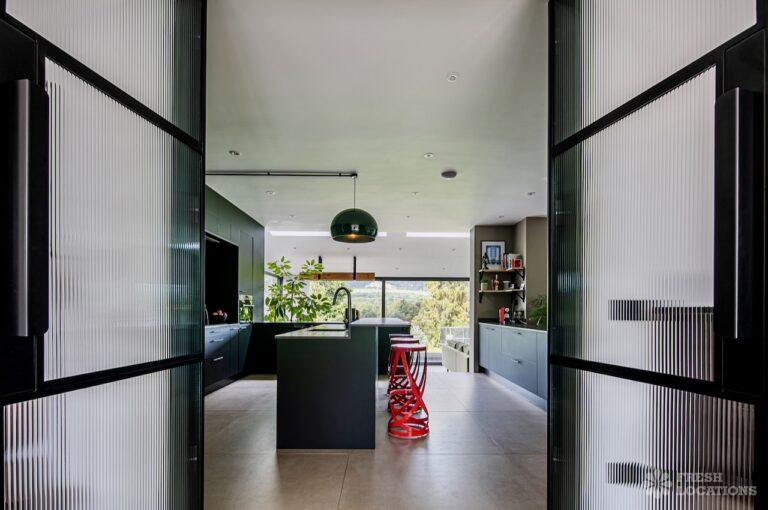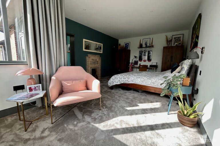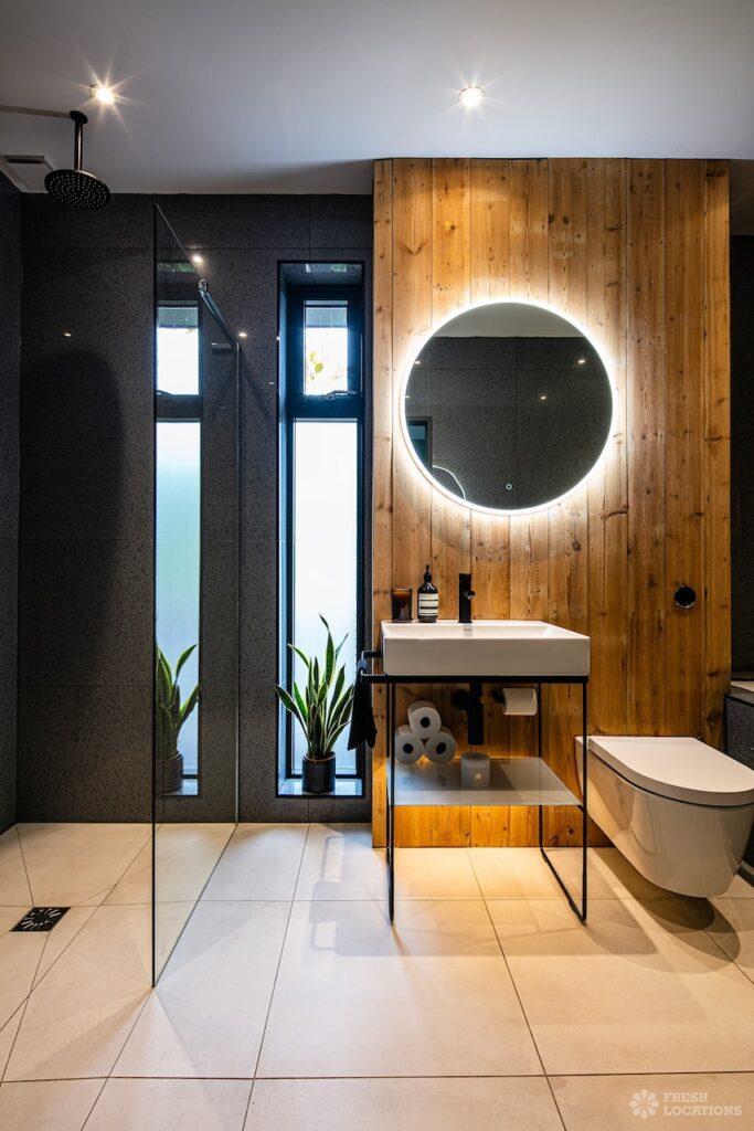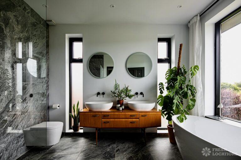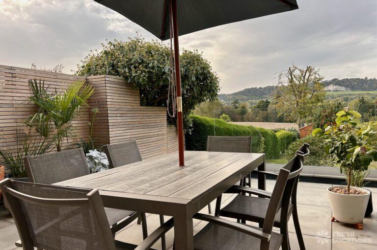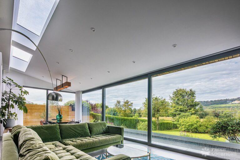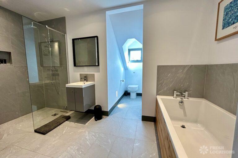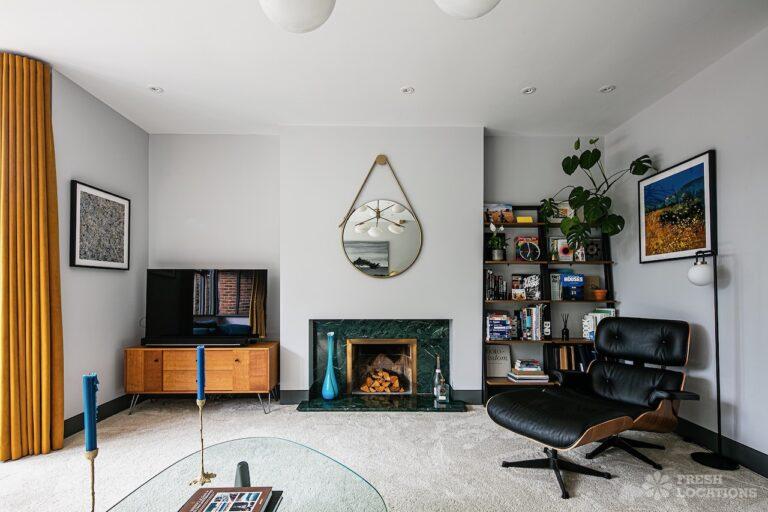 Island Kitchen, Driveway, Fireplace, Full Height Windows, Home Gym, Home Office, Large Bathroom, Multiple Bathrooms, Open Staircase, Walk In ShowerA Detatched house in Surrey close to the M25 with stunning views over the Surrey Hills. This shoot location features a modern matte black kitchen with an island and two attached living areas. Outside there is a large garden with patio areas.
