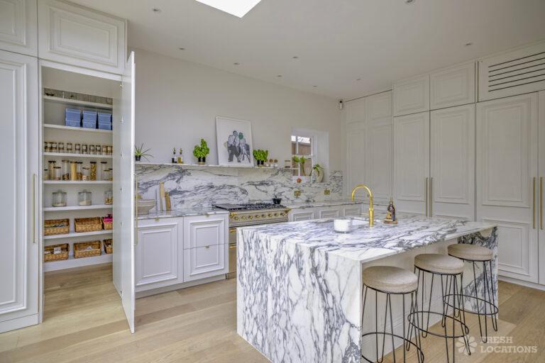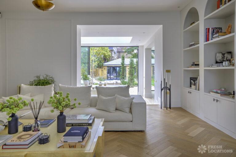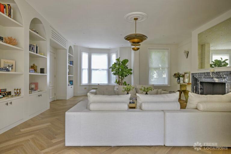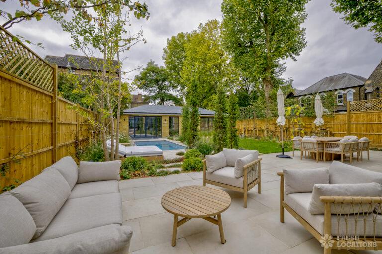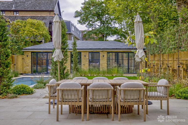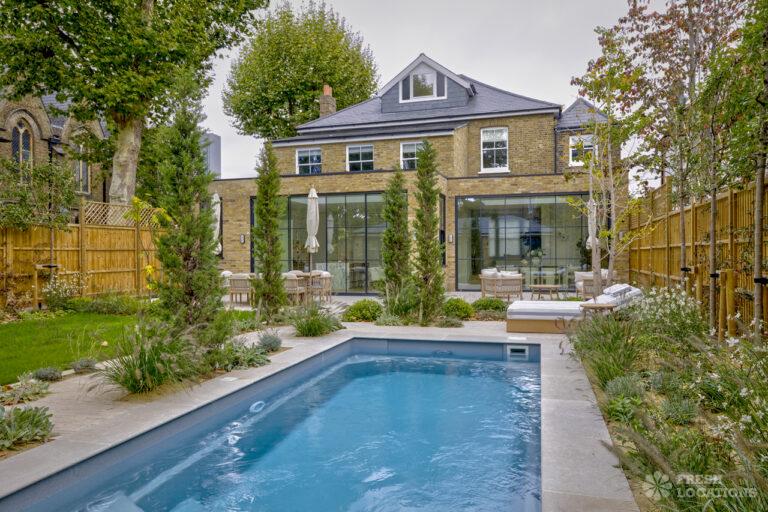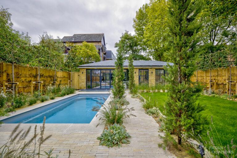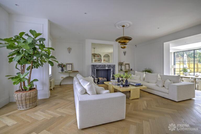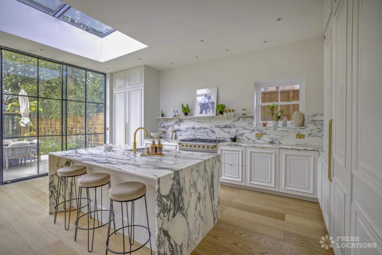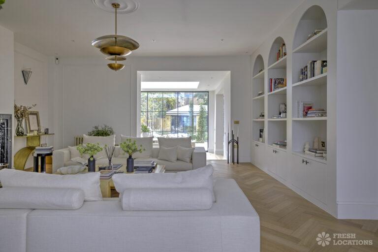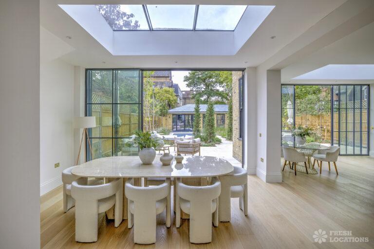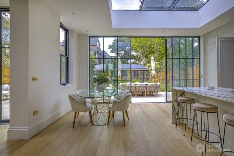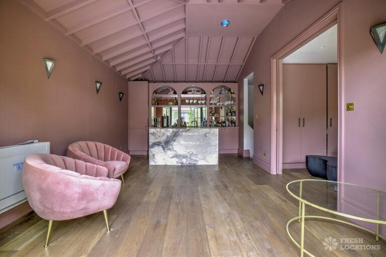Crittall, Ensuite, Home bar, Island Kitchen, Large Kitchen, Light Wood Floor, Multiple Bathrooms, Parquet Floor, Staircase, Swimming Pool, Tiled Floor, Walk In Shower, Walk In Wardrobe, Wood FloorsA double-fronted detached house located in the London borough of Hounslow, featuring five bedrooms and bathrooms, a beautiful island kitchen with marble countertops, and elegant light filled interiors throughout. The property also boasts a large garden with a swimming pool, offering a luxurious and versatile setting for shoots.